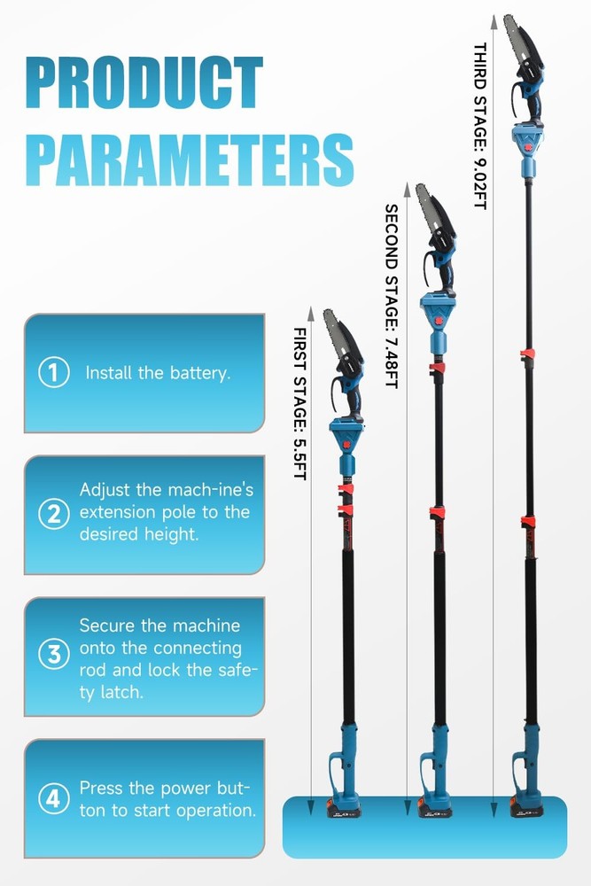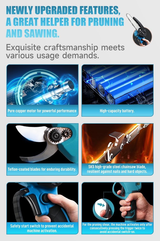 Electric Pruner Kit, 3-in-1, Max 8 ft Reach, 2x 21V Batteries, 6-inch Cordless Chainsaw & Electric Pruning Shears with Extension Pole, SK5 Blades – Ideal for Yard Work & Tree Trimming 【All-in-One Electric Pruner Kit for Homeowners & Gardeners】 Designed for yard work, garden trimming, and DIY landscaping, this 3-in-1 electric pruner kit includes a 6-inch cordless chainsaw, electric pruning shears, and an 8ft adjustable extension pole, perfect for seasonal tree pruning. The stylish blue color adds a pop to your tool set, making it both practical and attractive for home users. 【Powerful Brush & Brushless Motors for Efficient Cutting】 Equipped with a pure copper brushed motor (chainsaw) and a high-efficiency brushless motor (shears), this pruner kit delivers smooth, consistent power. Suitable for cutting thick branches and trimming shrubs, it’s ideal for spring and autumn cleanup in residential yards or small orchards. The SK5 steel blades ensure long-lasting sharpness. 【2×21V Rechargeable Batteries for Extended Use Outdoors】 With two 21V lithium-ion batteries, this kit provides extended runtime to complete larger pruning projects without interruption. Whether you’re maintaining tall hedges or cutting limbs in your backyard, this cordless design supports portable, cable-free operation during any season. 【Safe Design for High-Reach Tree Cutting Tasks】 Built with safety and stability in mind, the kit features a dual-lock trigger to prevent accidental starts and a secure rivet-lock extension pole for reaching up to 8 feet high. Ideal for older users or small-statured gardeners, the lightweight design and compact size make pruning safer and easier—no ladder needed. 【Complete Kit & Responsive Customer Support】 This blue pruning kit includes all essentials: chainsaw, shears, extension pole, 2 batteries, charger, and blades. Ideal for gifting to garden lovers or DIY users. If you have questions, contact us anytime via Amazon—our team is ready to offer prompt, professional service within 24 hours.