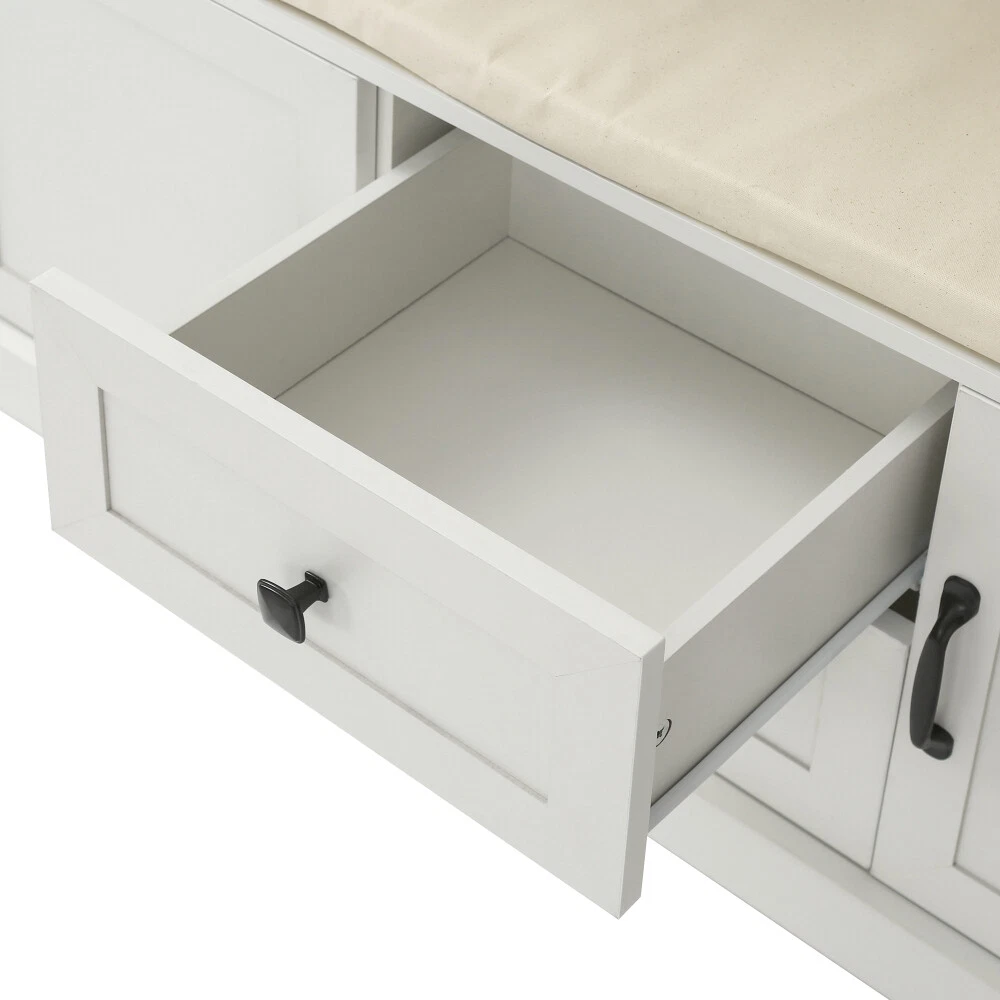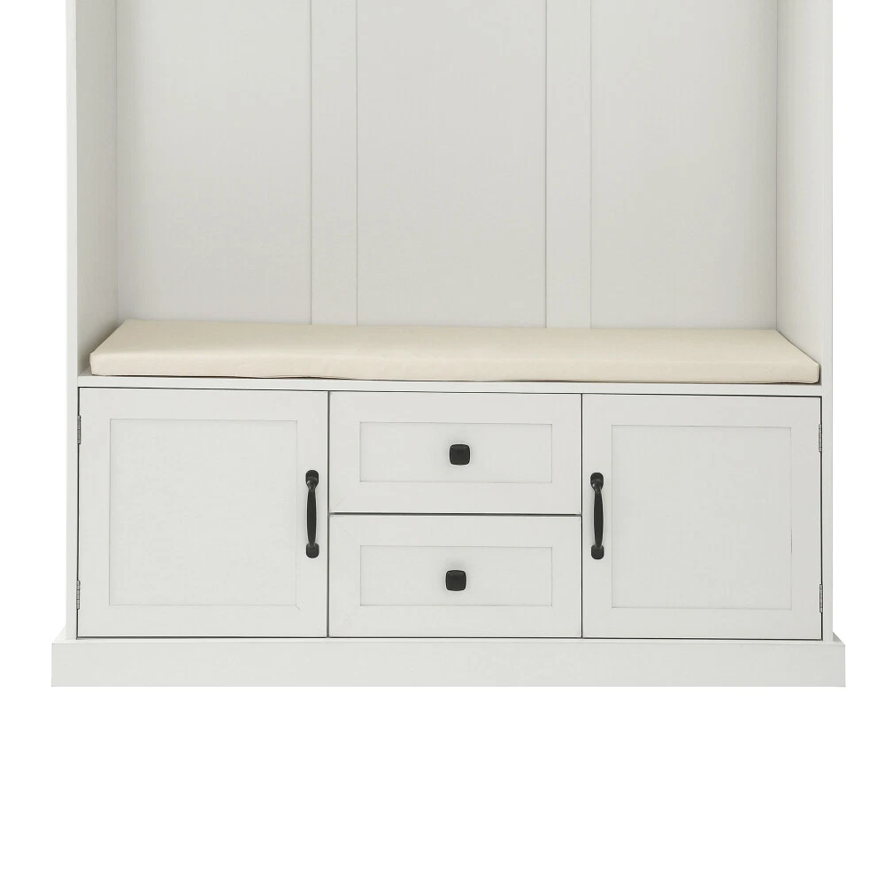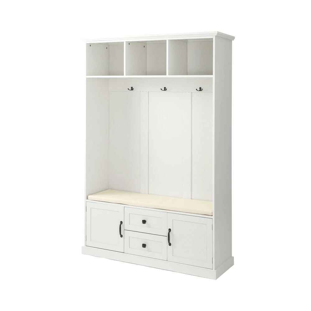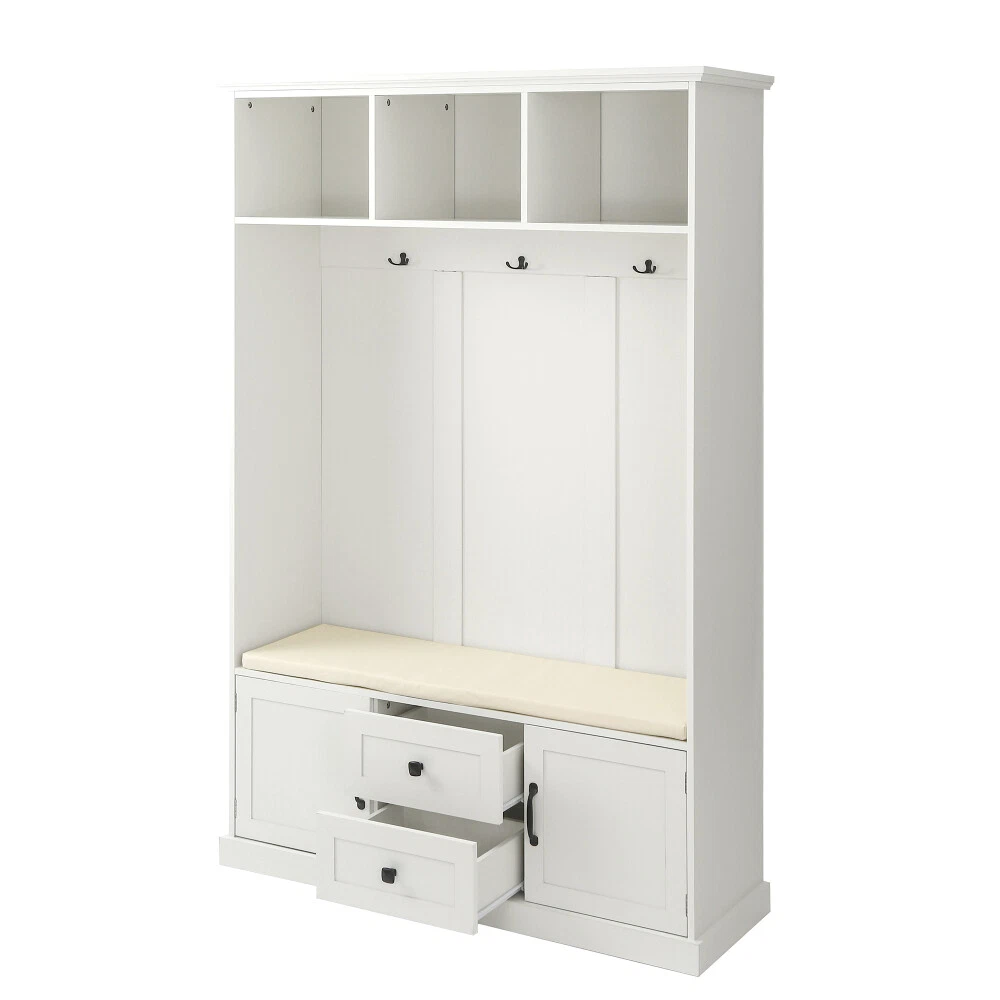 Product Features A hall tree which decorate your entryway and organize your coat, shoes and any other belongings, make your entryway tidy and become a good helper for your home life. Three open storage shelves, 3 metal double hooks, with shoes bench and shoes storage space in the bottom, maximize storage function of your entryway,avoid clutter in the home,at the same time save your space of your home. Including assembly manual and all necessary hardware and fasteners. Components are pre drilled and pre cut for assembly. Description Classic details give our Storage Locker a traditional look, but clean lines and a modern finish bring this hall tree into the now. Generous, sweeping crown molding accents the top of the case; 3-open cubbies lie below it, awaiting your display items, books, accessories and more. The open area beneath the cubbies features elegant beaded-board paneling, 3-double hooks for coats and bags, and a comfortable seat with cushion. The grand finale of this mudroom storage piece, 2-drawers and 2-doors that allow you to store away even more necessitie. Weights & Dimensions Hall Tree 70.9'' H x 15.74'' D x 47.24'' W Top Weight Capacity 22 lbs Top Cabinets Capacity 11 lbs Cabinets Capacity 44 lbs Table Top Thickness 1.37'' Clearance-Floor to Bottom 2.75'' Hook Weight Capacity 6 lbs Cabinets Size 14.3'' H x 13.37'' D x 14.3'' W Cushion Size 1.18'' H x 13.38'' D x 43.7'' W Specifications Pieces Included 1 Hall Tree Top Shape Rectangle Product Material Particle board Purposeful Distressing Type NO Shelves Included Yes Number of Shelves 3 Drawers Included Yes Number of Drawers 2 Cabinets Included Yes Number of Cabinets 2 Country of Origin China Level of Assembly Full Assembly Needed Suggested Number of People for Assembly/Install 2 Estimated Time to Set Up 1h Adult Assembly Required Yes