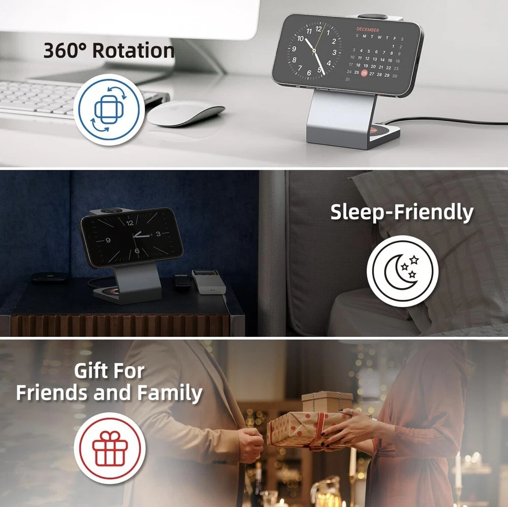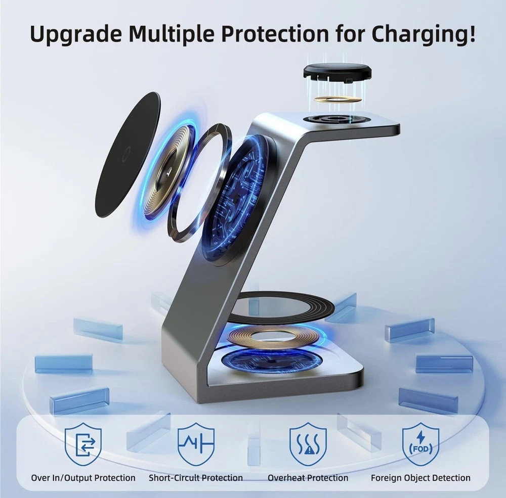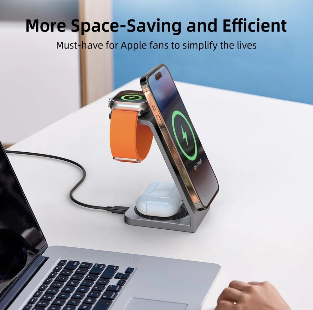 What's in the box Wireless Charging Station 18W Wall Adapter USB-C Charging Cable User Manual Compatible phone models: iPhone 13/13 Mini/13 Pro/13 Pro Max, iPhone 12/12 Mini/12 Pro/12 Pro Max, iPhone 15/15 Plus/15 Pro/15 Pro Max, iPhone 14/14 Plus/14 Pro/14 Pro Max Compatible devices: iPhone 15/14/13/12 Series, AirPods Pro 1, AirPods Pro 2, Apple Watch Ultra/9/8/7/6/5/4/3, AirPods 3/2