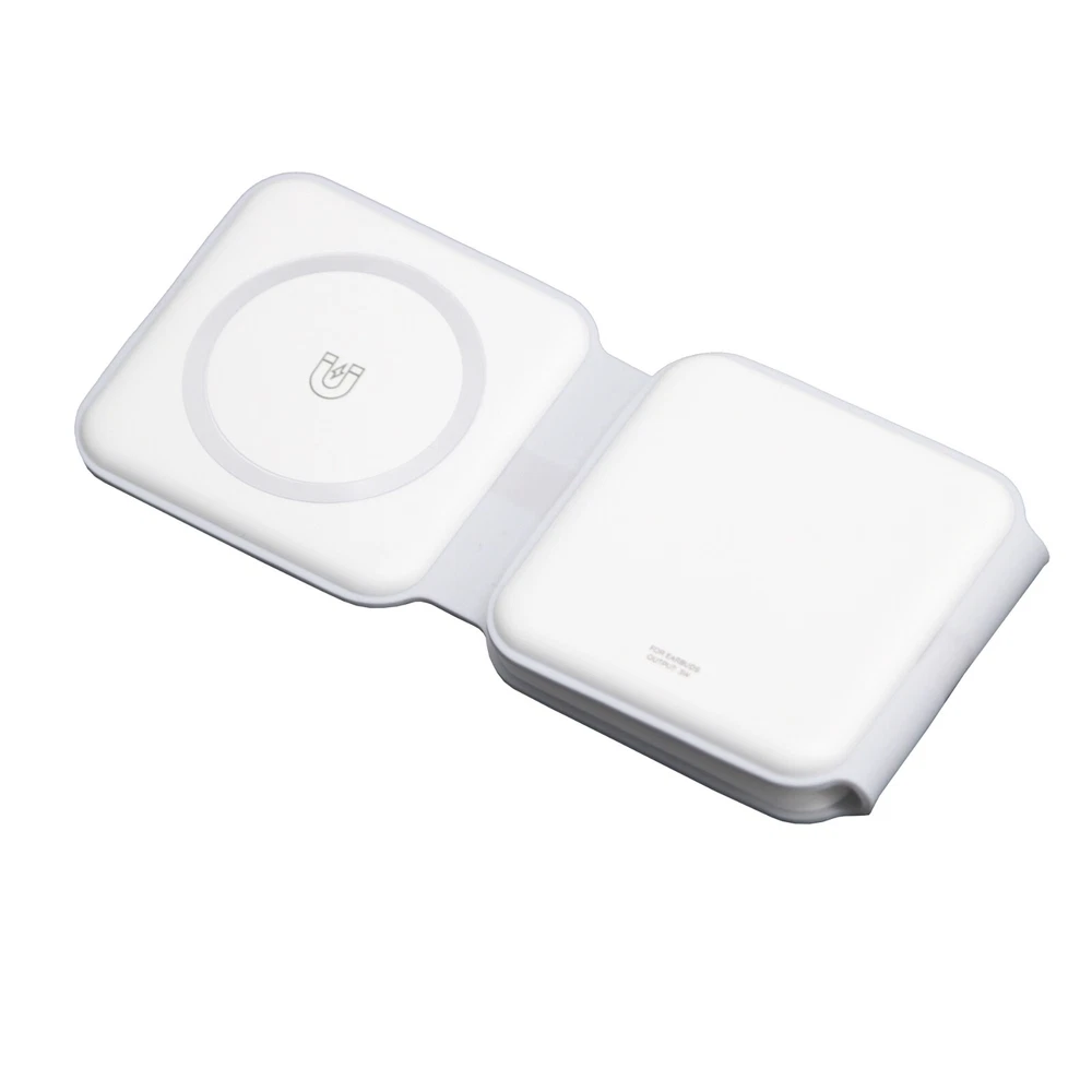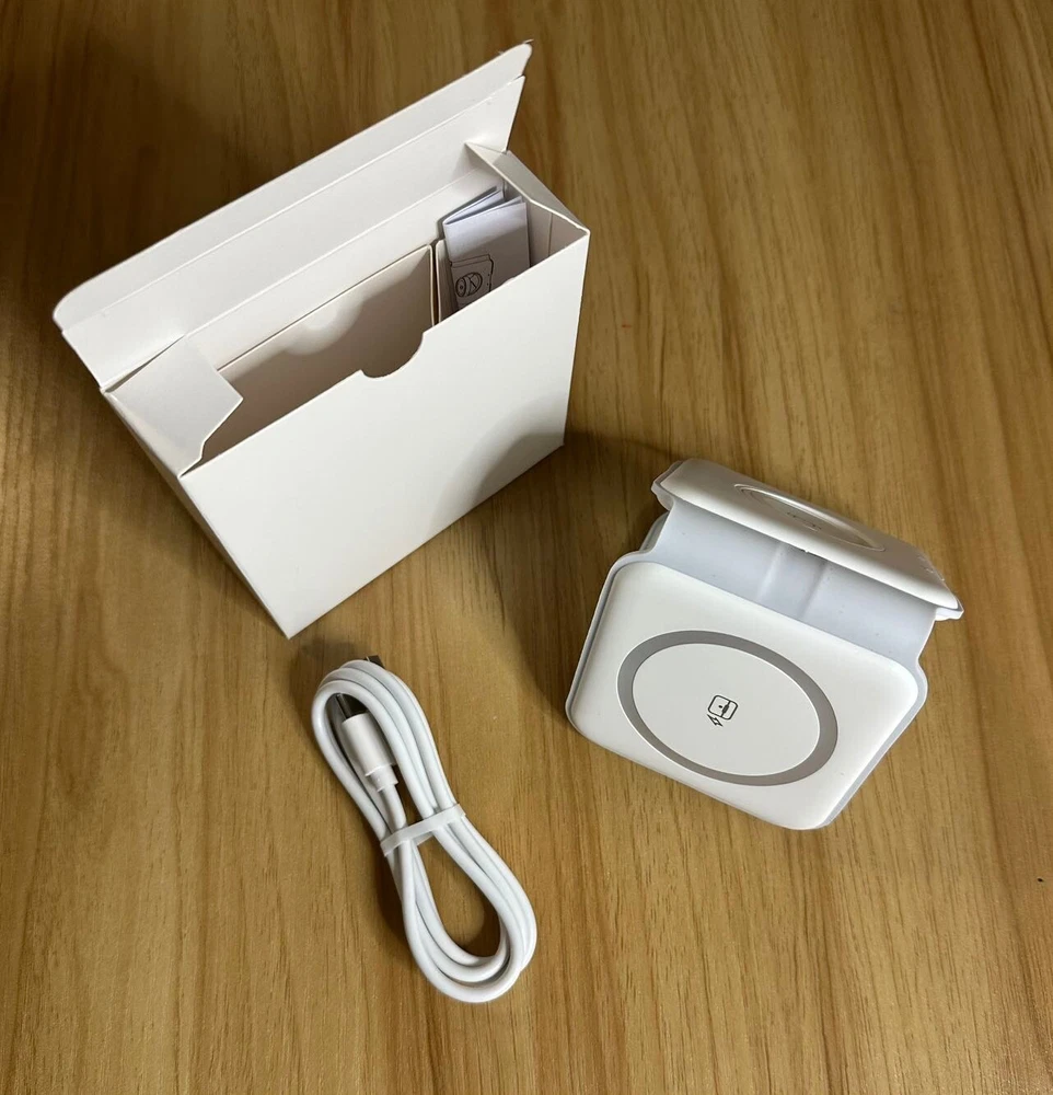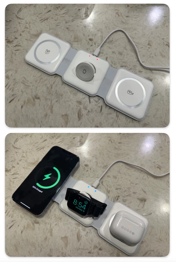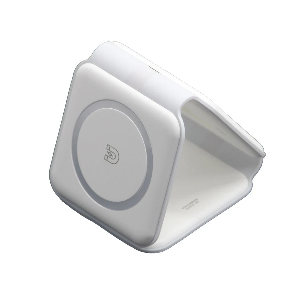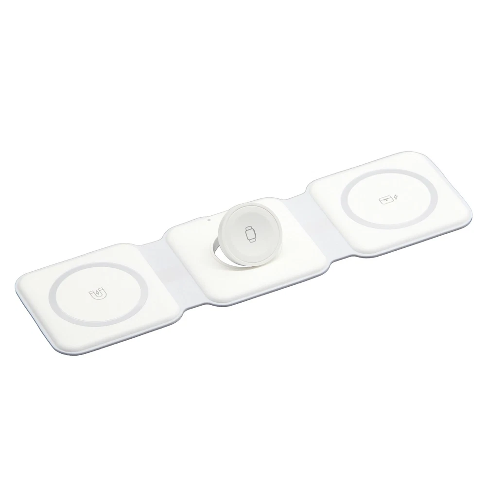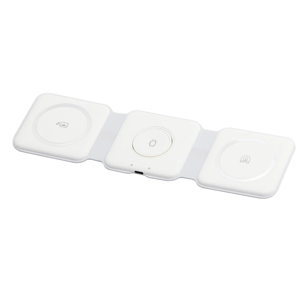 SKU# W3001 3-in-1 Foldable premium magnetic wireless charging pad Originally produced for the promotional industry and distributed in well-known shopping malls Brand new and unused, packaged in a white box For multiple devices: iPhones, Airpods, and iWatches etc. Charge 3 devices simultaneously Different indicator lights Output: 2.5W.3W.15 W Input: 5V-2A. 9V-2A Type-C charging port 9.84*2.95*0.31 in. / 0.23lbs
