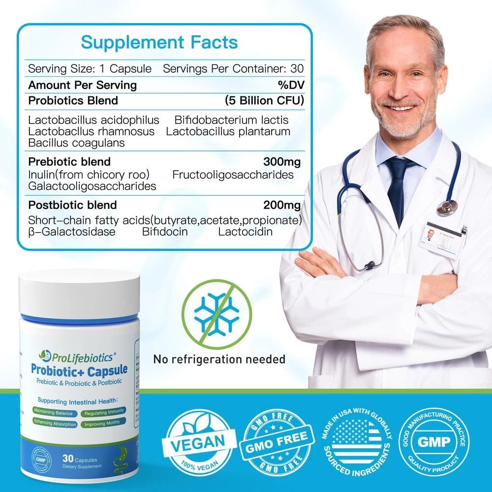 is a 3-in-1 formula with prebiotics, probiotics and postbiotics to support a balanced gut microbiome. Our formula is made of traceable 5B CFUs of 2 clinically studied probiotic strains. Our visible supply chain tells you what you're putting into your body where it comes from and why. Plus it's designed to thrive with our delayed-release capsule to help reach the colon (not the stomach), an ideal place for probiotics to survive and grow Leading Capsule Design: Our innovative nested capsules use delayed release technology to help probiotics reach the colon (not the stomach), making it an ideal place for probiotics to survive and grow. After reaching the colon,Postbiotic ingredients can improve the intestinal environment and promote the survival of probiotics. All of these use moisturizing techniques to protect probiotic strains, ensuring a probiotic survival rate of 99.5% Digestive and Immune Support: Our state-of-the-art digestive support methods include probiotic strains to support healthy habits and alleviate occasional discomfort such as mild and occasional bloating, bloating, and diarrhea; Probiotics that support intestinal barrier function; Probiotics, designed to target harmful bacteria in the intestine and support the growth of beneficial gut bacteria; And probiotics to help support immune health. It is estimated that 70% of the immune system is located in the intestine Rigorous Experimental Support: After more than ten years of experimental research, has been able to utilize various strains to produce highly physiologically active Postbiotic ingredients, which possess characteristics of heat resistance, acid resistance, and durability, greatly enhancing the efficacy of probiotics, thus opening a new era of probiotics+prebiotics+Postbiotic 3-in-1 After sales commitment: If you have any questions, you can contact us directly, and we will answer within 24hours.