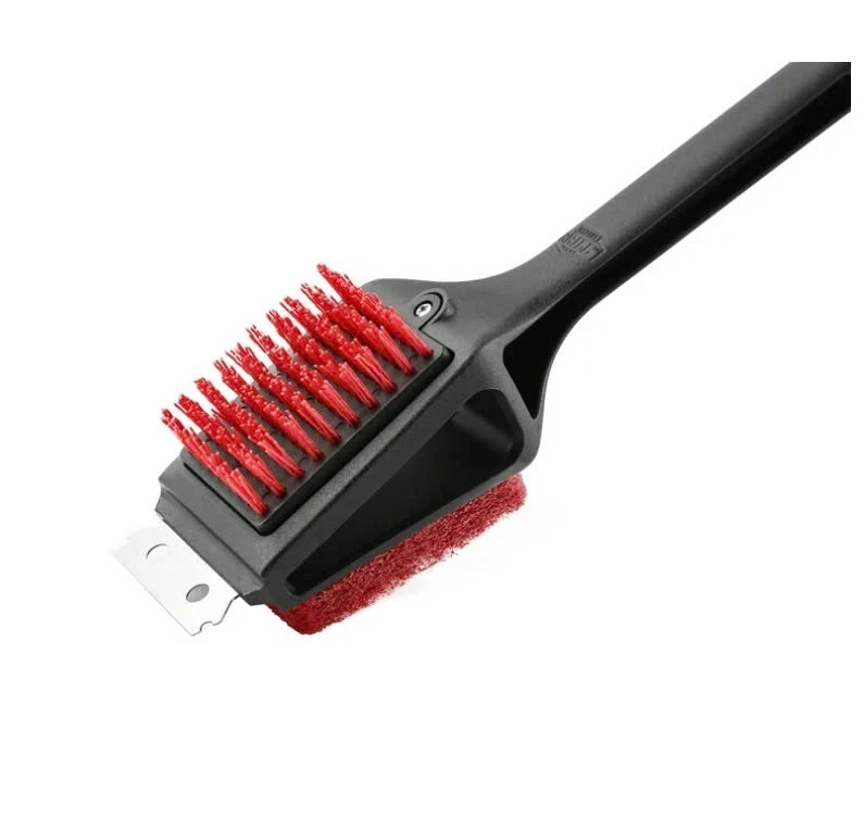 3-in-1 Grill Brush with Stainless Steel Scraper - Cold Cleaning BBQ Tool Enhance your grilling experience with this versatile barbecue tool, expertly crafted from food-grade stainless steel and durable plastic to ensure long-lasting performance. Designed with convenience in mind, it features a large hanging hole for easy storage, keeping your grill area tidy and organized. This must-have grilling accessory is perfect for maintaining your grill grates, improving overall performance, and extending the life of your grates. It is specifically designed for cold cleaning, allowing for safe and effective maintenance of your grill. The tool boasts a sturdy scraper for tackling tough, stuck-on foods, a wire brush for reaching between grill grates, and a unique scrub brush on the reverse side that conforms to the contours of your grill for a deep and thorough clean. The soft-grip handle offers exceptional comfort, making it easy to handle even during extended use. A thoughtful gift for both novice and seasoned chefs, this barbecue tool is ideal for birthdays, holidays, and special occasions. Keep your grill in top shape and enjoy deliciously prepared meals with this essential grilling companion!
