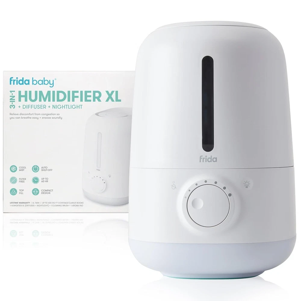 XL TANK: Extra-large 6L tank cool mist humidifier flows for up to 60 hours to help adults, and babies conquer congestion. HUMIDIFIER FOR LARGE ROOMS: This humidifiers essential compact design hydrates bedrooms, nurseries, and living spaces up to 600 sq ft. EASY TO FILL BABY HUMIDIFIER: Top-fill design allows you to easily fill at the sink or in the room without removing the tank, either by lifting the cover or pouring water directly onto the lid reducing the chances of any spills or mess. EASY TO CARRY + CLEAN: Convenient top handle to easily lift and carry the tank and large tank opening allows you to easily clean the interior of the tank. FULLY LOADED: Filter-free, auto shut-off, low-water indicator, 360 dual-mist spout, and whisper-quiet design. Product information Technical Details Special Feature Low Water Indicator, Auto Shut Off, Aroma Diffuser Color white Filter Type No filter Floor Area 600 Square Feet Operation Mode Automatic Product Dimensions 14"D x 14"W x 14"H Item Weight 5.5 Pounds Room Type Living Room, Bedroom Model Name Frida Baby 3-in-1 Humidifier XL + Diffuser + Nightlight Included Components Humidifier XL, Cleaning Brush, Aroma Pad for Diffuser, Power Cord Control Method Touch UPC 810028773899 Item model number 100001592 Material Type Plastic Material Composition plastic Additional product features Low Water Indicator, Auto Shut Off, Aroma Diffuser Number Of Items 1 Batteries required No Item Weight 5.5 pounds Country/Region of origin USA
