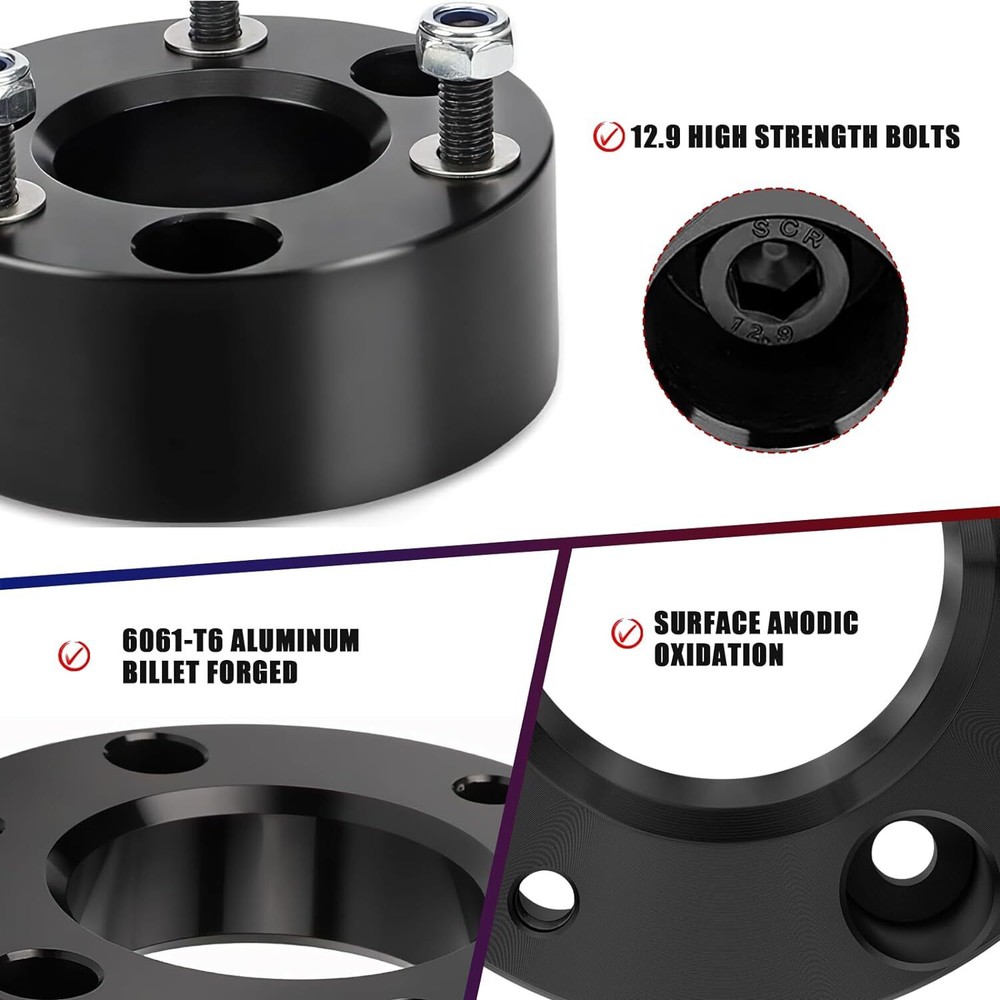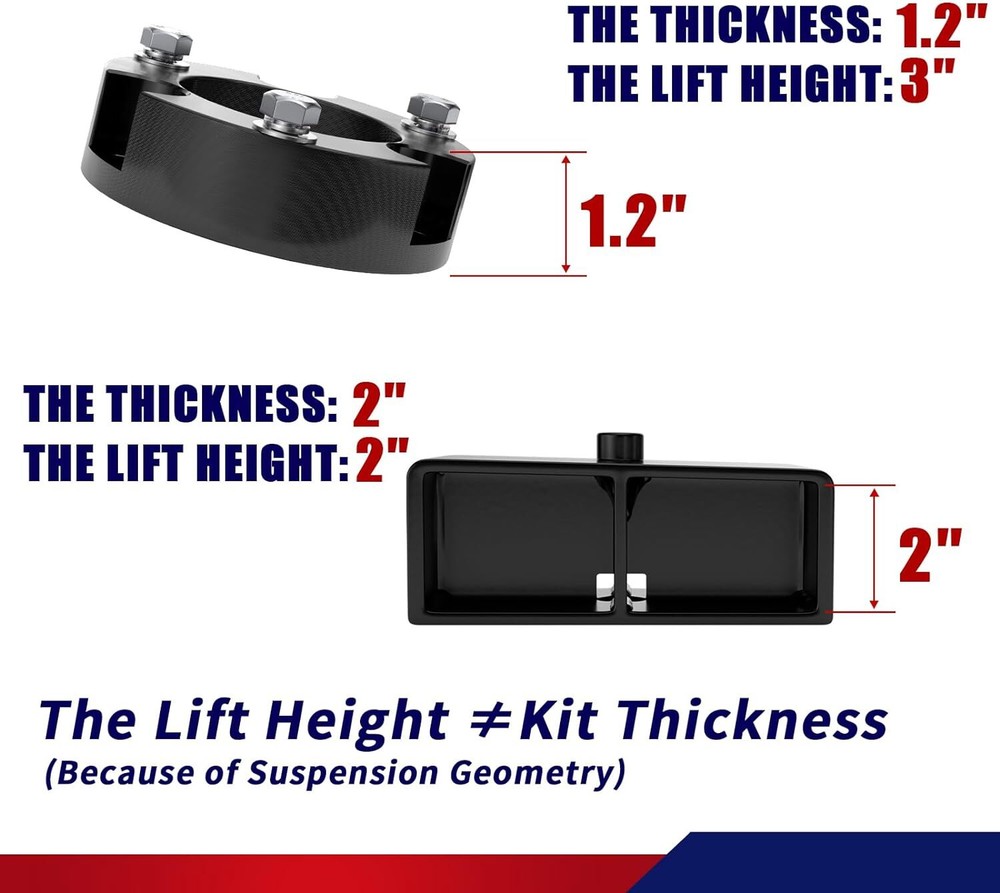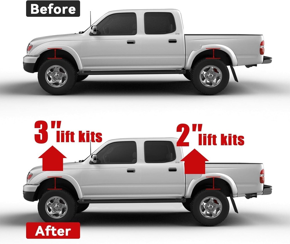【Compatible】Leveling lift kit replacement for 1995-2004 Tacoma (6 lug models only) FITMENT - 3" Front and 2" Rear Leveling Lift Kit for 1995-2004 Tacoma. RAISE THE VEHICLE HEIGHT - These will raise the front of your truck by 3 inch and the rear of your truck by 2 inch, Because of suspension geometry,the ratio between lift height and kit thickness is not 1:1 AGGRESSIVE LOOK - Once you install it on your truck,it will give your truck a cool look.Accurate numerical control precision and high quality, ensure your driving safe and comfortable MATERIAL - Forged from 6061-T6 aluminum alloy,CNC automatic processing,surface anodic oxidation and heat treatment,not only ensure high precision and stability,but also enhance the hardness and corrosion resistance of the material WARRANTY & SERVICES - All Leveling kits are covered by 2 years warranty,Pls feel free to contact us with any questions regarding our products and services Compatible with: 1995-2004 Tacoma 2WD 4WD (6 lugs only) Does not fit 5-Lug Tacoma models Important Note: Lift the front by 3". Due to suspension geometry, the ratio of the lifting height to the thickness of the lift kit is not 1:1. Package: 2 x 3inch Front Leveling Lift Kit 2 x 2inch Rear Leveling Lift Kit 4 x U-Bolt 1 Set Nut.