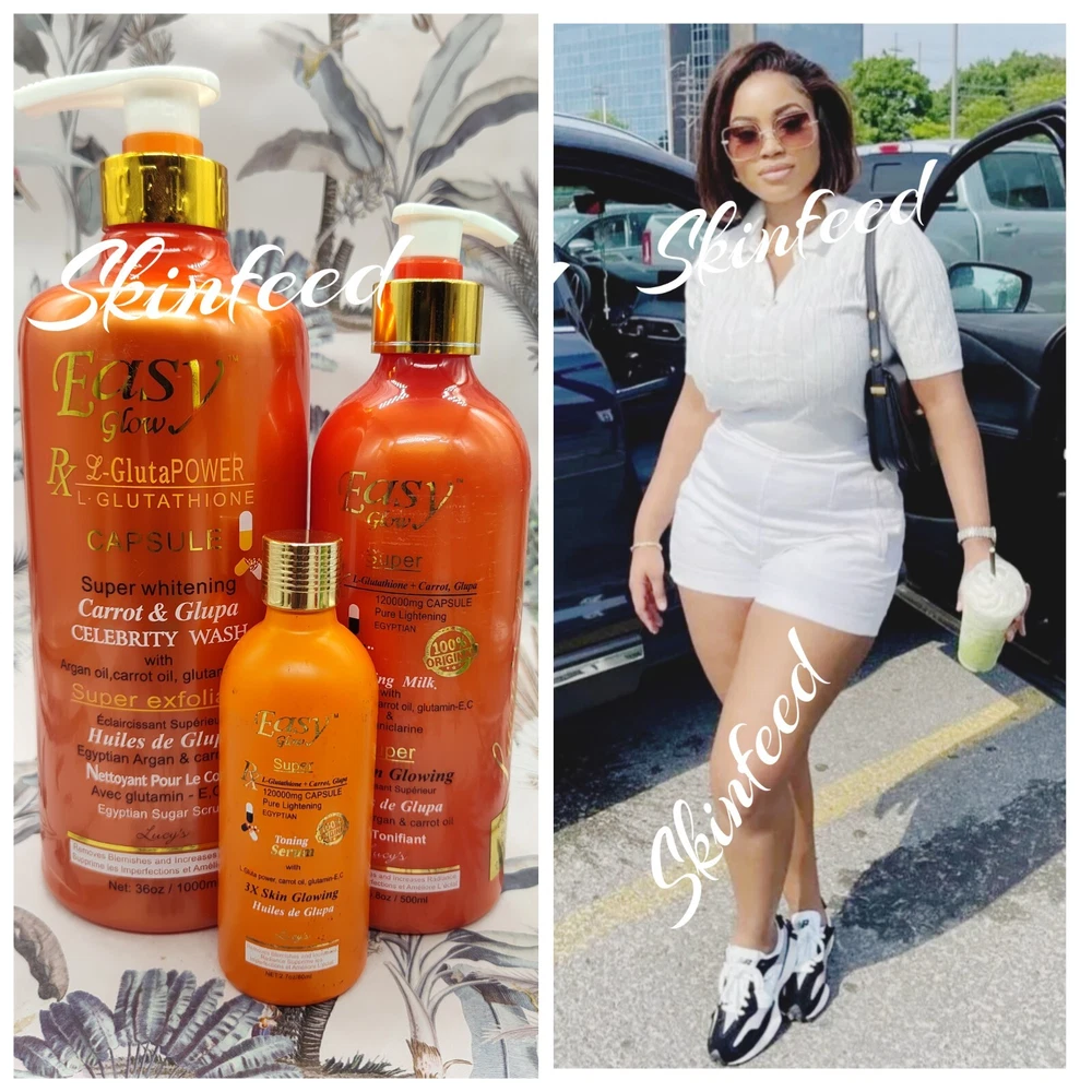 3pc. Easy Glow 3x skin glowing Body Lotion, Shower gell, & Serum. Carrot oil .. Mix lotion 250ml with 60ml serum. TIP. add anti reaction oil to this lotion because of its Strong fast action. Get your bel Eclat kenacol, shenic oil, beauty series oil or style clear serum to add into this fast action lotion for an amazing results.