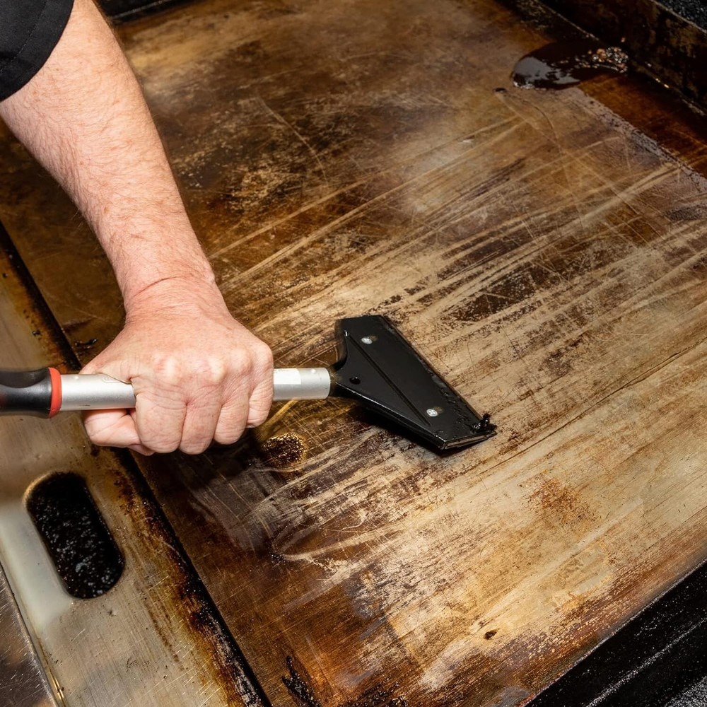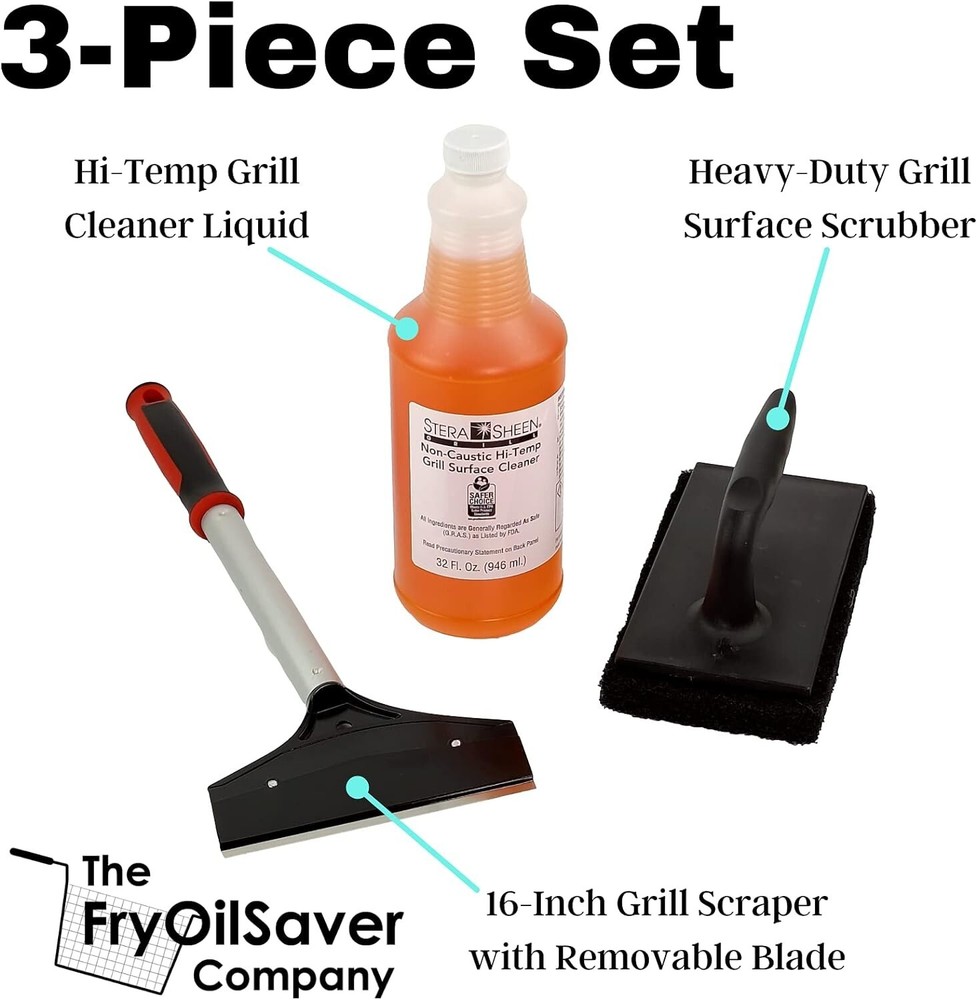 3pcs Set Griddle Cleaning Kit w/Hi-Temp Grill Liquid Cleaner, Premium Griddle Scraper & Heavy Duty Scrubber Pad, Flat Top Grill Cleaner, Grill & Blackstone Griddle Accesories by The FryOilSaver Co. PREMIUM GRILL SCRAPER: FryOilSaver Co Griddle Cleaning Kit features a top-quality stainless steel grill scraper with a replaceable blade, this kit is a must-have for flat top grill maintenance. Perfect for gas grills, blackstone griddles, and camping, it includes a tough scraper tool and degreaser cleaner for a comprehensive cleaning experience. Ensure a spotless surface with this essential set of heavy-duty cleaning tools, suitable for various flat top grill accessories. Invest in simplicity and efficiency with our premium griddle cleaning kit, making your grilling experience safe and enjoyable. EASY-GRIP HANDLE: FryOilSaver Co Grill Pad Holder boasts an ergonomic easy-grip handle for enhanced control. Connect it securely to our stainless steel cleaner, ensuring a firm hold while tackling grease and grime. Perfect for use with griddle accessories, tough scraper brush cleaners, and high temp grill cleaners, this holder provides optimal control. Invest in top-notch grilling tools, including the flat top grill cleaning kit, for a spotless cooking surface. ALL-IN-ONE GRIDDLE CLEANING KIT: It includes essential tools like stainless steel cleaner, tough scraper brush, and grill brush to keep your griddle spotless. This kit ensures safe removal of food-grade grease and tough buildup, extending the life of your cooking equipment. Perfect for flat top grills, blackstone accessories, and various grilling tools LIQUID GRILL CLEANER: It specifically designed for stainless steel and griddles, this powerful cleaner effortlessly removes tough grease and food residue. Combined with the included cleaning brush and accessories, it ensures optimal results for maintaining your grill. KEEP YOUR GRIDDLES HEALTHY: Maintain the health of your griddles by regularly using our all-in-one griddle cleaning kit. Griddles, require frequent cleaning to ensure they cook efficiently and deliver mouthwatering dishes. Our kit, equipped with a stainless steel cleaner, tough cleaning brush, and heavy-duty scraper, is designed to keep your griddles in top-notch condition. Specializing in Frying Oil Cost saving products Large range of Sanitizer Test Strips Oven Cleaners and Degreasers