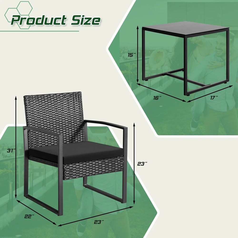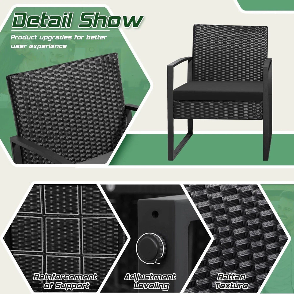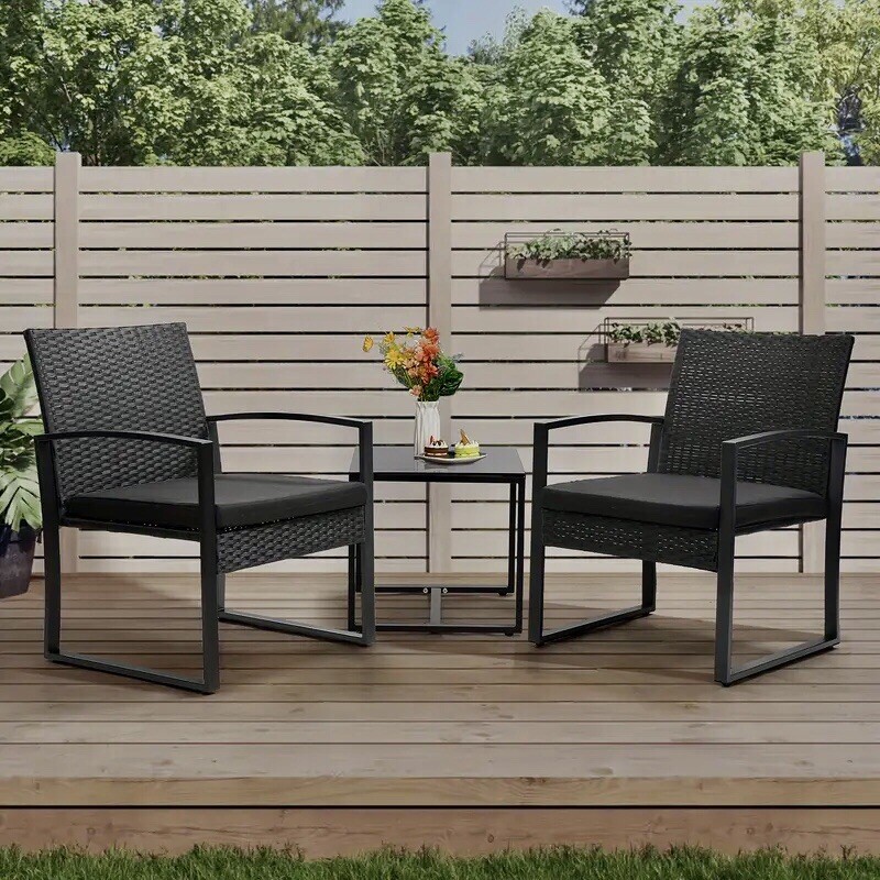 This set includes 2 armrest chairs and 1 coffee table. All necessary hardware and instruction are included. Outdoor wicker furniture set made with high-quality PE rattan material and powder-coated steel frame, provide a stable guarantee for your use Bistro set features an elegant glass top side table perfect for a couple of glasses of wine or the morning coffee and newspaper. Easy to clean: Its Weather resistance characteristic helps you make quick clean come to fruition. The removable sponge that can be taken out from the zippered cushions can be cleaned labor-efficiently. What's Included? 2 Cushion(s) 1 Table(s) 2 Chair(s) Features Outdoor Wicker Furniture Set - Made with high quality PE rattan material and a solid metal frame, this balcony furniture set is durable and has long life span, Perfect for your outdoor space and allowing you to enjoy your leisure time. Elegant Glass Table Top - Outdoor bistro set features and elegant glass top side table perfect for a couple glasses of wine or the morning coffee and newspaper. Sturdy & Durable: The powder coated steel frame are rust-proof and high-quality hand woven weather-resistant PE wicker won't fade.Each seat supports up to 300 pounds. Upgraded Comfort: The wide and deep chairs cushioned by very soft padded seat cushions will make you forget your fatigue and enjoy your leisure time completely. Applicable Places: This Homall outdoor patio furniture set is suitable for poolside, lawn, garden, patio, backyard and so on. It will bring you a more comfortable experience to have a rest at the leisure time
