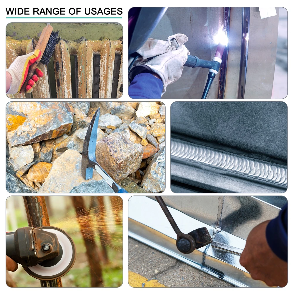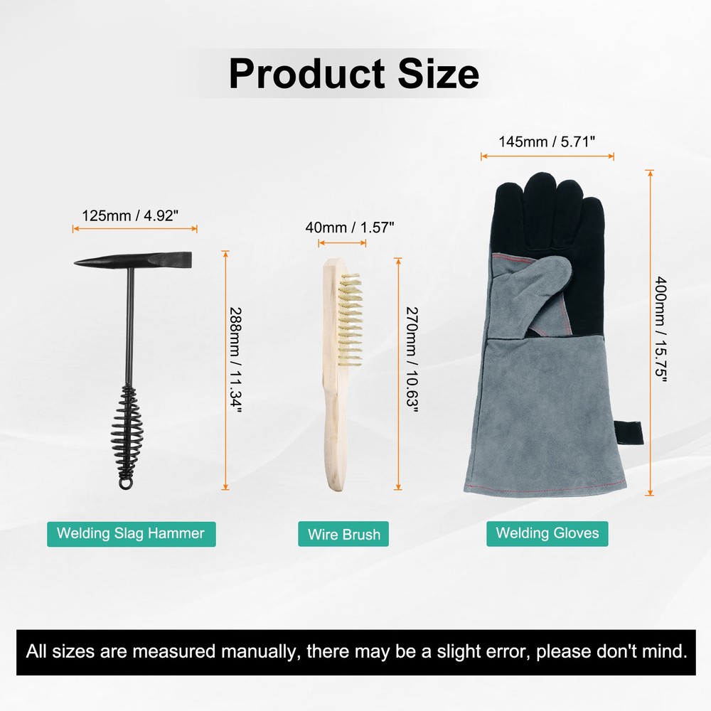 Document The welding slag hammer measurement size: 11.34 inch x 4.92 inch (288mm x 125mm); the wire brush size is 10.63 inch x 1.57 inch (270 mm x 40 mm); the welding gloves size is 15.75 inch x 5.71 inch (400 mm x 145 mm).Welded chisel hammers are made from high carbon steel for strength and stability. The copper-plated stainless steel wire has greater toughness and wear resistance, which can reduce wire breakage and extend service life, helping you remove dirt quickly. The gloves are made of soft leather.Weld slag hammers are designed with a spring-loaded handle that absorbs shock from work for a shock absorbing effect. Let you use for a long time will not feel arm strain, significantly improve your work efficiency. The gloves are oil-resistant, heat-resistant (up to 500 degrees) and cut-resistant, which will give you good protection during the operation.Use the welding spatula hammer and wire brush for effective cleaning tasks. The narrow side of the brush and fine hammer are specifically designed for intricate and tight spaces, ensuring thorough cleaning results.Regularly inspect the hammers for any signs of wear or damage, and if you notice any problems, stop using them to ensure safety and product effectiveness. 3pcs Slag Remove Tool Kit Welding Hammer with Wire Brushes & Gloves The welding slag hammer measurement size: 11.34 inch x 4.92 inch (288mm x 125mm); the wire brush size is 10.63 inch x 1.57 inch (270 mm x 40 mm); the welding gloves size is 15.75 inch x 5.71 inch (400 mm x 145 mm). Welded chisel hammers are made from high carbon steel for strength and stability. The copper-plated stainless steel wire has greater toughness and wear resistance, which can reduce wire breakage and extend service life, helping you remove dirt quickly. The gloves are made of soft leather. Weld slag hammers are designed with a spring-loaded handle that absorbs shock from work for a shock absorbing effect. Let you use for a long time will not feel arm strain, significantly improve your work efficiency. The gloves are oil-resistant, heat-resistant (up to 500 degrees) and cut-resistant, which will give you good protection during the operation. Use the welding spatula hammer and wire brush for effective cleaning tasks. The narrow side of the brush and fine hammer are specifically designed for intricate and tight spaces, ensuring thorough cleaning results. Regularly inspect the hammers for any signs of wear or damage, and if you notice any problems, stop using them to ensure safety and product effectiveness. Hot Item Payment 1.We accept eBay payment . 2.Payment must be received within 7 business days of auction closing. Shipping 1.We ship to your eBay or Paypal address. Please make sure your eBay and Paypal address is correct before you pay. 2.Items will be shipped within 1-3 business day when we received payment. 3.Delivery time depends on destination and other factors. Description Policy 3pcs Slag Remove Tool Kit Welding Hammer with Wire Brushes & Gloves The welding slag hammer measurement size: 11.34 inch x 4.92 inch (288mm x 125mm); the wire brush size is 10.63 inch x 1.57 inch (270 mm x 40 mm); the welding gloves size is 15.75 inch x 5.71 inch (400 mm x 145 mm). Welded chisel hammers are made from high carbon steel for strength and stability. The copper-plated stainless steel wire has greater toughness and wear resistance, which can reduce wire breakage and extend service life, helping you remove dirt quickly. The gloves are made of soft leather. Weld slag hammers are designed with a spring-loaded handle that absorbs shock from work for a shock absorbing effect. Let you use for a long time will not feel arm strain, significantly improve your work efficiency. The gloves are oil-resistant, heat-resistant (up to 500 degrees) and cut-resistant, which will give you good protection during the operation. Use the welding spatula hammer and wire brush for effective cleaning tasks. The narrow side of the brush and fine hammer are specifically designed for intricate and tight spaces, ensuring thorough cleaning results. Regularly inspect the hammers for any signs of wear or damage, and if you notice any problems, stop using them to ensure safety and product effectiveness. Hot Item Payment 1.We accept eBay payment . 2.Payment must be received within 7 business days of auction closing. Shipping 1.We ship to your eBay or Paypal address. Please make sure your eBay and Paypal address is correct before you pay. 2.Items will be shipped within 1-3 business day when we received payment. 3.Delivery time depends on destination and other factors.
