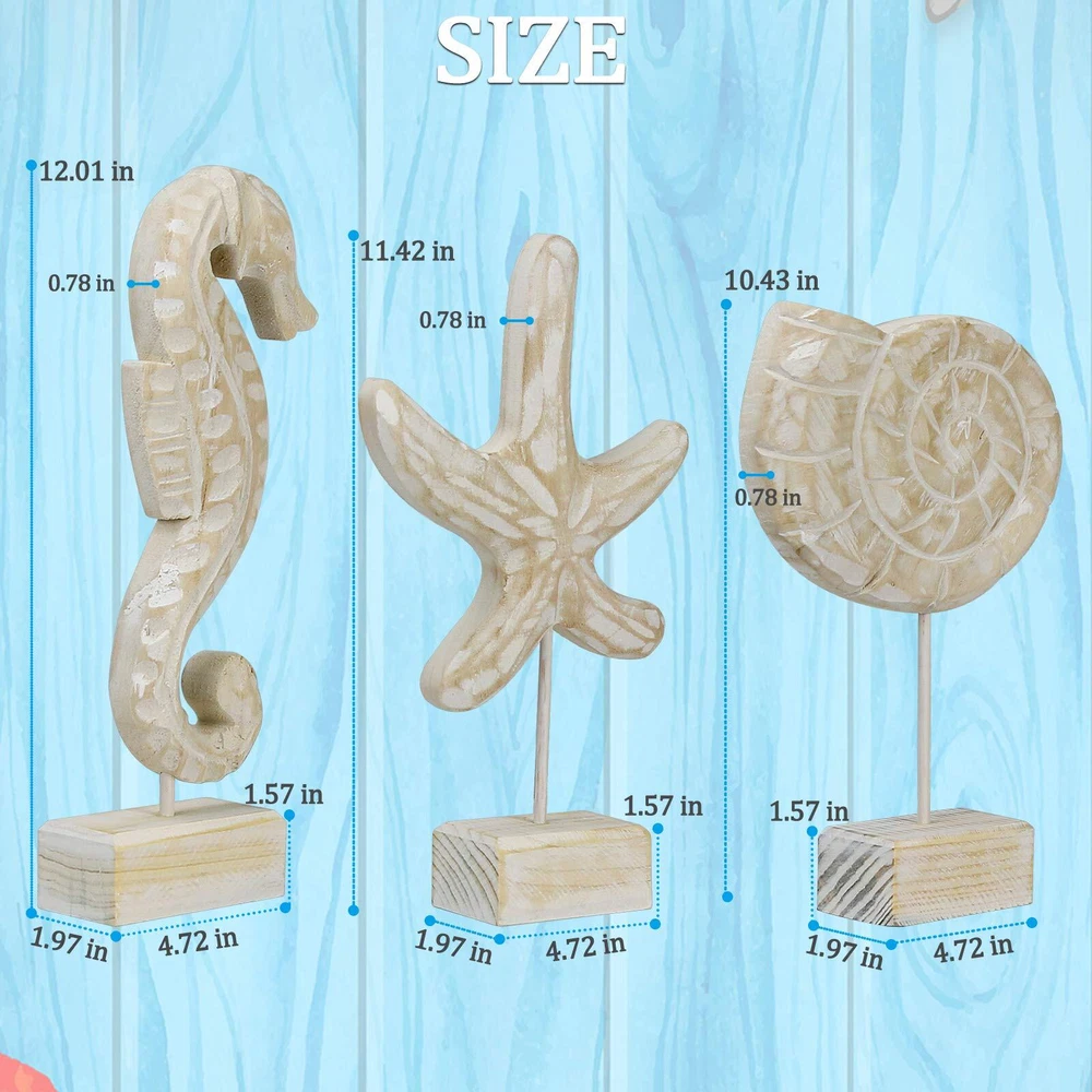 Variety of use: Perfect for nautical home decor accents, sea life decor, beach themed shelf or side table displays. Use as a center piece or use to create a tropical look and feel to your home décor. Wedding table centerpieces are also population options for these statuettes. Specifications: Material:Wood Starfish Size:4.72x1.97x11.42 inches(12x5x29cm) Conch Size:4.72x1.97x10.43 inches(12x5x26.5cm) Size:4.72x1.97x12.01 inches(12x5x30.5cm) Style:Mediterranean Package Included:3 x Wood Figurines Handcarved set of (3) Nautical Beach Ocean Theme Statues Starfish. Size:Starfish:4.72x1.97x11.42 inches(12x5x29cm);Conch:4.72x1.97x10.43 inches(12x5x26.5cm);:4.72x1.97x12.01 inches(12x5x30.5cm). Detachable Base;Perfect for any Home decoration. At your home, office, or boat. Perfect for decorating party and house, outdoor beach party. Beach and Mediterranean Style, best decoration to create ocean theme room.