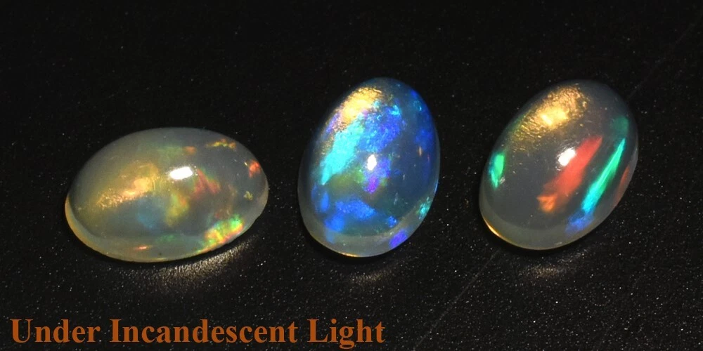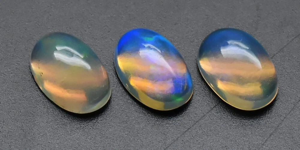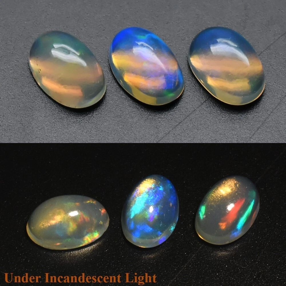Size Millimeter: 6.0 x 4.0 to 6.0 x 4.0 Number of Pieces: 3 Transparency: Semi-Transparent Gemstone Type: Opal Country of Origin: Yita Ridge, Ethiopia Cut Grade: FLORAL FLASH Rainbow Total Carat Weight (TCW): 0.98 Brand: Thaigemstore Gemstone Form: Polished Certification: Not Included Gemstone Shape: Oval Cabochon, Polished Both Side Gemstone Creation: Natural Gemstone Color: White-Orange-Green-Yellow-Violet-Blue Flashing Gemstone Treatment: Unheated Untreated