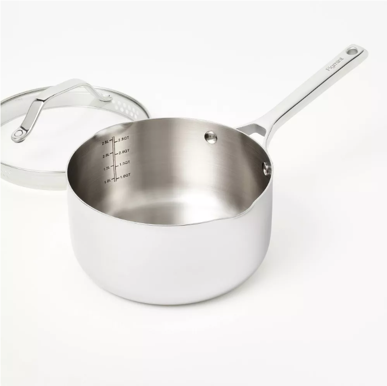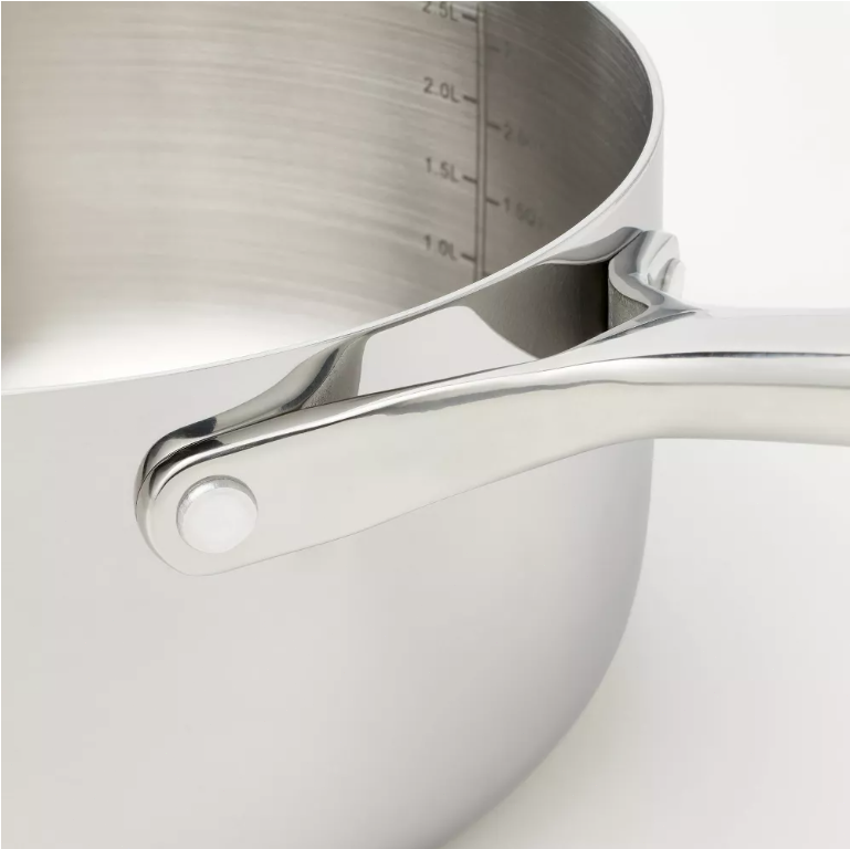 3qt saucepan with silver finish Aluminum core is fully surrounded by two layers of stainless steel for quick and even heating Surface is safe for use with all utensil types Features built-in spout and strainer Also features interior volume measurements Induction, gas and electric stove compatible Dishwasher safe, but hand washing recommended for extended product life Oven safe up to 450 degrees F