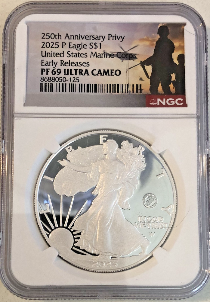 Home3x 2025 P W S Proof $1 Silver Eagle, MARINE Corps, NAVY, ARMY Privy NGC PF69 UC