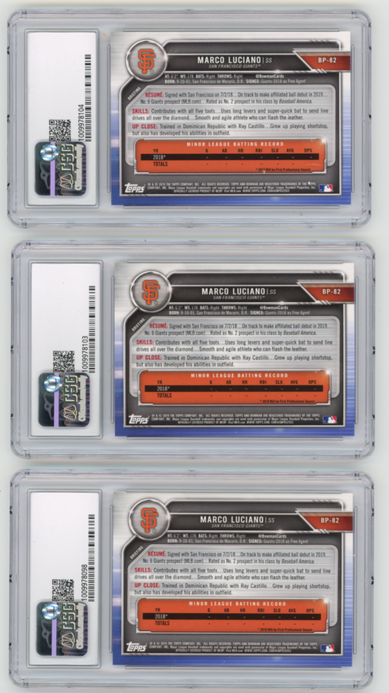 Lot 3x Marco Luciano 1st 2019 Bowman Prospects #BP-82 CSG 9.5 Gem Mint Graded You get the three cards shown in the scans. Gem Mint