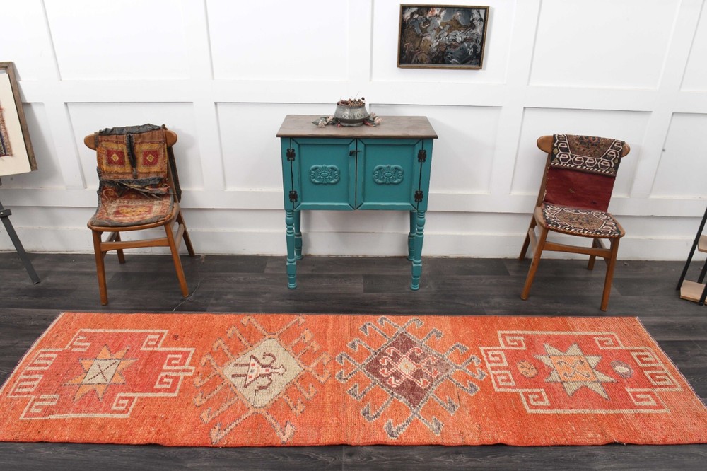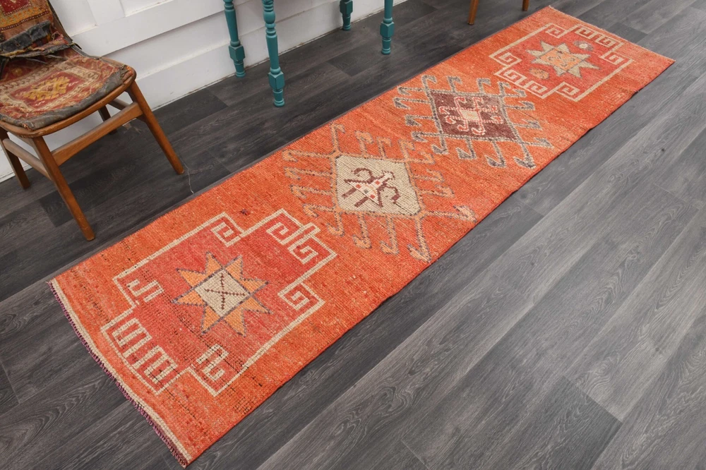 3x10 ft, Turkish Orange Runner Rug, Wool, Hallway Stair Decor, Washable, Tribal