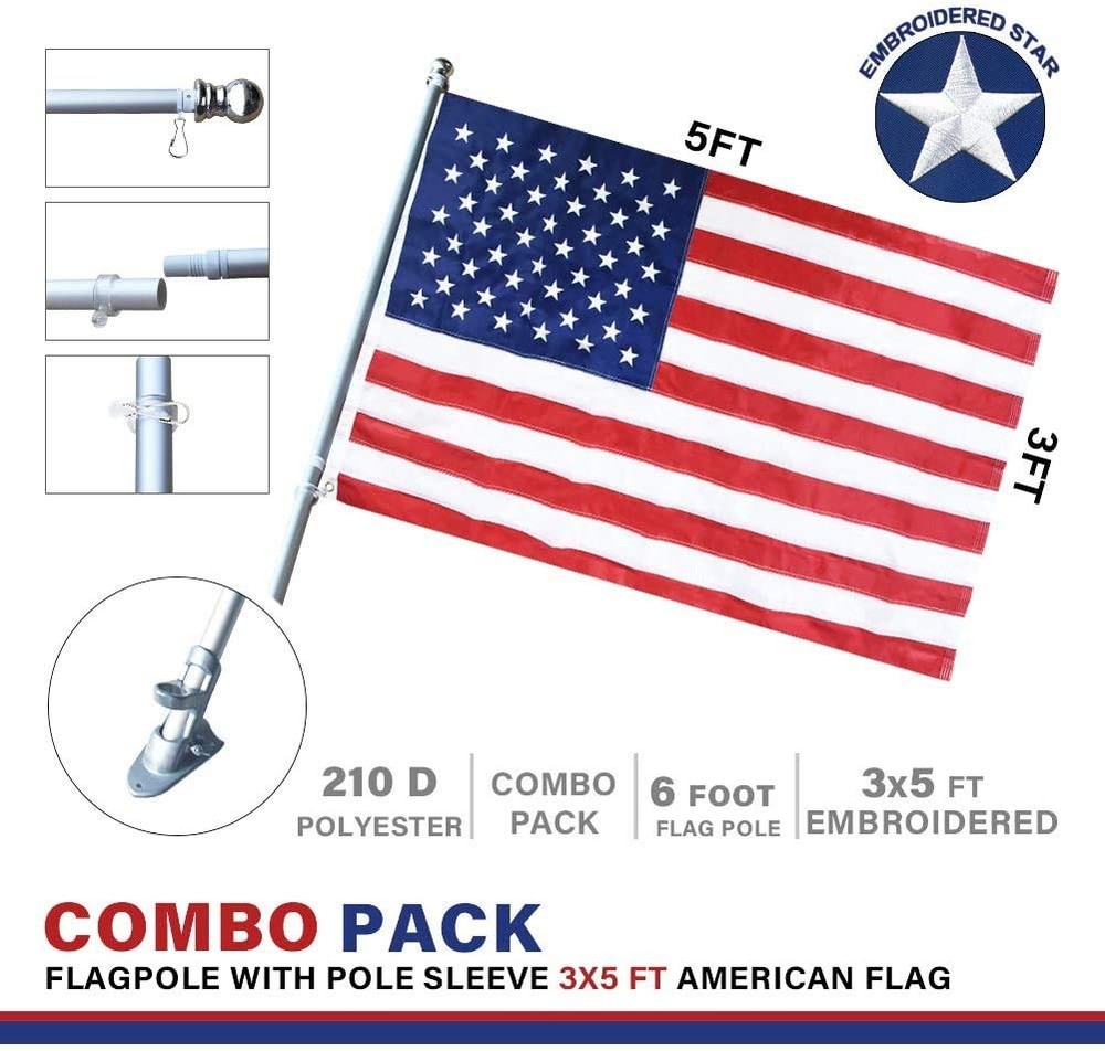 US FLAG WITH POLE - Everything includes the 3x5 Feet Polyester Amercian Flag, 6 Feet Aluminum Flag Pole and the base needed for an easy, worry-free 2-minute installation. TANGLE-FREE SPINNING FLAG POLE - Our American Flag Pole Kit includes a 6' spinning flag pole for the perfect outdoor american flag display. Our new tangle-free technology Utilizes sealed weather-proof ball bearings to ensure your us flag hangs properly. Made of Aluminum to make sure it durable and rust free so you dont have to worry about getting it changed too often. 3x5 AMERICAN FLAG - The American flag made of 100% polyester imported for long lasting use. Every star is embroidered as official US flag, each stripe is stitched together with double thickness and double stitching and strengthened by canvas header and two brass grommets. You will surprise at the embroidered stars and sewn stripes. The Best Ideal for residential, commercial and outdoor use. FADE RESISTANT US FLAG - You will immediately notice how amazing the print is. The color is very sharp and vivid. In addition, the dye has been processed for UV fade resistance, suitable for outdoor use. Package contains one 3x5 Ft American Flag. USA FLAG SATISFACTION - 3x5 American Flag with Pole wants you to be Happy and we stand behind our flag products. All purchases are backed by a one-year hassle-free warranty.
