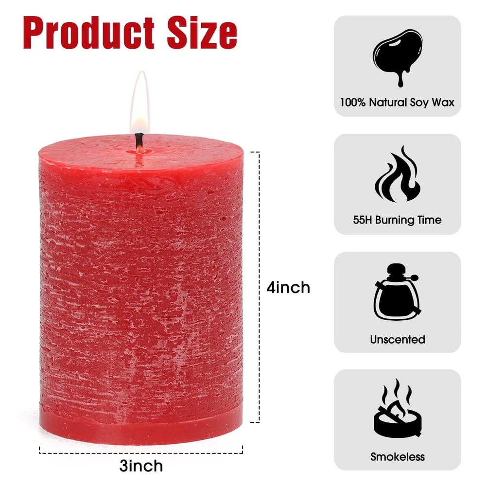 [Create a Warm Atmosphere]: Our unscented Pillar Candles provide a beautiful, smokeless, and dripless glow perfect for creating a warm and inviting atmosphere in any setting. Whether it's a romantic dinner, a family gathering, a Christmas celebration, or a moment of relaxation, our pillar candles bulk can set the mood for any occasion. [Christmas Home Decorations]: Red pillar candles can be used for Christmas decor, mantel decorations, Christmas table decorations, lighting solutions, aromatherapy, and even as emergency candles. Our pillar candles are incredibly versatile, adding elegance and charm to various situations. [Eco-friendly & Exquisite Craftsmanship]: Our pillar candles are crafted with a deep respect for nature. Made from high-quality, eco-friendly materials including 100% soy wax wax and cotton wicks, pillar candles offer a sustainable choice without compromising on elegance. Experience the exquisite craftsmanship and natural beauty of our hand-poured candles. [Product Size]: Pillar Candle Set comes with three 3×6 inch pillar candles! Each Pillar Candle is individually handmade and meticulously crafted for perfection. Enjoy the long-lasting burn time of our large and clean-burning candles, providing hours of beautiful illumination for your home or event. [Safe packaging]: We understand the importance of receiving your candles in perfect condition. That's why we have improved our packaging to prevent any damage during transit. If you're not completely satisfied with your purchase, please reach out to us directly. We are committed to ensuring your satisfaction and will promptly assist you to make things right.