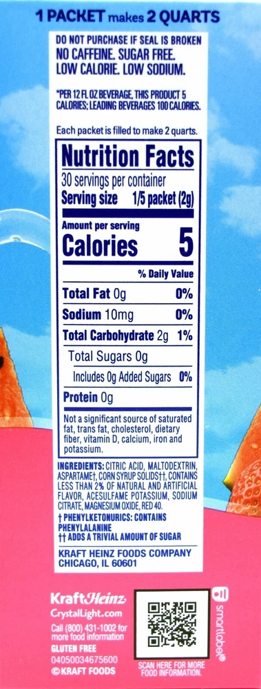 This Listing is for 4 12-Quart Boxes Crystal Light Strawberry Watermelon Drink Mix. The Best By Date For All Boxes is: March 1st 2026 Product Details: Each Box C ontains 6 2-Quart (6 2-liter) Packets Caffeine Free, Low in Sodium Kosher Product and Gluten Free Each 12 Ounce (355 ml) Serving Contains 5 Calories The Crystal Light Strawberry Watermelon product UPC is 043000064849 Additional Product Information: Crystal Light turns the water you need into the water you will love. It transforms ordinary water with fabulous fruit flavors and tantalizing teas. Each sip is the perfect way to refresh, renew and satisfy your thirst for something different. Usage Directions: Empty contents of 1 packet into large plastic or glass pitcher; Add 2 quarts (8 cups or approximately 2 liters) cold water; Stir to dissolve; Serve over ice or refrigerate. Ingredients: Citric Acid, Maltodextrin, +Aspartame, ++Corn Syrup Solids, Contains Less Than 2% of Natural and Artificial Flavor, Acesulfame Potassium, Sodium Citrate, Magnesium Oxide, Red 40. +Phenylketonurics: Contains Phenylalanine ++Adds A Trivial Amount of Sugar Questions and Comments: Questions and comments are welcome and can be sent to me via eBay email.