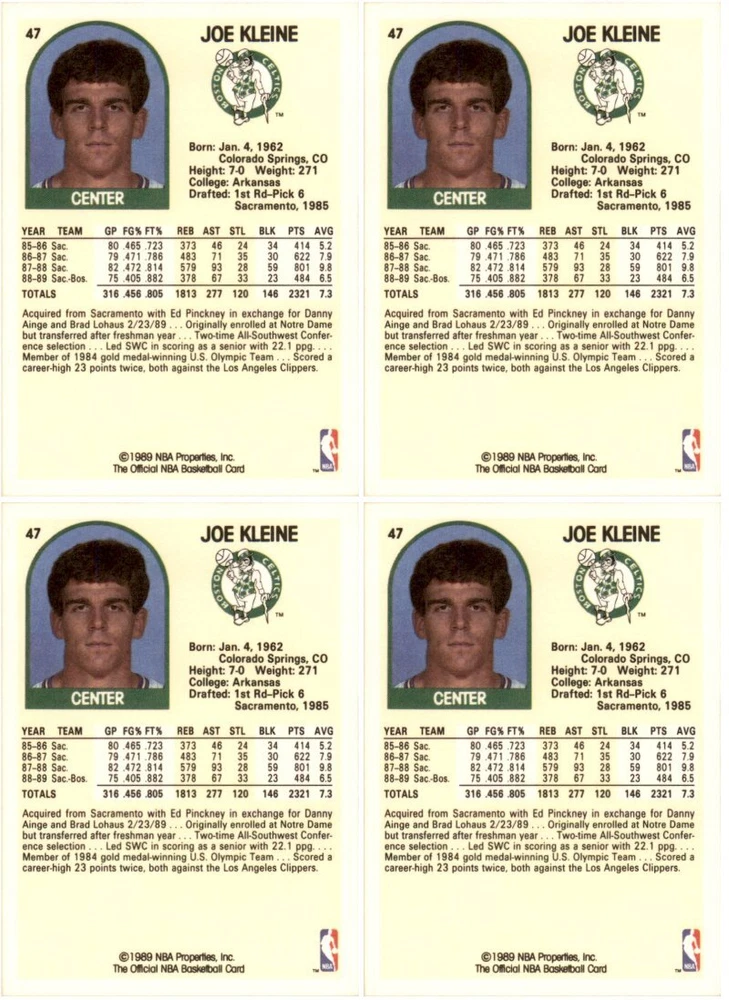(4) 1989 Hoops #47 Joe Kleine Boston Celtics Card Lot Condition: NM-MT