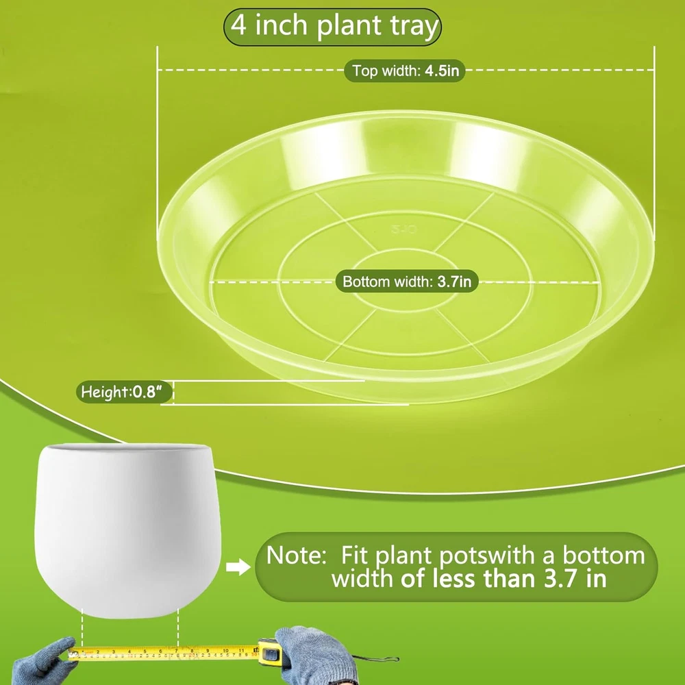 Store New Arrivals Add to Favorite View Feedback Contact 4 6 8 10 12 14 16 18 20 22 Inch Clear Plant Saucer, 5 Pack Durable Plastic Water Catcher Trays for Flower Pots, Plant Drip Trays for Indoor Outdoor Planter(4Inch) Description Item Weight 1.34 ounces Product Dimensions 4.5 x 4.5 x 0.8 inches Size 4 inch 4 Inch Clear Plant Tray(5pack): The 4 inch plant tray has a top opening diameter of 4.5 inches, a bottom diameter of 3.7 inches, and a height of 0.8 inches. Choose the pot size that suits your needs. Transparent Design: The transparent design of these plastic plant saucers does not affect the overall appearance of the pot and allows for easy observation of the pot's drainage. High-Quality Plastic Material: These pot saucers are made of high-quality plastic, durable and lightweight, ensuring long-term use without damage. Leak-Proof Design: These pot saucers are designed to effectively collect excess water, prevent pot overflow, and keep floors and surfaces clean. High Practicality: These plastic dish trays provide ten different sizes ranging from 4 inches to 22 inches, suitable for various pot sizes, convenient for households and gardening enthusiasts. Product Description HQAUT Round Clear Plant Saucers 4 6 8 10 12 14 16 18 20 22 Inch Clear Plant Saucers 4 6 8 10 12 14 16 18 20 22Inch Size: 4 inch --4.5“(top size)x3.7”(bottom size)x0.8“(depth) 6 inch --6.0“(top size)x5.0”(bottom size)x0.8“(depth) 8 inch --8.0“(top size)x7.0”(bottom size)x1.0“(depth) 10 inch --10“(top size)x9.0”(bottom size)x1.1“(depth) 12 inch --12“(top size)x10”(bottom size)x1.5“(depth) 14 inch --14“(top size)x12”(bottom size)x1.6“(depth) 16 inch --16“(top size)x14”(bottom size)x1.6“(depth) 18 inch --18“(top size)x16”(bottom size)x1.6“(depth) 20 inch --20“(top size)x18”(bottom size)x1.6“(depth) 22 inch --22“(top size)x19.5”(bottom size)x2.0“(depth) Durable PP material The clear plant trays are made of high-quality plastic, durable and resistant to breakage, suitable for long-term indoor and outdoor use, easy to clean, and cost-effective. This plant drip tray is made of durable PP plastic. It can bend and easily return to its original shape, making it perfect for both indoor and outdoor use. The clear plant tray is more visually appealing than other colors and doesn't affect the beauty of the pot itself. The plant water catcher trays is available in multifarious sizes: 4, 6, 8, 10, 12, 14 , 16, 18, 20, 22 inches, suitable for various pots needs. Policy on Product Sourcing and Fulfillment Dear Valued Customers, We would like to clarify an important aspect of our business operations to ensure transparency and trust in our relationship with you. Product Fulfillment: Fulfillment by Amazon (FBA): The products are stored in Amazon Fulfillment Centers. This storage solution ensures that the inventory is kept in a secure and climate-controlled environment, which helps maintain the quality and safety of the products. Efficient Delivery: Utilizing Amazon's fulfillment services allows us to leverage their robust logistics network to provide you with fast and reliable shipping. This means you receive your purchases in a timely manner with the added assurance of Amazon's trusted delivery systems. Customer Assurance: Quality Control: Every product is carefully selected and undergoes rigorous quality checks before being listed for sale. Our commitment is to provide you with high-quality items that meet your expectations. Secure Storage: Amazon's Fulfillment Centers are renowned for their high standards of security and efficiency. Your products are stored safely until they are shipped to you. Customer Support: Should you have any questions or concerns regarding your purchase, our customer support team is readily available to assist you. We are dedicated to ensuring your satisfaction with every transaction. We appreciate your business and are committed to providing you with a seamless and satisfactory shopping experience. Thank you for your trust and understanding. Sincerely, -Manager- Shipping Policy and Expectations Dear Valued Customers, We are committed to ensuring that your package arrives as quickly as possible. However, we kindly ask for your understanding regarding certain factors that may occasionally affect shipping times. Our Commitment: Prompt Processing: We strive to process and dispatch your orders promptly to minimize any delays. Reliable Shipping Partners: We work with reputable shipping companies to ensure your packages are handled with care and delivered efficiently. External Factors: While we do everything within our power to expedite your order, please note that some factors are beyond our control: Weather Conditions: Severe weather can impact shipping routes and cause delays. High Postal Traffic: During peak seasons, such as holidays, the increased volume of packages can lead to longer delivery times. Shipping Company Performance: The performance and schedules of shipping companies may vary, potentially affecting delivery times. We appreciate your patience and understanding in these situations. Rest assured, we are doing everything possible to get your package to you as soon as possible. Customer Support: If you have any questions or concerns about your order, please do not hesitate to contact us. Our customer support team is here to assist you and provide any necessary updates on your shipment. Thank you for your trust and continued business. Shipping Policy and Customer Satisfaction Shipping Information: Service Area: We offer shipping to the lower 47 states. Please confirm with us about the delivery date before completing your purchase. Thank you. Address Requirements: We do not accept P.O. Boxes. Please provide a physical address for delivery. Shipping Restrictions: Unfortunately, we are unable to ship items to the state of Ohio and California due to shipping agreements and restrictions. International Shipping: eBay International Shipping Hub: For shi