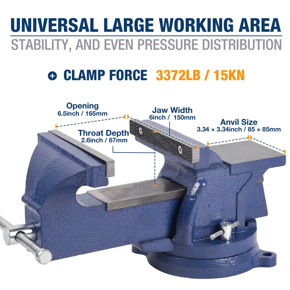 4" / 6“ Multipurpose Vise Bench Vise Heavy Duty Multi-Jaw Vise 360-Degree NEW Details: 【Durable and Sturdy】 : our bench vise is made from high-strength Ductile iron 60,000 PSI. 【Technical Specs】 : Jaw Width: 6" x Jaw Opening: 6.5" x Throat Depth: 2.6",Clamp force: 3372lbs, Equipped with a large 1.7" x 1.9" anvil work surface. 【Swivel Base】: With a 360-degree swivel design and swivel base, our bench vise allows for greater accuracy and ease of use. 【Multifunctional】: This bench vise that can securely hold both flat materials,great for woodworkers, fitters, etc., and this bench vise can hold wood, aluminum alloy, steel, plastic and other materials. 【Stable and Easy to Install】: Whether you're a beginner or a seasoned pro, our bench vise is incredibly easy to install and provides a stable base for all your projects. Perfect for home use or small workshops. Whether you are working with wood or metal at home or in the shop, the 6" heavy duty workshop bench vise provides the maximum clamping and holding power needed to get the job done with confidence. Specifications: Model: 6" Bench Vise Material: Ductile Iron Clamp Force: 3372LB Jaw Width: 6" Throat Depth: 2.6" Maximum Opening of Jaw: 6.5" Anvil Size: 1.7" x 1.9" Swivel Base: 360 Degree Item Size: 13.6 × 6.1 × 6.8" Weight: 25.57 lbs Package Size: 13.7 × 6.7 × 7" Weight: 26.5 lb Sturdy and Durable Constructed with high-strength forged steel(60,000PSI), this bench vice can withstand high clamping pressure without breaking. Large jaw working surface The anvil working surface is solid and wide, which is convenient for machining various parts. Swivel Base With a 360-degree swivel locking base design, our swivel vise allows for greater accuracy and ease of use. No need to constantly insert and remove your workpiece. Stable and Easy to Install Whether you're a beginner or a seasoned pro, our bench vice is incredibly easy to install. Non-slip jaws The jaws are forged with 45# steel and then heat-treated, with a fish scale jaw surface and a high hardness pressure plate for anti-slip treatment. Use in multiple scenarios The smooth and dependable action bench vise is ideal for professional use, home, workshop, educational institution use, providing clamping for light applications, such as cutting conduit, drilling, gluing, woodworking, metalworking, sanding or planing, sawing and so on. FAST SHIPPING WARRANTY EASY RETURNS CONTACT US FAST SHIPPING We only ship to US mainland 48 states and worldwide via ebay international shipping program. We don't offer direct international shipping. Consult us if you live in Hawaii, Alaska or Virgin Islands. Also we don't ship to any APO/FPO/PO BOX address. We offer FedEx Ground or Home delivery in optional which can make it faster, charge additional shipping fee. Delivery is any day from 1-5 business days (Monday through Friday, excluding weekends and holidays) WARRANTY This item is covered by our 12 months unlimited mileage warranty. Any customer may use the same outlets to facilitate a return or warranty claim. Any item must be returned within 30 days of the original purchase for refund; item(s) retaining a warranty may be returned beyond 30 days but within the remaining warranty period. Returns that are not subject to warranty may accrue a restocking fee and should be returned at the customers cost. We reserves the right to request proof of purchase and mechanical failure in the event of any warranty claim; any returns or claims that violate Ebay's Online Return policies will be reported. We holds no responsibility or liability for additional repairs, damages (punitive or non-punitive), loss of time, or any other extraneous circumstances created by a purchase made from said party. EASY RETURNS We understand that sometimes you need to make a return or an exchange. All we ask is you send it back in the same condition it was received - new and un-used. If the product you receive is not the one you ordered, please take photos of any visible of visual reference and contact us directly; photos must be CLEAR and VISIBLE. Logistical claims must be filed within 30 days of received the product; exchanges in these cases will be handled promptly and at?no cost to the customer. In order to process a return or exchange, please call us or send us a message through eBay and we will be happy to assist you immediately. However,any return that is NOT defective or NOT received in error, is the responsibility of the customer. We DO NOT cover any shipping costs and/or additional fees associated with the transaction. CONTACT US We are open Monday to Friday 8am to 5pm Mountain Standard Time, and Saturday 9am to 1pm MST. Our friendly staff are available during these hours. Please feel free to call us, or send us a message via eBay. We aim for complete customer satisfaction and repeat business; we will be more than happy to help you feel 100% comfortable with your purchase.