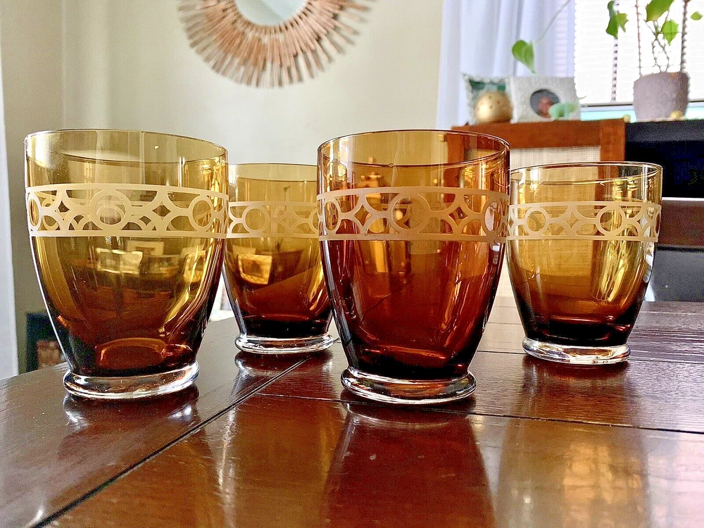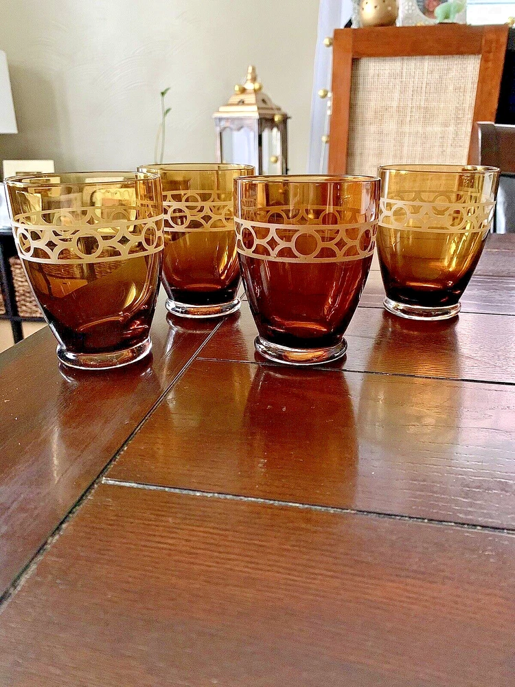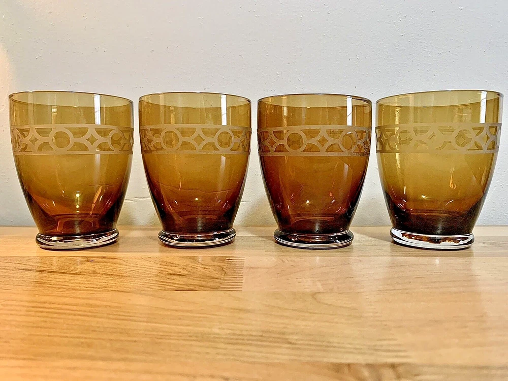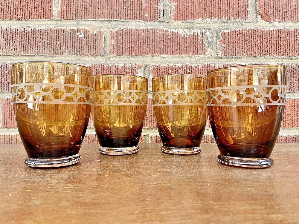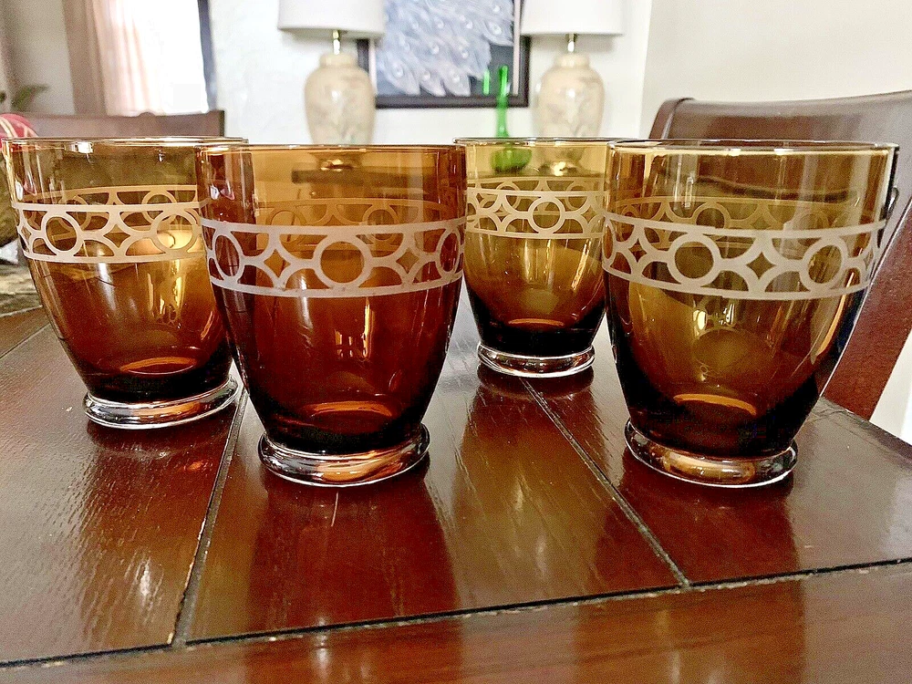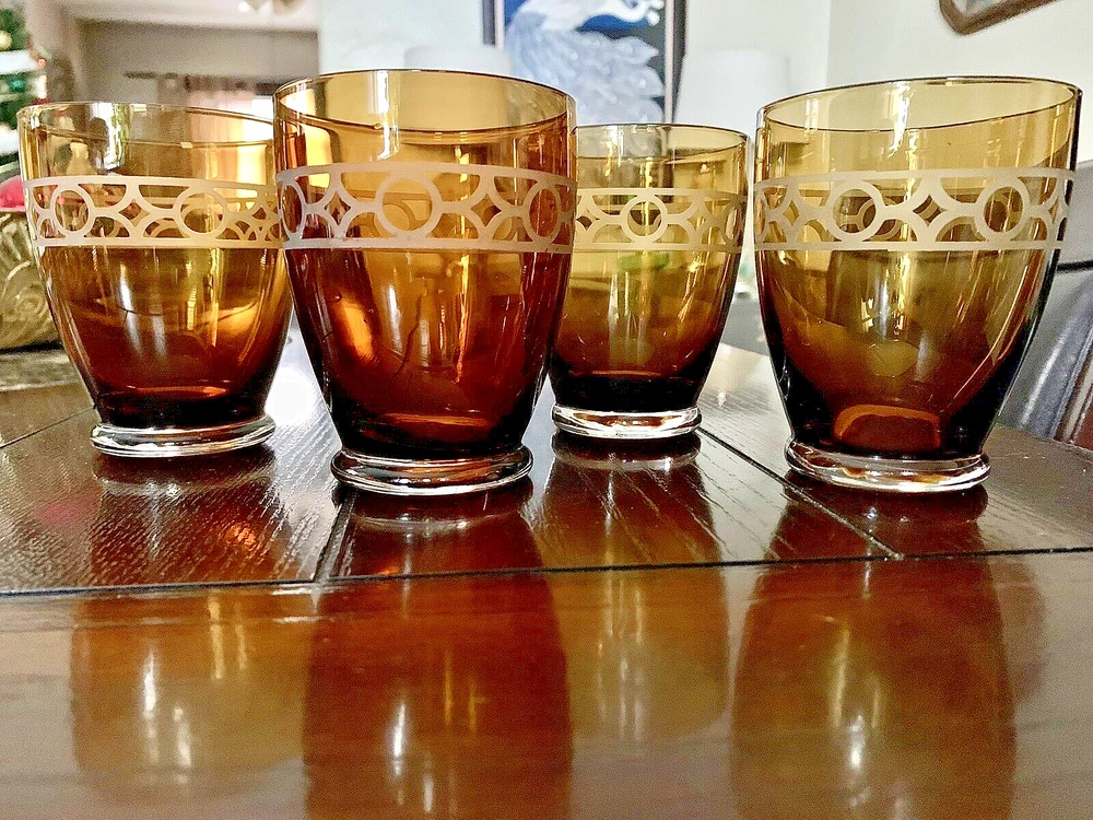 This is a set of four amber, hand blown with etched band, Artland Gazebo pattern double old fashioned glasses in excellent used condition. All etching sharp, no chips, cracks, scratches or flea bites..... Please see all photo's, as they are part of your description.... Thank you! Measurements~ Height, 4 1/4" x Width, 3" Total weight of glasses unpacked, 1 lb. & 14.5 oz. Condition~ Excellent used condition Please contact me with any questions or concerns, and thank you for looking!!!! I LOVE OUR PLANET!!! I use recycled packing materials **ALL ITEMS ARE PACKED WITH CARE, AND SHIPPED WITHIN 24 BUSINESS HOURS OF PAYMENT **SHIPPING COST REFLECTIVE OF WEIGHT/ DESTINATION AND FRAGILE NATURE OF ITEMS