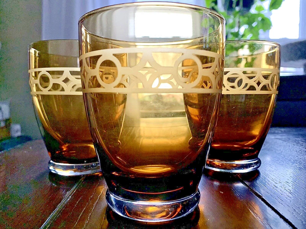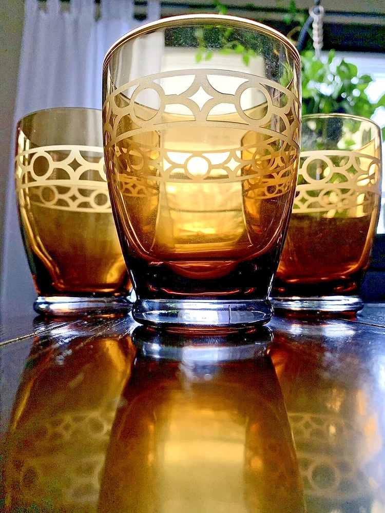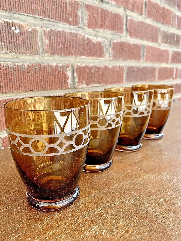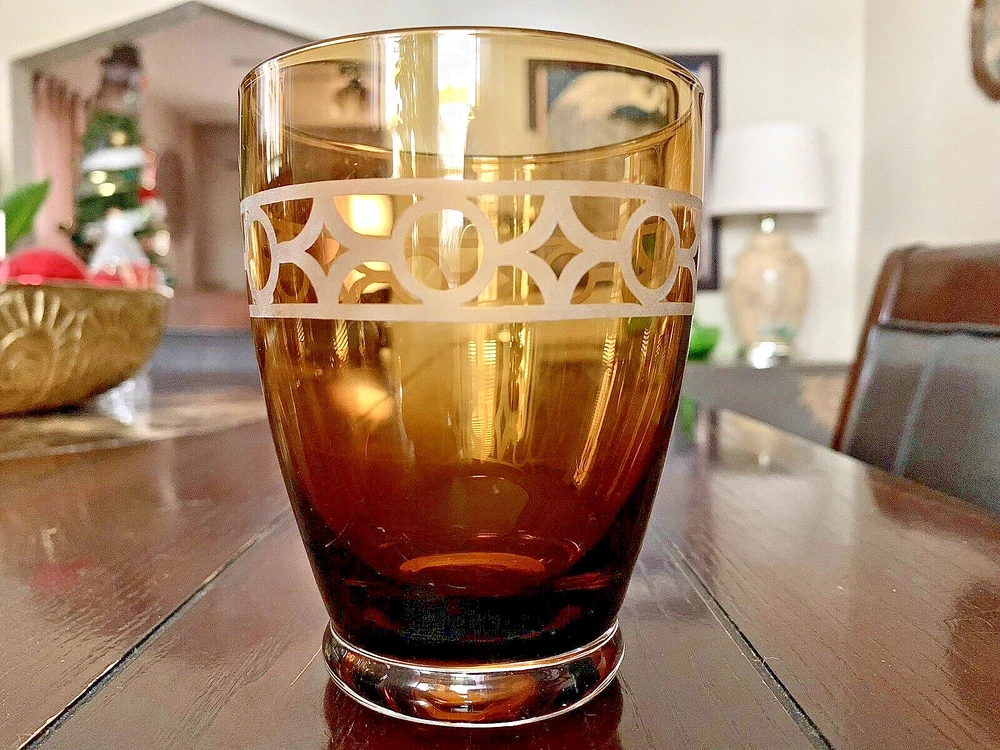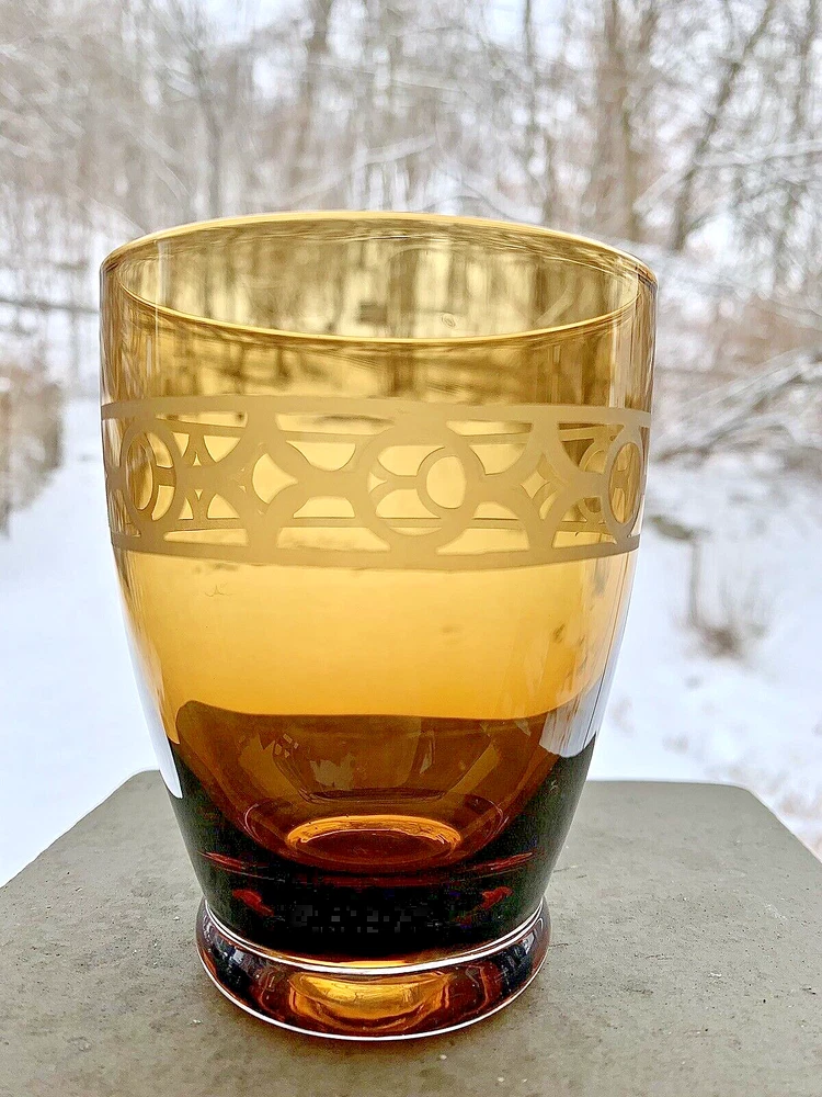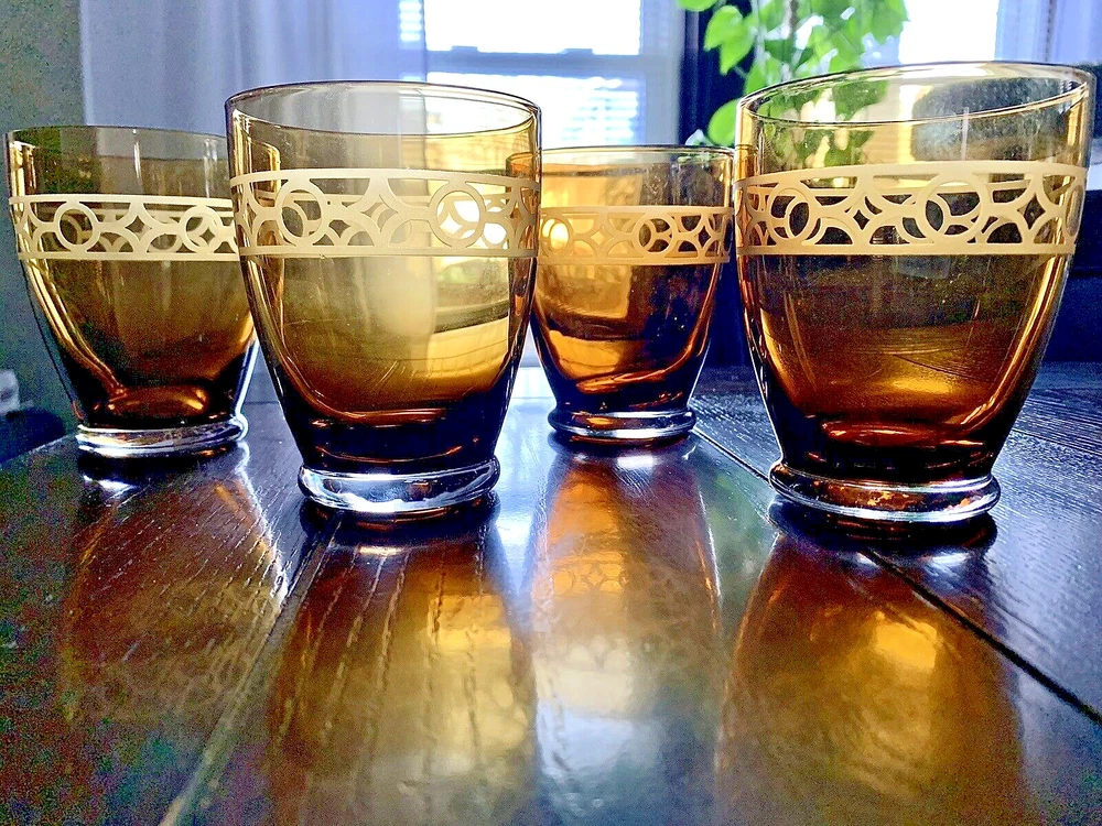 This is a set of four amber, hand blown with etched band, Artland Gazebo pattern double old fashioned glasses in excellent used condition. All etching sharp, no chips, cracks, scratches or flea bites..... Please see all photo's, as they are part of your description.... Thank you! Measurements~ Height, 4 1/4" x Width, 3" Total weight of glasses unpacked, 1 lb. & 14.5 oz. Condition~ Excellent used condition Please contact me with any questions or concerns, and thank you for looking!!!! I LOVE OUR PLANET!!! I use recycled packing materials **ALL ITEMS ARE PACKED WITH CARE, AND SHIPPED WITHIN 24 BUSINESS HOURS OF PAYMENT **SHIPPING COST REFLECTIVE OF WEIGHT/ DESTINATION AND FRAGILE NATURE OF ITEMS