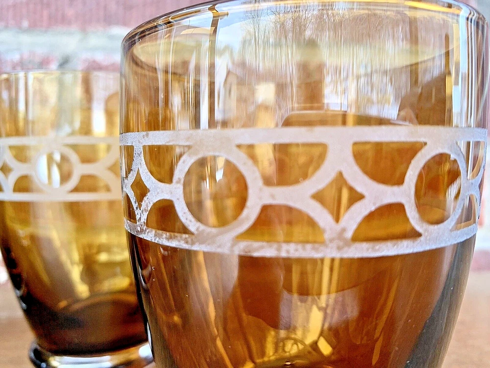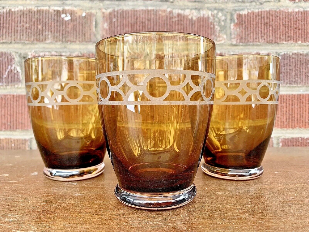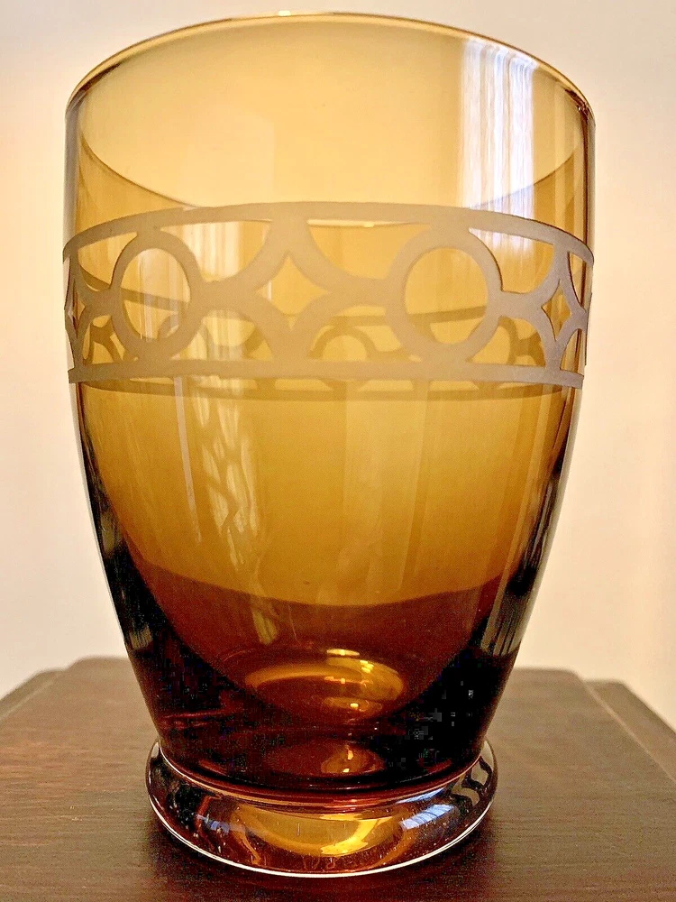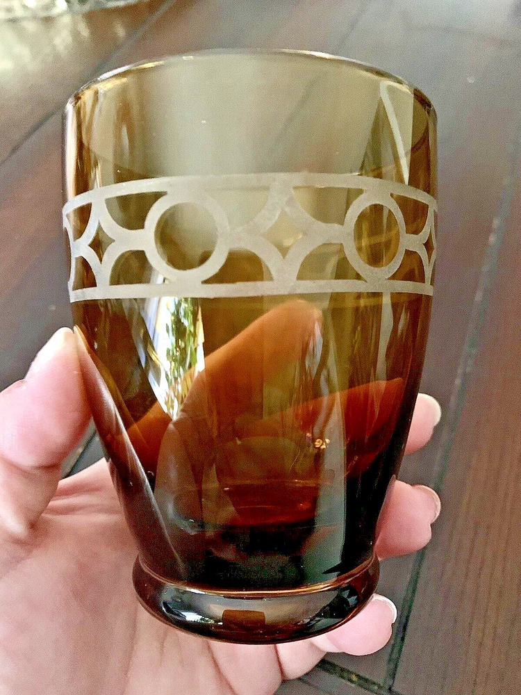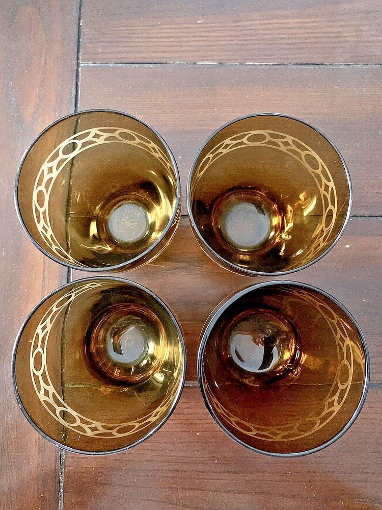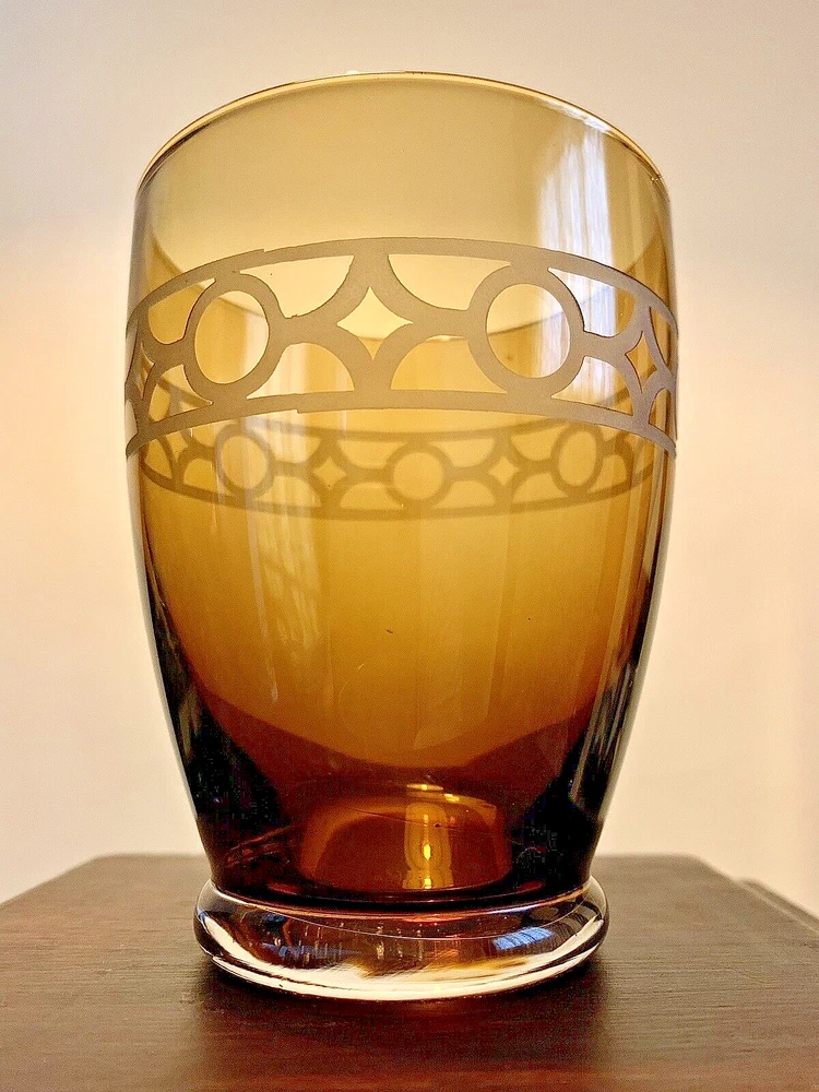 This is a set of four amber, hand blown with etched band, Artland Gazebo pattern double old fashioned glasses in excellent used condition. All etching sharp, no chips, cracks, scratches or flea bites..... Please see all photo's, as they are part of your description.... Thank you! Measurements~ Height, 4 1/4" x Width, 3" Total weight of glasses unpacked, 1 lb. & 14.5 oz. Condition~ Excellent used condition Please contact me with any questions or concerns, and thank you for looking!!!! I LOVE OUR PLANET!!! I use recycled packing materials **ALL ITEMS ARE PACKED WITH CARE, AND SHIPPED WITHIN 24 BUSINESS HOURS OF PAYMENT **SHIPPING COST REFLECTIVE OF WEIGHT/ DESTINATION AND FRAGILE NATURE OF ITEMS