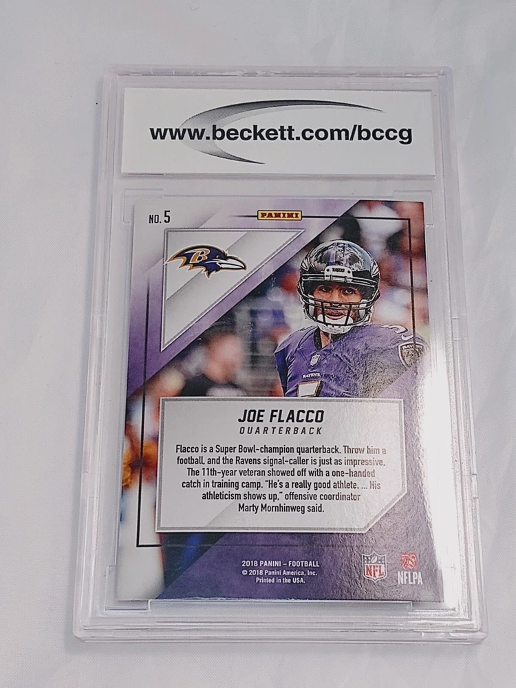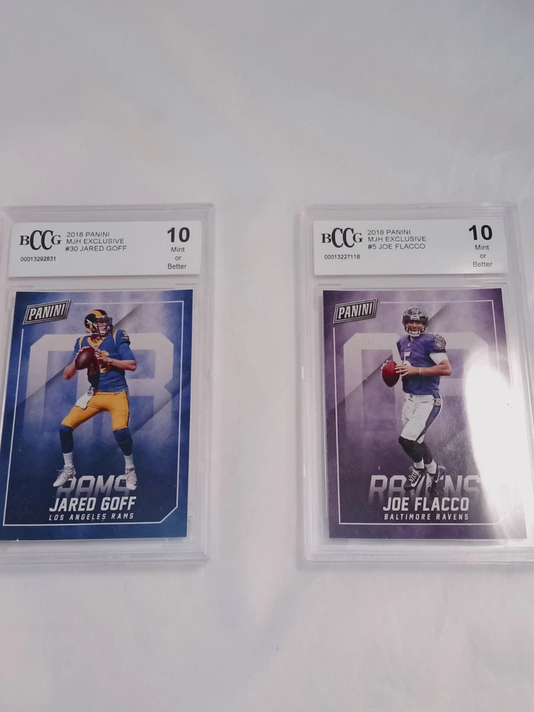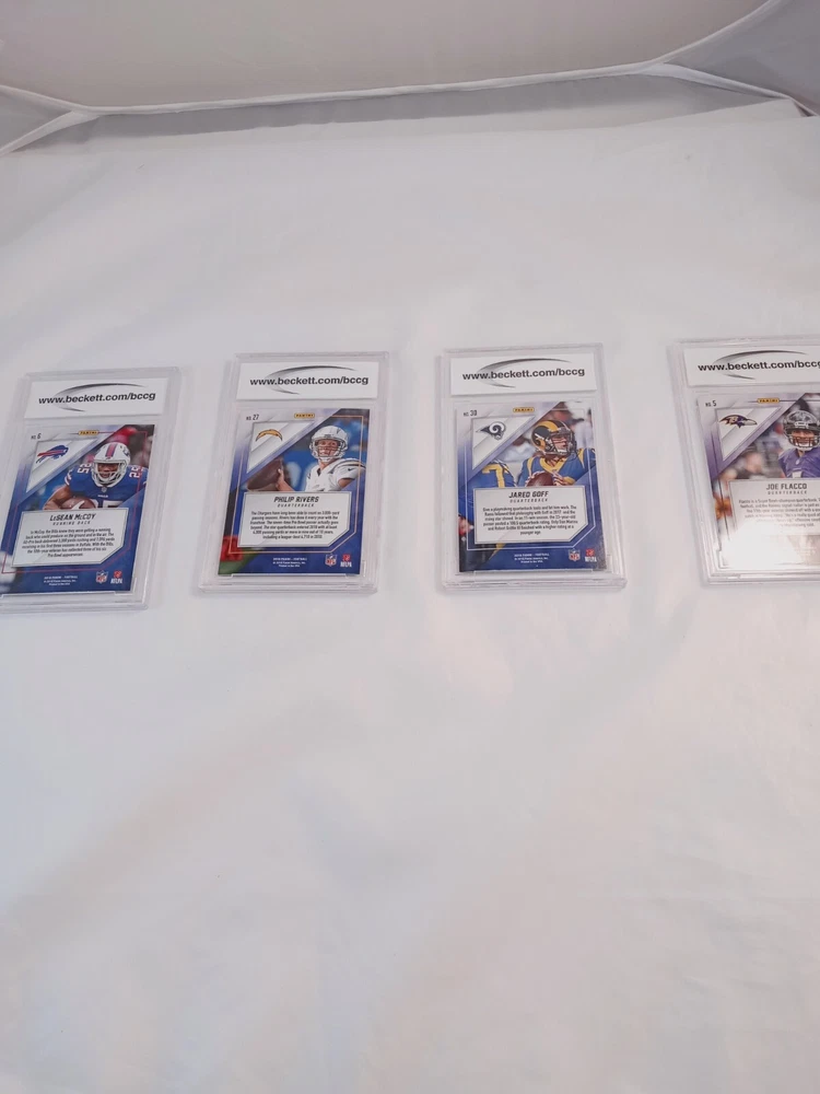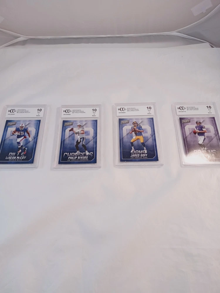 This lot features four graded cards from the BCCG grading company. The cards feature players from the National Football League (NFL) including Jared Goff, Philip Rivers, Lesean Mccoy, Joe Flacco, and Jared Goff. The cards were manufactured by Panini in 2017 and are from the 2018 season. This lot is perfect for any football fan looking to add to their trading card collection.