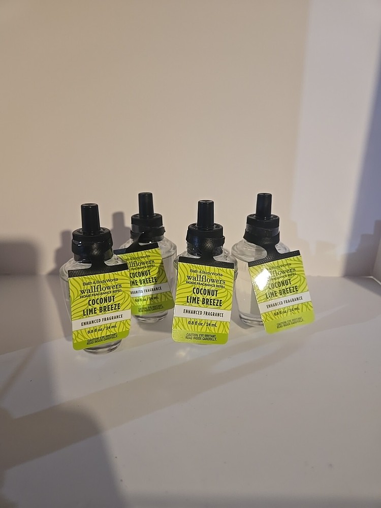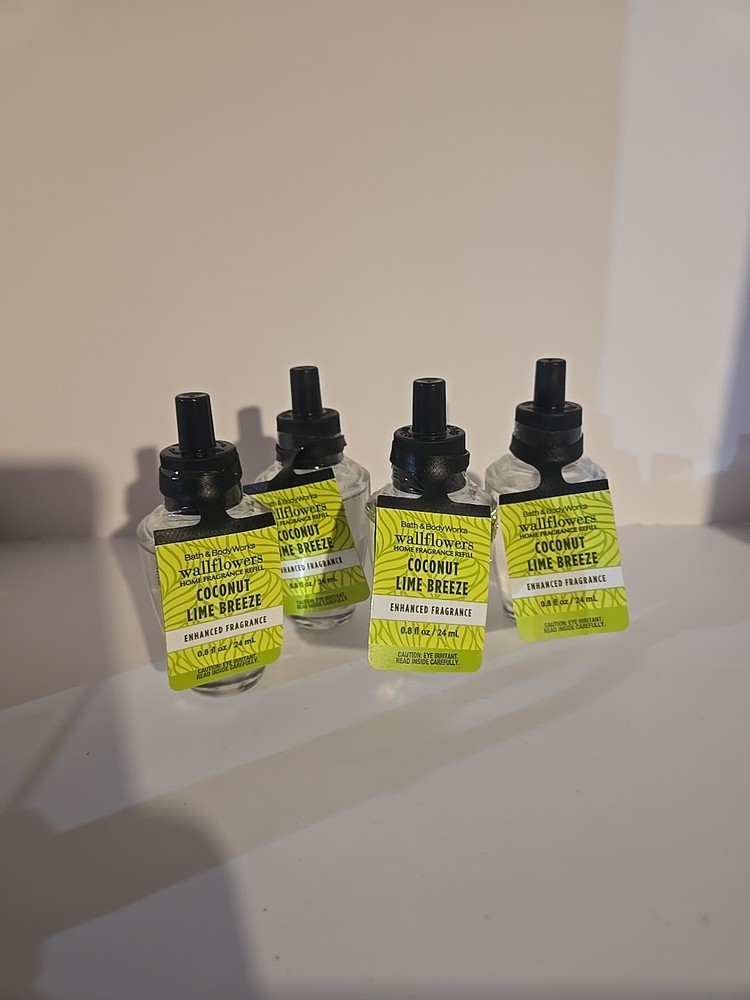 The product is a set of 4 Bath & Body Works COCONUT LIME BREEZE Wallflowers Refills. Each refill contains 0.8 fl oz of oil in a citrus-themed fragrance. The refills are designed for wall plug-in power source and are in the color green. They are original Bath and Body Works products made in the United States.
