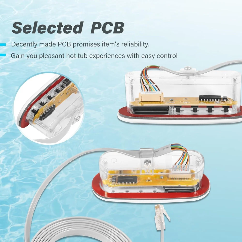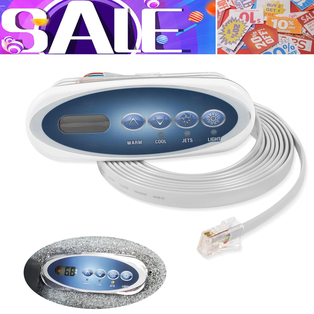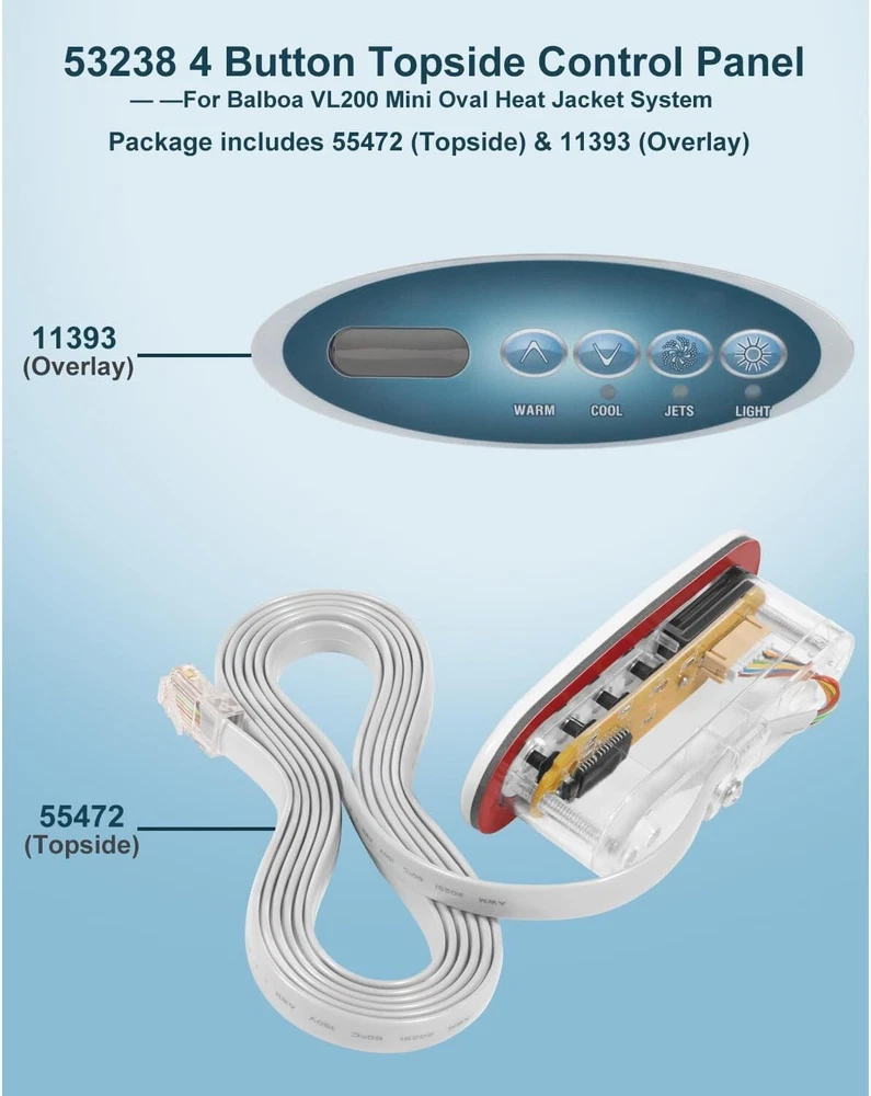 Fitment: This 4-Button Topside Control Panel is only fit for Balboa Heat Jacket Systems Features: 1) Part number is 53238. It can also replace for the following part numbers: 53636, 53280, MAS25, 52361, 407012, Topside Panel with Overlay 407016, 407014 2) This Topside Panel has 4 buttons, namely WARM, COOL, JETS and LIGHT, with LCD display on left. It uses a phone-type connector, 8-wire, with 7ft cord (About 85 inches). With Large & easy-to-read displays, Reliable communication interface, and Water-resistant connector 3) The Hot Tub Topside Control Panel can control the water temperature, light, and jets, allowing you to easily adjust the mode you need in the pool, giving you a pleasant and comfortable spa experience 4) The 53238 Topside Control Panel is made of durable material, anti-rust, anti-corrosion and long-lasting. Easy to install, no need any complicated tools Package included: 4-Button Topside Control Panel