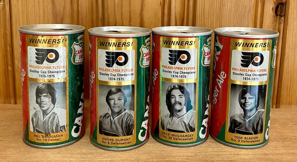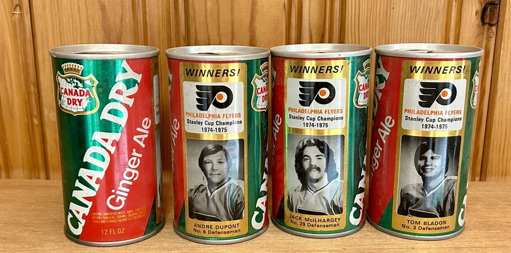 This is a set of four original soda cans from the 1974-1975 Philadelphia Flyers season featuring Canada Dry branding. The colorful cans are in excellent condition and would make a great addition to any soda can or sports memorabilia collection. These cans are original and have not been modified in any way. They were manufactured in the United States and are a must-have for any soda or hockey fan.