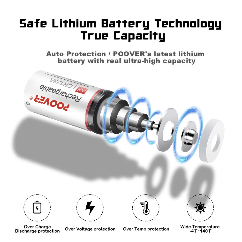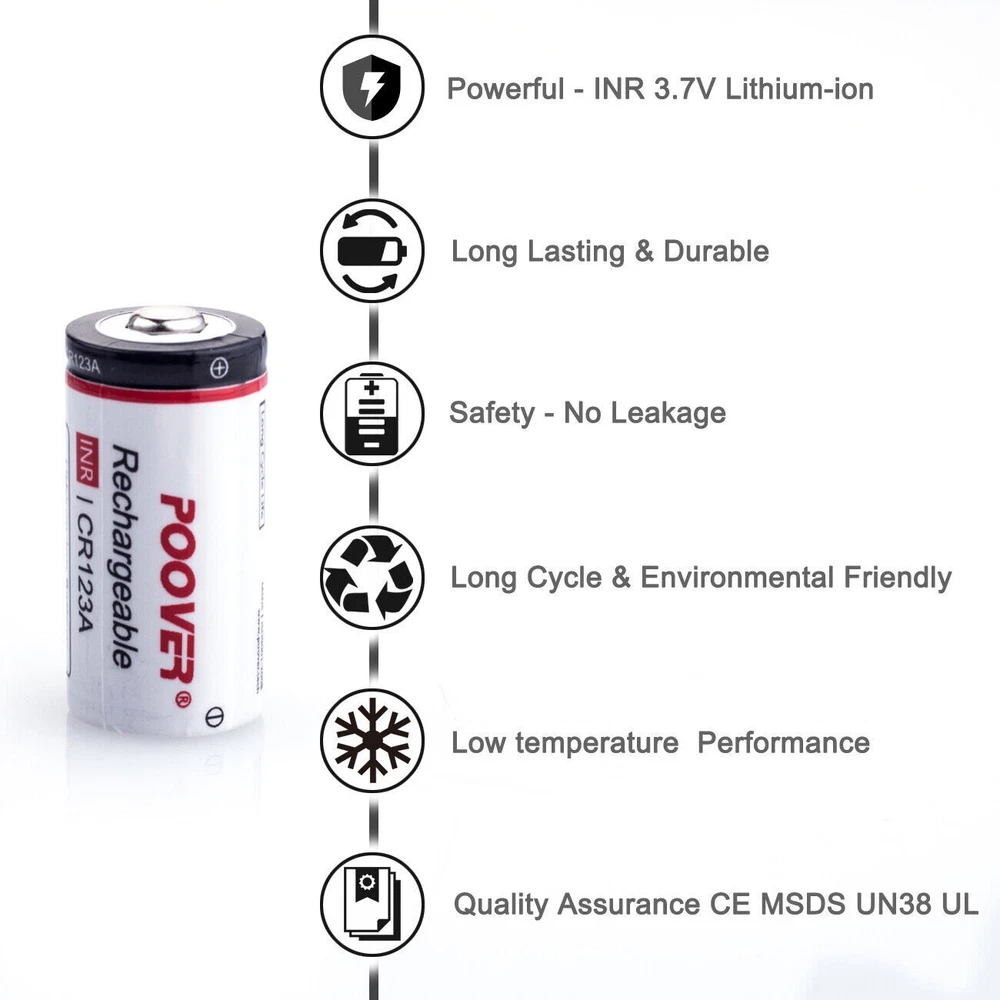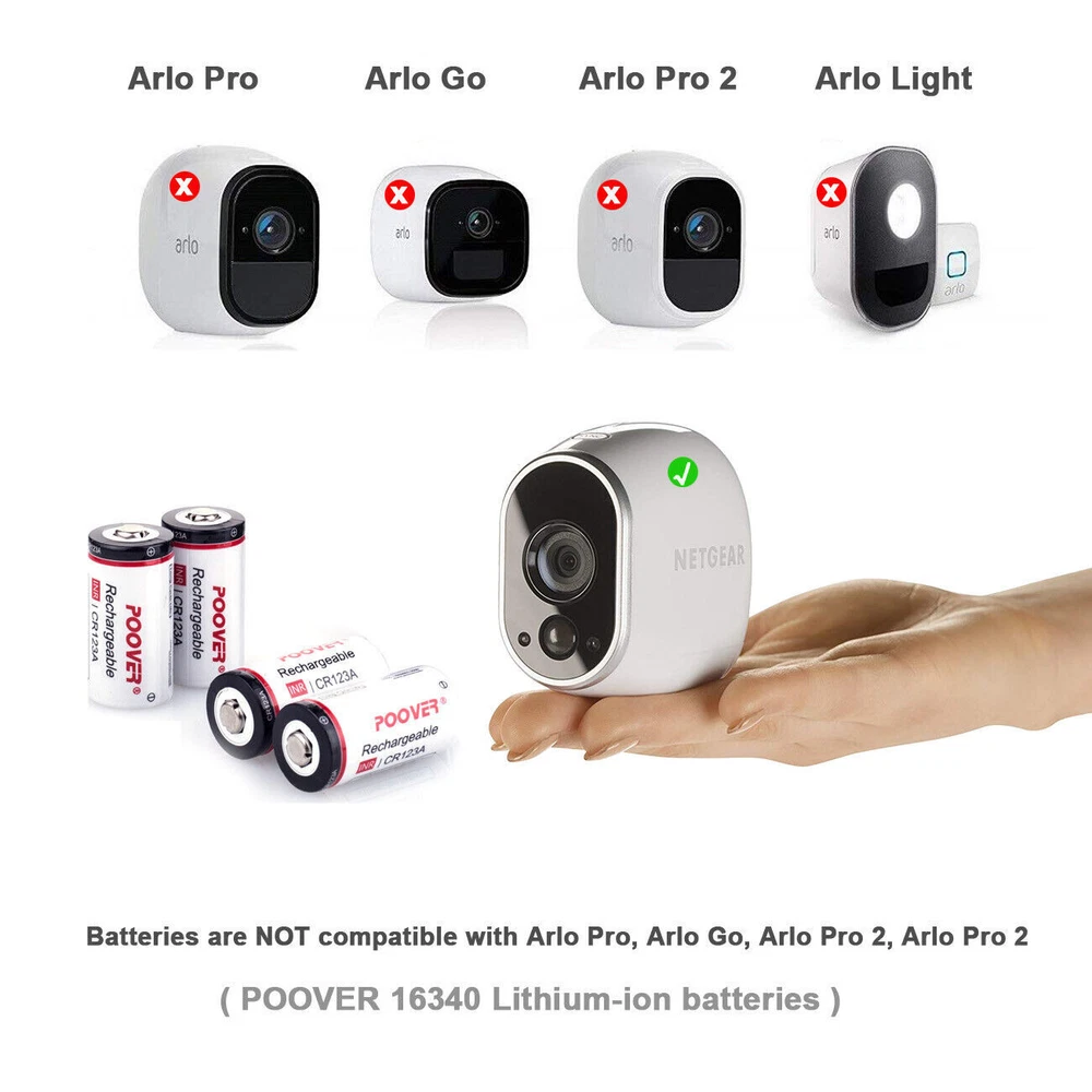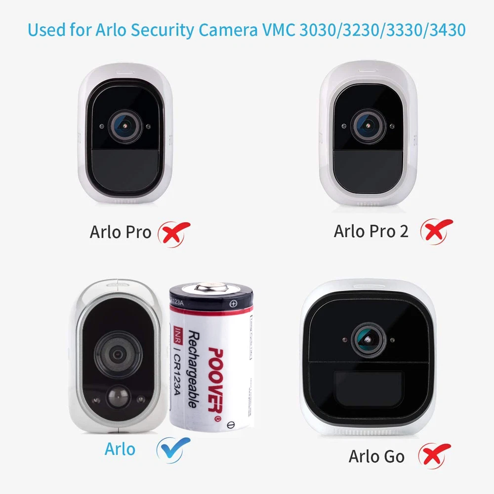 High PERFORMANCE -- POOVER Rechargeable CR123A Batteries are specifically designed for Arlo Security Cameras(Arlo VMC3030 VMK3200 VMS3330 3430 3530). Optimization techniques for energy utilization are applied to boost the performance, lasting 21.8% longer than other RCR123A batteries. Strengthened loops prevent the battery from quick self-discharging.(NOTE:Charger cannot charge non-rechargeable batteries) FAST CHARGER & SAFE -- CR123A charger charge time about 4-Hour @ 2A Charge Current,with LED indicator light. Red when charging and green when the charging is complete.Built with mischarging safety technology, it will smartly detect and cut off power Manufactured from durable and resistant materials, helps extend the life of the charger. Over Charge Protection, Over Current Protection, Over Voltage Protection, Short Circuit Protection. HIGH CAPACITY & GREAT SAVINGS -- CR123A Rechargeable Batteries high capacity 750mAh,3.7v. The reusable CR123A batteries can be fully charged up to 1000 times. Compared with non-rechargeable batteries, it is a valuable investment in prompting perfect batteries that save money in long life using. Try this environment-friendly Lithium-ion battery in your Arlo security camera now. 100% BRAND GUARANTEE -- 30-Day Full Refund Guarantee and 6 Months Warranty, If you are not satisfied with this Arlo Rechargeable Battery Set, let us know and you will be offered a full refund or free replacement. Enjoy this absolutely RISK FREE purchase. Rechargeable 16340 / CR123A 3.7V INR lithium ion battery technical data : Standard voltage: 3.7Volt Charging voltage : 4.20V±0.05V Discharge termination voltage: 2.75V ± 0.05V Standard charging current: 0.2C (0.2 x 750 = 150mA) Maximum discharge current: 1C (1 x 750 = 750mA) Ambient temperature: Charging:-77℉ ~ 140℉ C Battery Dimensions: 16*34 (mm) Net weight: 16 (g) / pc 【Replace Disposable Battery】123, 123A, BR2/3A, CR123, CR123A, CR123R, CR17335, CR17345, DL123A, EL123AP, K123LA, L123A, SF123A, VL123A, 5018LC. Universal cr123a Battery charger Input power : DC 5V/ 2A Micro USB Cut-off current (constant voltage charging) <100mA Standby current <15.0mA Rechargeable battery type: Lithium-ion (Li-ion), Ni-MH, Ni-CD, IFR (LiPoFe) Rechargeable battery specifications :AA AAA 26650 22650 26500 18650, 18490, 18350, 17670, 17500, 16340 (RCR123), 14500, 10440 On Dec 8, 2023 at 20:16:41 PST, seller added the following information: On Jun 4, 2024 at 20:24:40 PDT, seller added the following information: On Jun 10, 2024 at 19:49:28 PDT, seller added the following information: On Jun 23, 2024 at 19:31:42 PDT, seller added the following information: On Jul 15, 2024 at 18:30:49 PDT, seller added the following information: On Jul 21, 2024 at 17:44:12 PDT, seller added the following information: On Aug 6, 2024 at 21:51:48 PDT, seller added the following information: On Aug 12, 2024 at 16:06:32 PDT, seller added the following information: On Aug 20, 2024 at 18:36:55 PDT, seller added the following information: On Aug 25, 2024 at 19:07:17 PDT, seller added the following information: On Sep 1, 2024 at 18:24:37 PDT, seller added the following information: On Sep 16, 2024 at 05:20:35 PDT, seller added the following information: On Sep 25, 2024 at 10:55:57 PDT, seller added the following information: On Oct 6, 2024 at 16:06:56 PDT, seller added the following information: On Oct 14, 2024 at 16:07:23 PDT, seller added the following information: On Dec 10, 2024 at 07:57:17 PST, seller added the following information: On Jan 8, 2025 at 09:03:56 PST, seller added the following information: