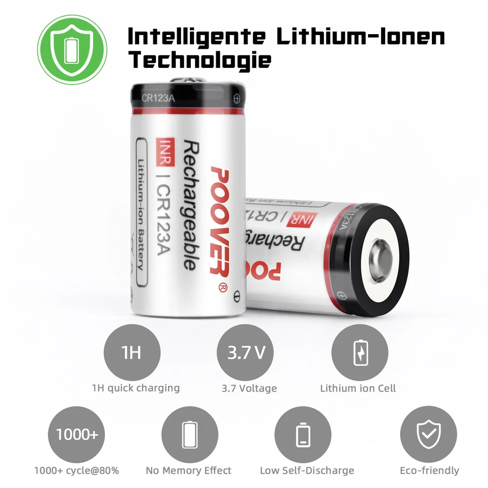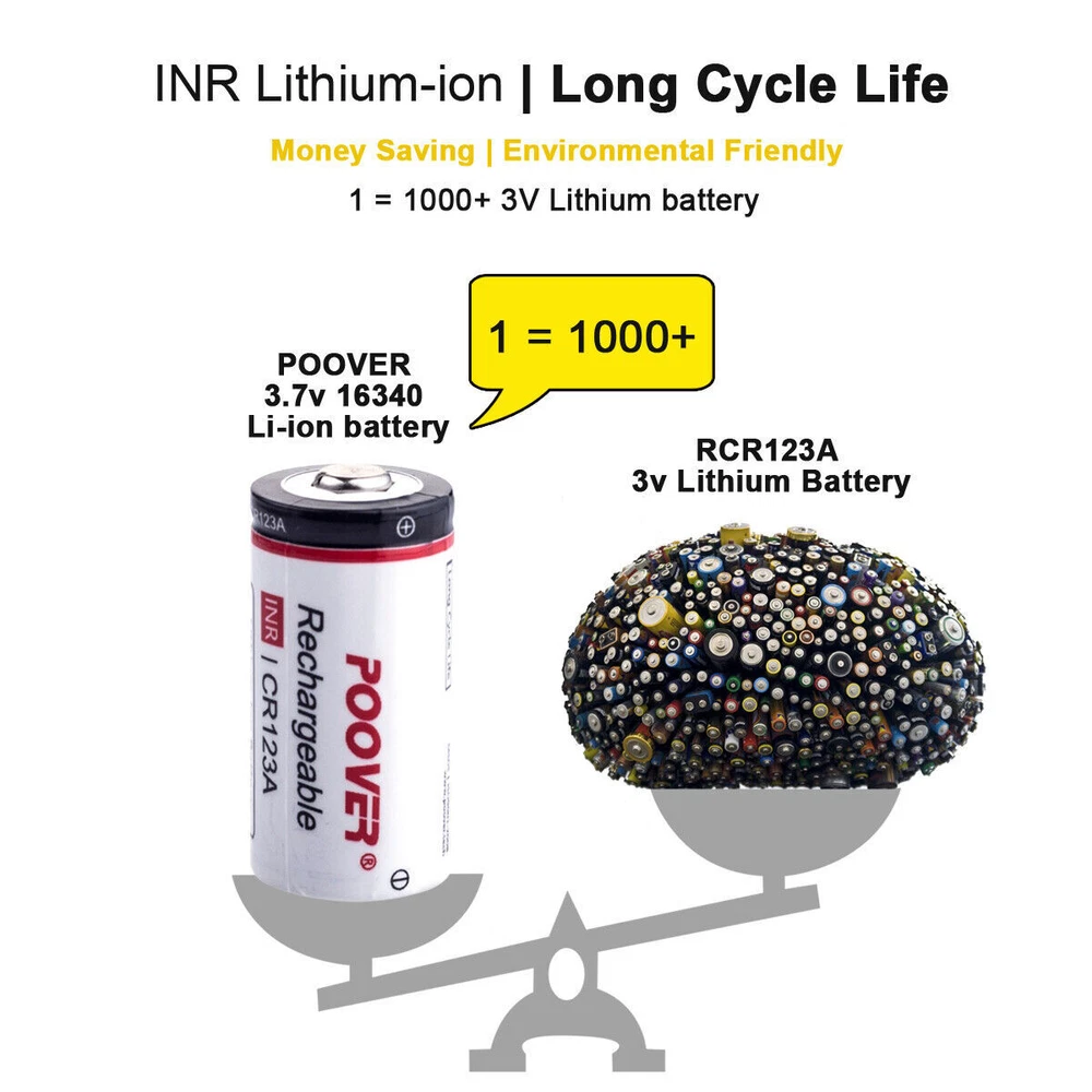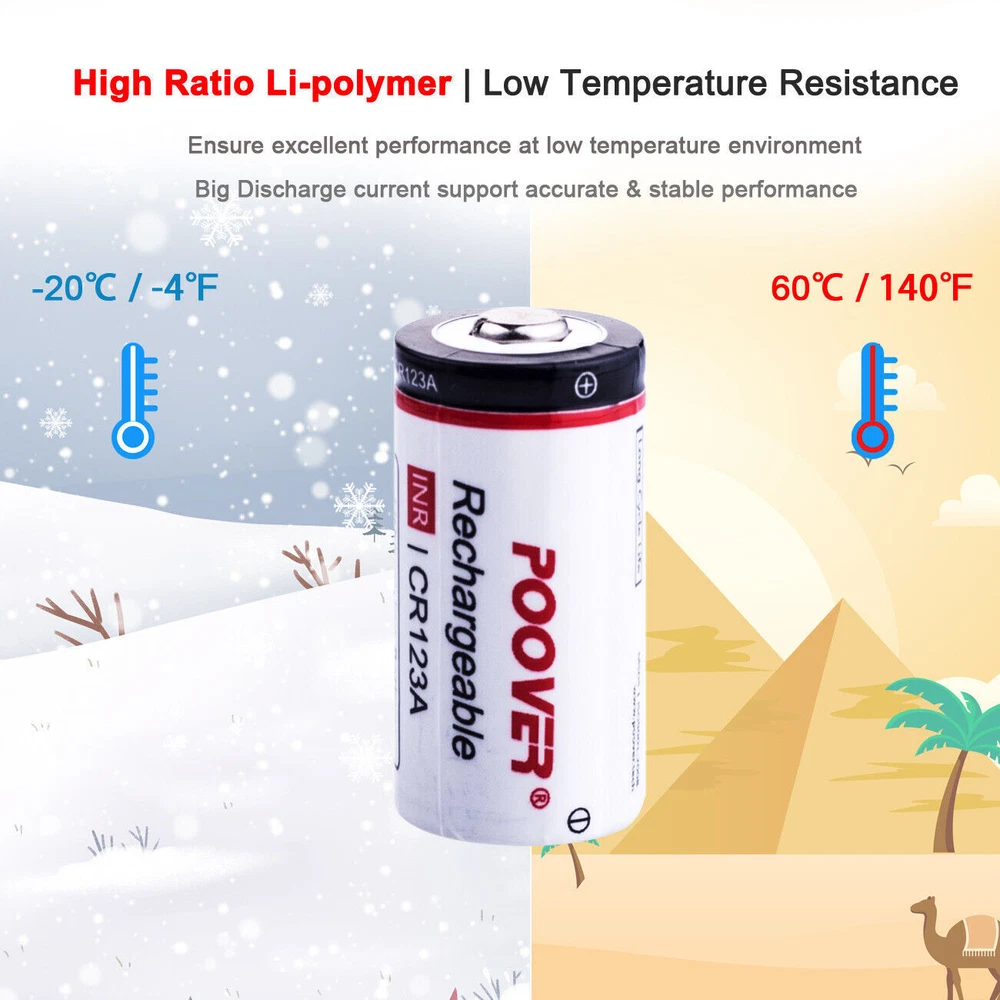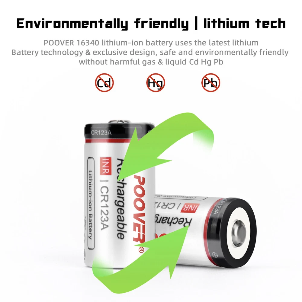 High PERFORMANCE -- POOVER Rechargeable CR123A Batteries are specifically designed for Arlo Security Cameras(Arlo VMC3030 VMK3200 VMS3330 3430 3530). Optimization techniques for energy utilization are applied to boost the performance, lasting 21.8% longer than other RCR123A batteries. Strengthened loops prevent the battery from quick self-discharging.(NOTE:Charger cannot charge non-rechargeable batteries) FAST CHARGER & SAFE -- CR123A charger charge time about 4-Hour @ 2A Charge Current,with LED indicator light. Red when charging and green when the charging is complete.Built with mischarging safety technology, it will smartly detect and cut off power Manufactured from durable and resistant materials, helps extend the life of the charger. Over Charge Protection, Over Current Protection, Over Voltage Protection, Short Circuit Protection. HIGH CAPACITY & GREAT SAVINGS -- CR123A Rechargeable Batteries high capacity 750mAh,3.7v. The reusable CR123A batteries can be fully charged up to 1000 times. Compared with non-rechargeable batteries, it is a valuable investment in prompting perfect batteries that save money in long life using. Try this environment-friendly Lithium-ion battery in your Arlo security camera now. 100% BRAND GUARANTEE -- 30-Day Full Refund Guarantee and 6 Months Warranty, If you are not satisfied with this Arlo Rechargeable Battery Set, let us know and you will be offered a full refund or free replacement. Enjoy this absolutely RISK FREE purchase. Rechargeable 16340 / CR123A 3.7V INR lithium ion battery technical data : Standard voltage: 3.7Volt Charging voltage : 4.20V±0.05V Discharge termination voltage: 2.75V ± 0.05V Standard charging current: 0.2C (0.2 x 750 = 150mA) Maximum discharge current: 1C (1 x 750 = 750mA) Ambient temperature: Charging:-77℉ ~ 140℉ C Battery Dimensions: 16*34 (mm) Net weight: 16 (g) / pc 【Replace Disposable Battery】123, 123A, BR2/3A, CR123, CR123A, CR123R, CR17335, CR17345, DL123A, EL123AP, K123LA, L123A, SF123A, VL123A, 5018LC. Universal cr123a Battery charger Input power : DC 5V/ 2A Micro USB Cut-off current (constant voltage charging) <100mA Standby current <15.0mA Rechargeable battery type: Lithium-ion (Li-ion), Ni-MH, Ni-CD, IFR (LiPoFe) Rechargeable battery specifications :AA AAA 26650 22650 26500 18650, 18490, 18350, 17670, 17500, 16340 (RCR123), 14500, 10440 On Dec 8, 2023 at 20:16:41 PST, seller added the following information: On Jun 4, 2024 at 20:24:40 PDT, seller added the following information: On Jun 10, 2024 at 19:49:28 PDT, seller added the following information: On Jun 23, 2024 at 19:31:42 PDT, seller added the following information: On Jul 15, 2024 at 18:30:49 PDT, seller added the following information: On Jul 21, 2024 at 17:44:12 PDT, seller added the following information: On Aug 6, 2024 at 21:51:48 PDT, seller added the following information: On Aug 12, 2024 at 16:06:32 PDT, seller added the following information: On Aug 20, 2024 at 18:36:55 PDT, seller added the following information: On Aug 25, 2024 at 19:07:17 PDT, seller added the following information: On Sep 1, 2024 at 18:24:37 PDT, seller added the following information: On Sep 16, 2024 at 05:20:35 PDT, seller added the following information: On Sep 25, 2024 at 10:55:57 PDT, seller added the following information: On Oct 6, 2024 at 16:06:56 PDT, seller added the following information: On Oct 14, 2024 at 16:07:23 PDT, seller added the following information: On Dec 10, 2024 at 07:57:17 PST, seller added the following information: On Jan 8, 2025 at 09:03:56 PST, seller added the following information: