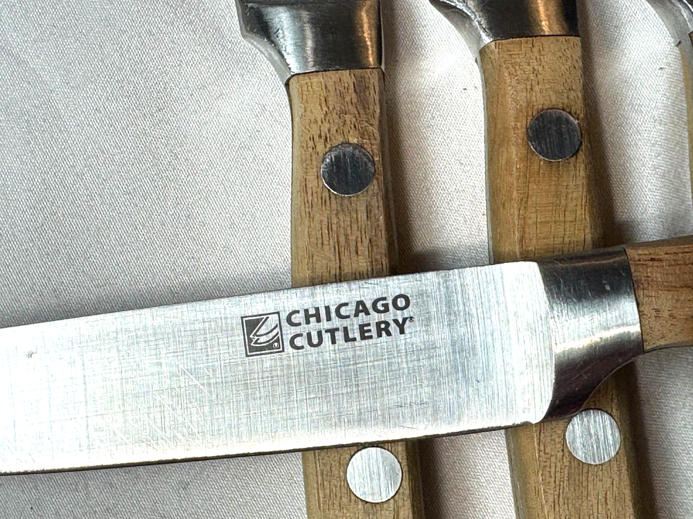 This item for sale is a set of FOUR steak knives by Chicago Cutlery made in Taiwan. The are approx 8.75 inches long and have the appearance of being used a couple times only. Please enjoy 3 pounds free insured shipping to your USA address Please check out our other items, we probably have what you need