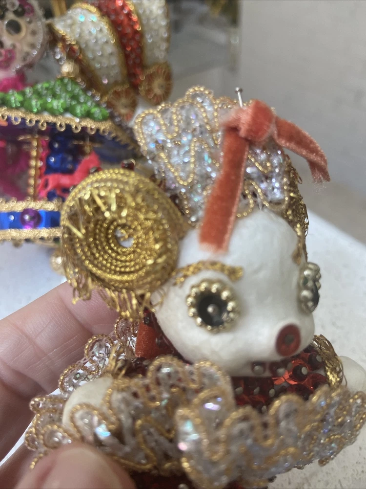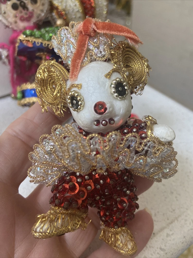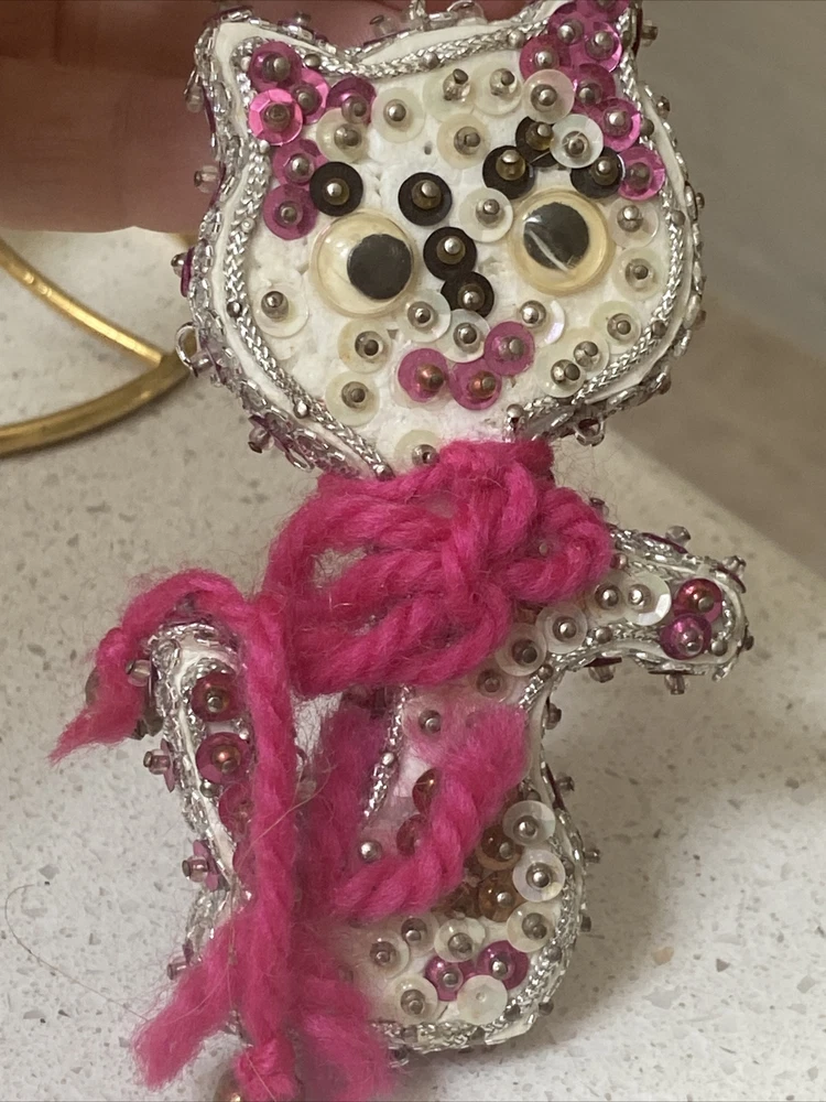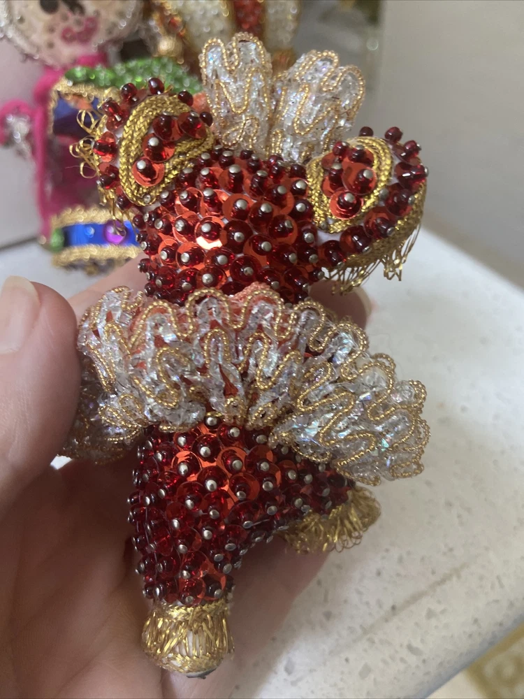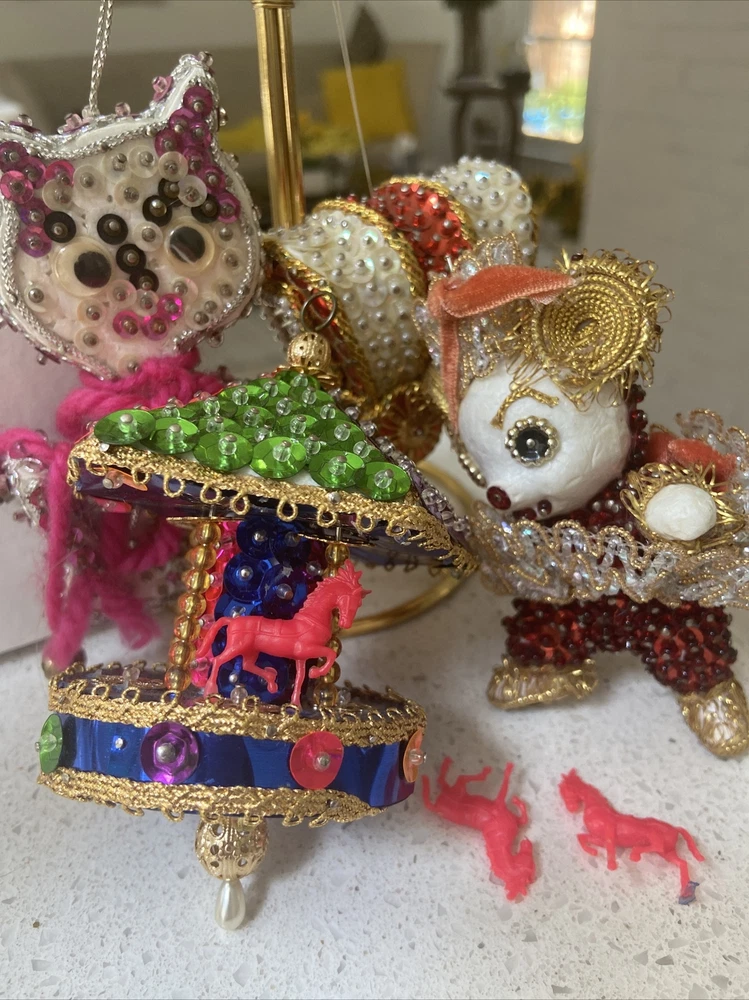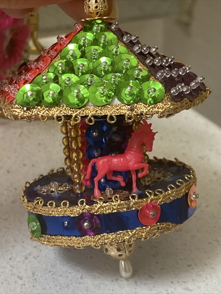 Christmas Beaded Sequin And Push Pin Ornaments Handmade Lot Of 4. For really cute ornaments I especially love the bear that is my favorite. The detail on this beautiful little ornament is incredible. They are a mixed lot sold as is they are in vintage condition. Please note the carousel the two pink horses need to be glued back on, and it will still be missing one of them back in the day they were for now we’re down to one with two that need to be reattached.