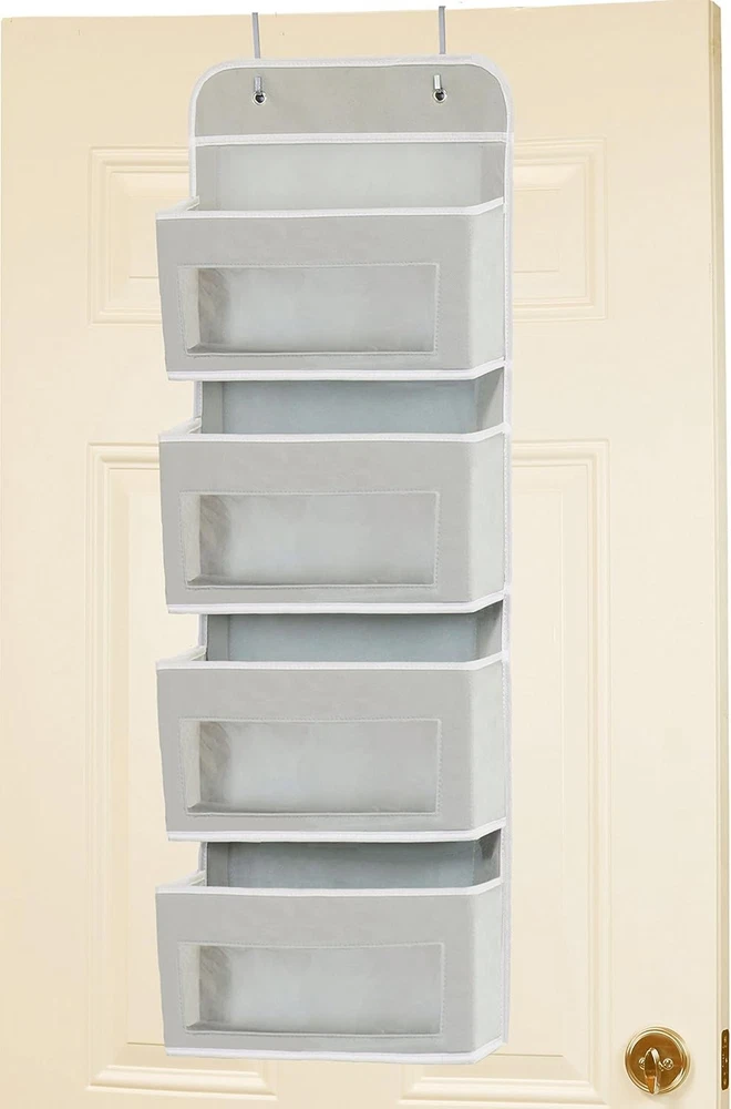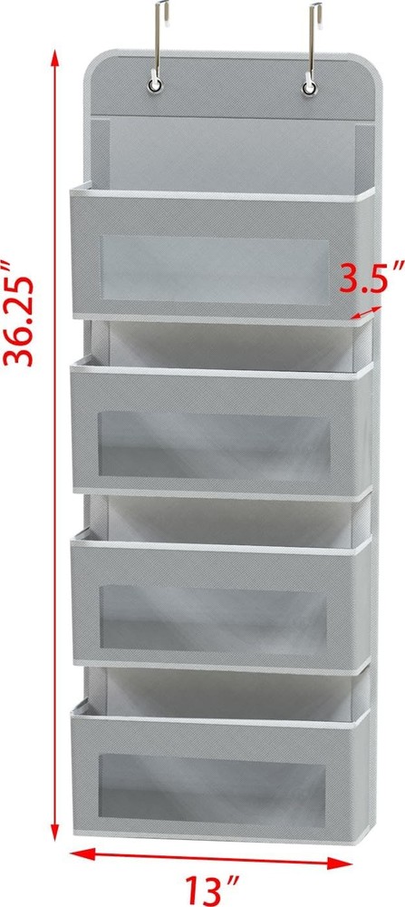 Extra storage keeps your space organized: Hangs behind a standard door to prevent clutter from accumulating while keeping essentials easily accessible and organized. Four extra-large pockets with clear windows: Each pocket is 6 inches tall, with 8.5 inches of space between pocket bottoms. The wide, tapered top design allows for easy storage of taller items like bottles, aerosol sprays, or paper towel rolls without feeling crowded. The clear front window lets you see what's inside at a glance. Easy installation, no tools required: Use the included metal hook to securely hang on most doors or closet rods. No drilling or hardware required. Comfortable and convenient access height: The organizer is located at a practical height, allowing you to easily access items without bending over. Perfect for small spaces: Suitable for bathrooms, bedrooms, apartments, or storage rooms. It's also suitable for small spaces outside the home, such as offices, classrooms, or campsites. Keep wipes, socks, or toiletries organized without taking up floor space. Compact design, large capacity: Dimensions: 13 inches wide x 36.25 inches high, tapered pockets are 4 inches deep at the top and 3.5 inches deep at the bottom. Perfect for vertical storage, taking up no floor or shelf space.