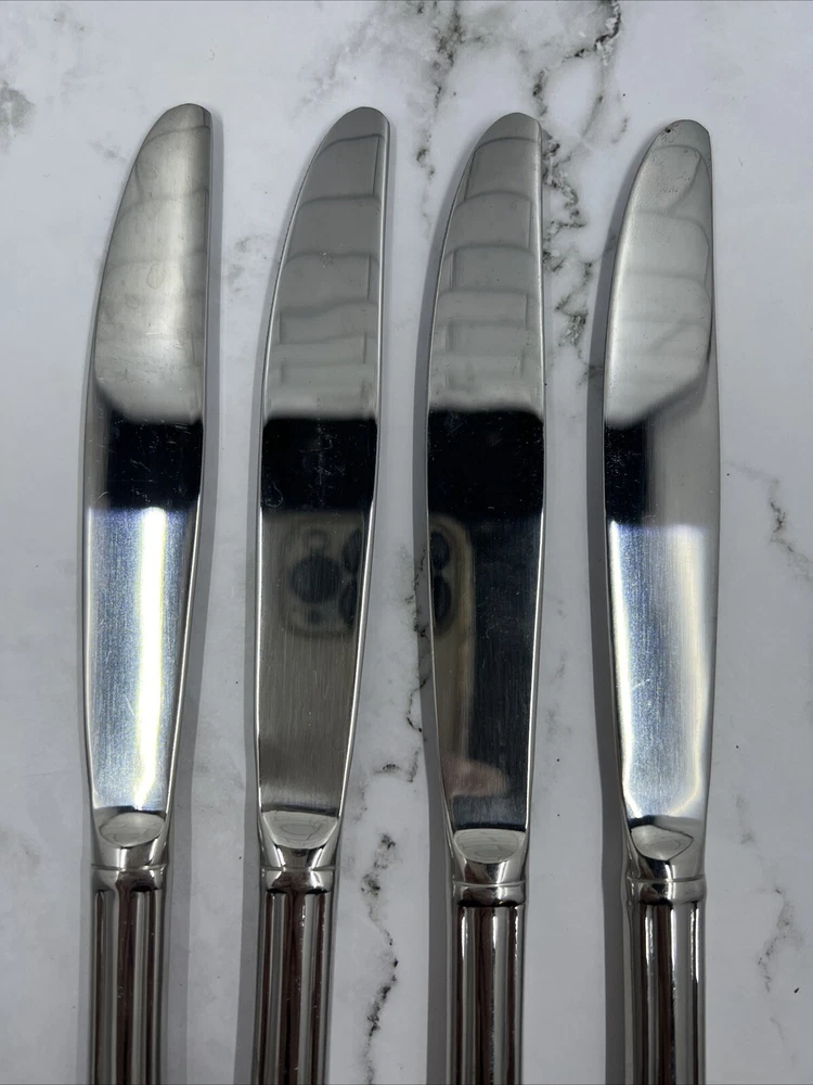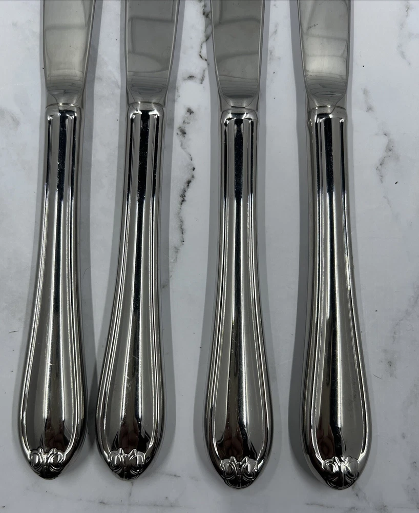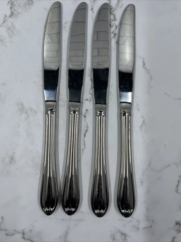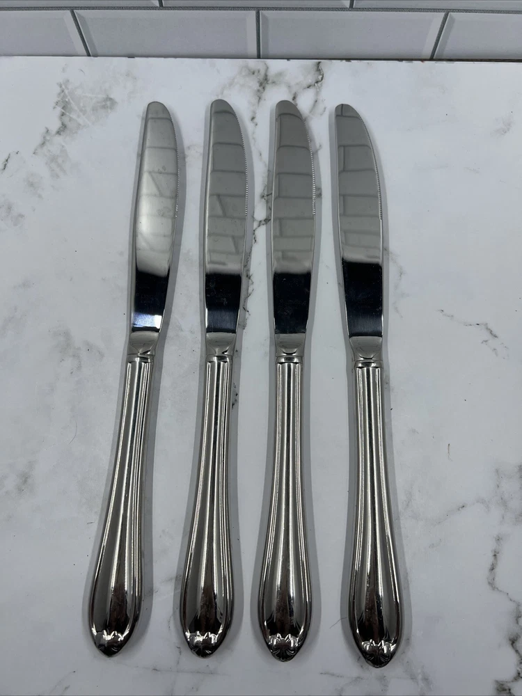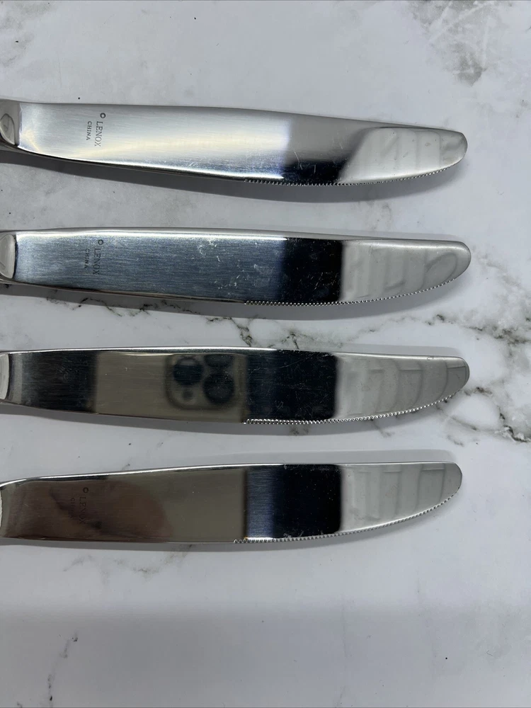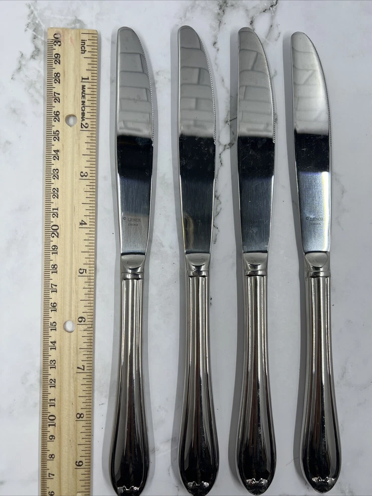 Thank you for looking, message with any questions, this is a set of 4 Lennox butterfly Meadow dinner knives see photos for condition and length . Fingerprints are free. :)