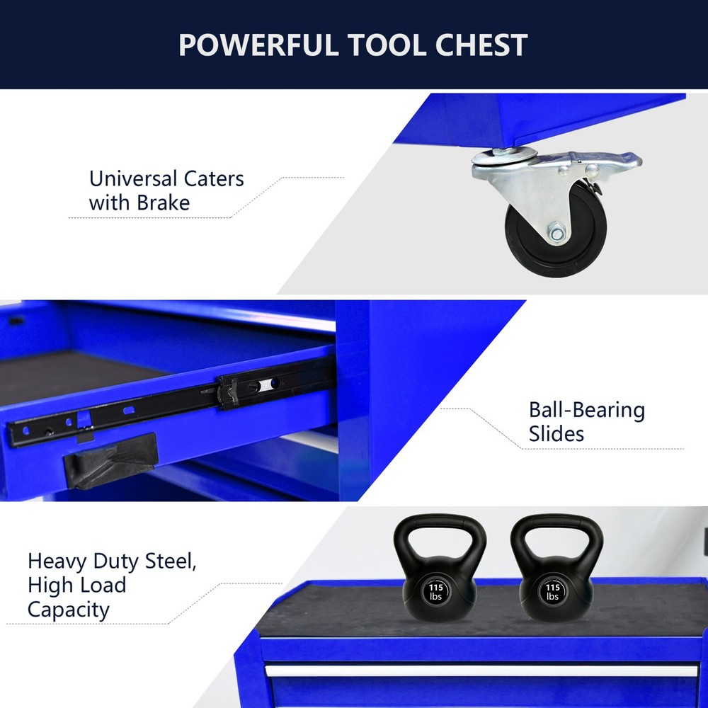Features and Details: This assembly trolley has 4 steering wheels, 2 of which with parking brakes, so you can move the trolley freely in the garage, but also stop in one place. The storage surface provides additional space for storing and arranging tools you often need. The opening and closing of the drawers of the tool cabinet is very gentle thanks to the ball-bearing drawers. The robust and powder-coated steel construction is used for high wear resistance. Specification: Color:Blue Material:Cold Rolled Steel Surface Finish :Powder Coating Casters:4" Casters (2PCS with brake and 2PCS without brake) Product Dimensions:24.25"L×13"W×29.33"H Weight (lbs.): 41.89