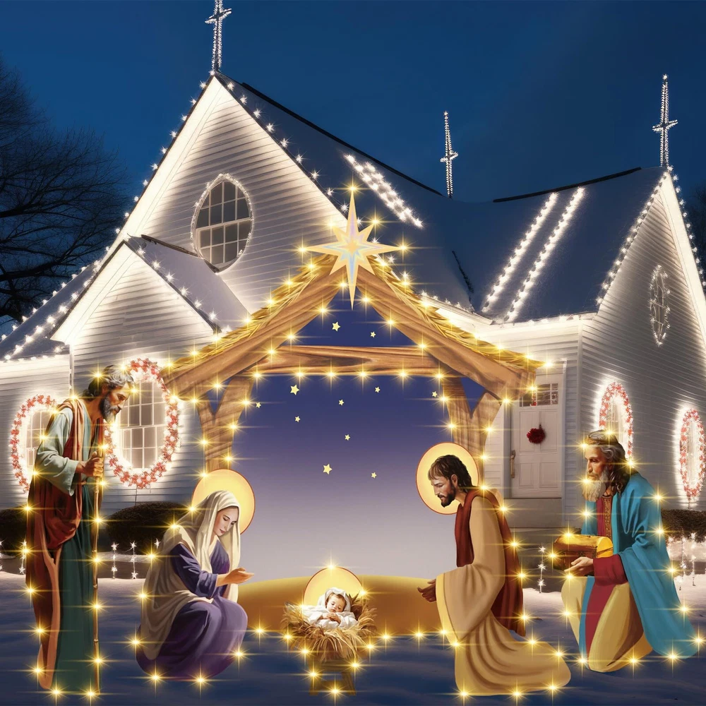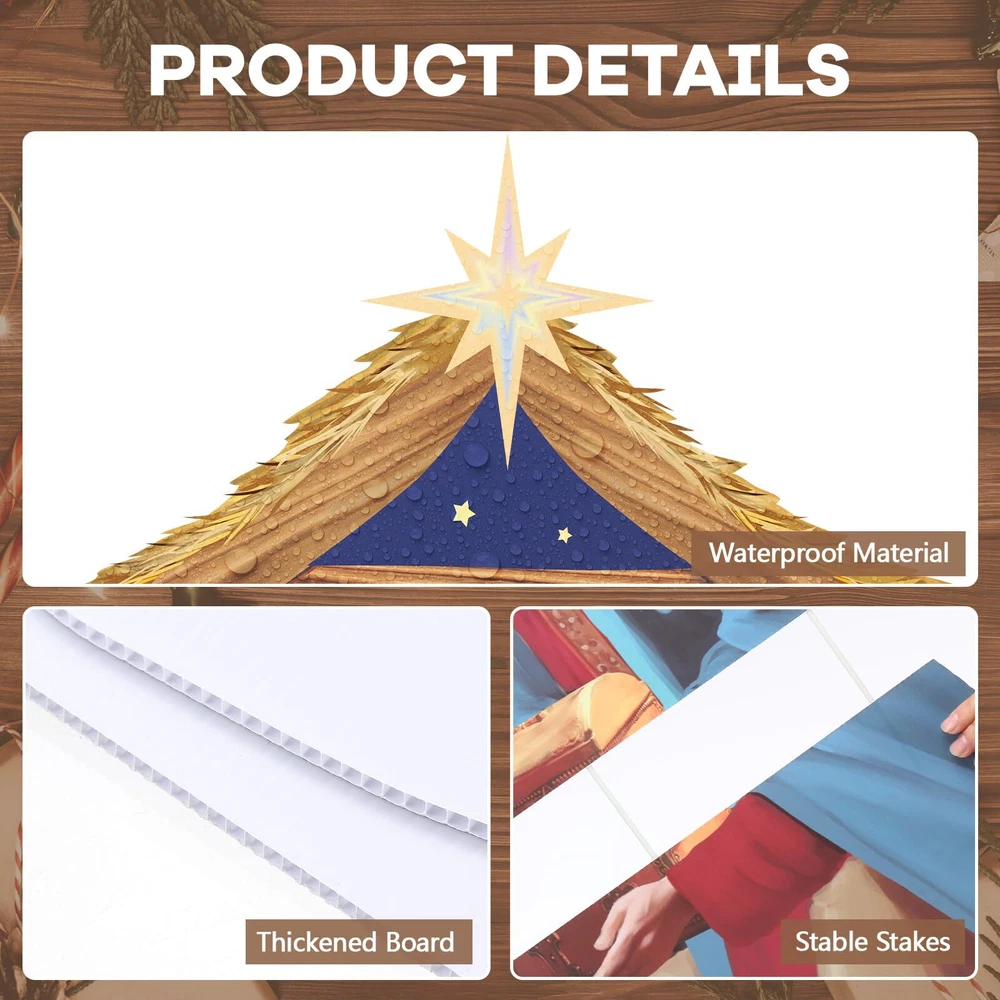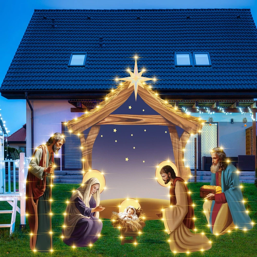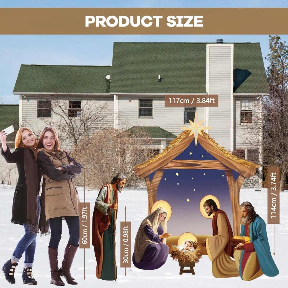 Features: The set includes a stable manger, realistic Jesus, Mary, and wise men. Each character expresses their joy at the arrival of a new life. This set also includes beautiful decorative lights, making this decoration shine beautifully at night. This oversized nativity scene outdoor is made from quality durable materials to ensure the quality and durability of the decorations. Our decorations are handmade, each piece is carefully crafted with good detail to better showcase the nativity scene. Specifications: Material: hollow board Color: multicolor Size: Nativity scenes: about 117 x 114 cm/ 3.84 ft x 3.74 ft Wise men: about 60 x 30 cm/ 1.97 ft x 0.98 ft Light strings: 5 meters and 3 meters long Package includes: 1 x Nativity scenes 2 x Wise men 3 x Light strings Notes: Manual measurement, please allow slight errors on size. The color may exist a slight difference due to different screen displays. Product Includes: Christmas nativity scene outdoor includes 1 manger scene religious signs, 2 wise men and 3 light strings; Classic design full of Christmas atmosphere, providing everything you need for a mesmerizing, illuminated display Large Sizes for Outdoor Use: with the nativity scenes measuring 117 x 114 cm/ 3.84 ft x 3.74 ft and the wise men at 60 x 30 cm/ 1.97 ft x 0.98 ft, this yard nativity scene outdoor adds significant visual appeal to your holiday decor; The length of our light string is 5 meters for 1 pcs and 3 meters for 2 pcs; The product does not include batteries; Please configure AA batteries yourself Reliable Material for Longevity: this nativity scene outdoor large lighted is made from a durable hollow board material, ensuring longevity; Nice for those seeking a stable and long lasting nativity set for Christmas outdoor decor Easy Assembly Outdoor Decor: this large outdoor nativity set for yard is designed for simply assembly, making it an easy addition to your Christmas outdoor decor; Once you set it up, it's sure to be an attention grabber for passersby Outstanding Outdoor Nativity Set: this nativity set for Christmas outdoor decor meets the needs of customers who want a durable, and visually stunning accessory; With easy assembly, impressive size, it's easy to enhance the holiday spirit