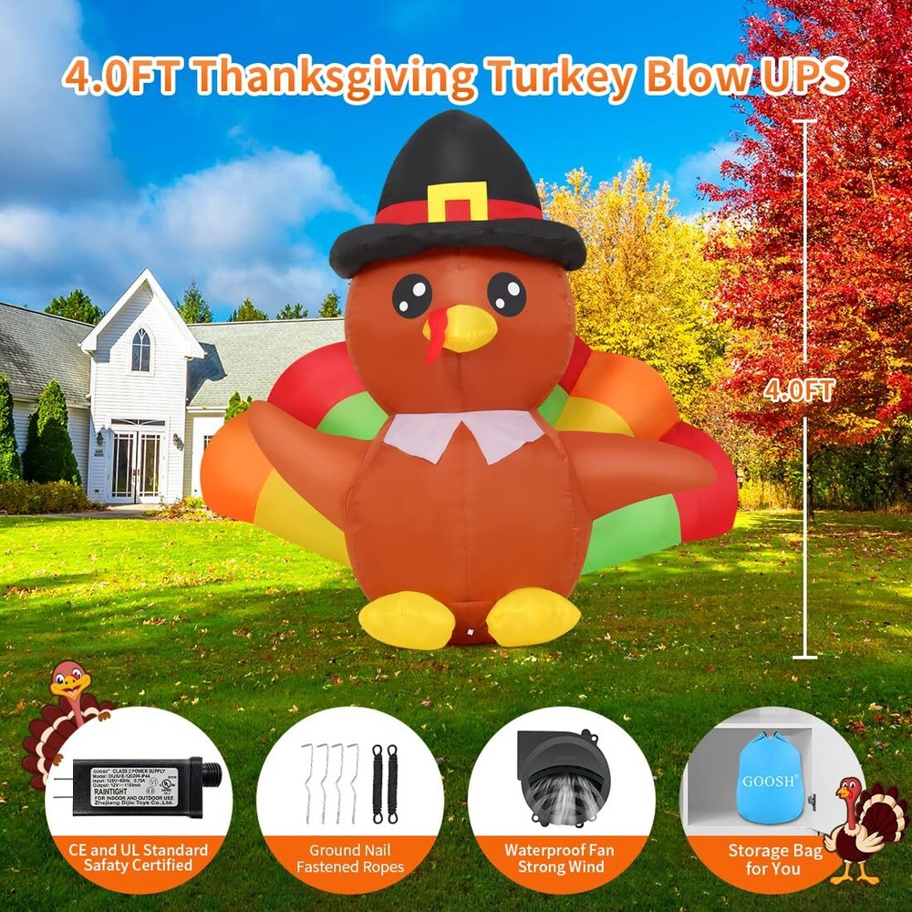 Baby Turkeys Inflatable: Embrace the heartwarming spirit of Thanksgiving with our 4 FT long Thanksgiving inflatables turkey, colorful tail symbols the harvest season. This adorable inflatable turkey is a great way to say "Happy Thanksgiving" to neighbors and guests Easy to Set: This thanksgiving inflatable effortlessly fills with air in no time, thanks to its built-in waterproof and strong air blower. Simply plug it in and watch as blow up turkey inflatable inflates to a fun and impressive height. The CE and UL standard safety-certified adapter with a 10 FT power cord Bright LED Lights: Blow up turkey inflatable includes 4 built-in LED lights, perfect for night display. Set the inflatable thanksgiving decorations out in your front yard to complement a fall scene for the holidays and inspire thanksgiving cheer for anyone driving through your neighborhood Package Includes: 1*blower,1*storage bag,4*stakes and 2*ropes. No worries any more about if the turkey inflatable outdoor decoration might fly away by the wind or not. Thanksgiving inflatables outdoor decorations is perfect for both indoor and outdoor use, spreading joy and holiday cheer wherever it's placed Happy Thanksgiving for You: inflatable turkey outdoor comes with everything you need for a glowing nighttime display that will be the talk of the neighborhood! Outdoor thanksgiving decorations would be ideal for Thanksgiving event decoration, Holiday blow-ups, Thanksgiving night event, Fall Thanksgiving prop, classroom decorations and more