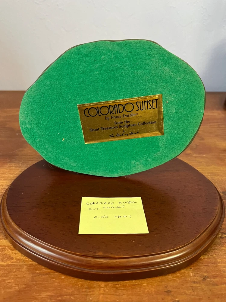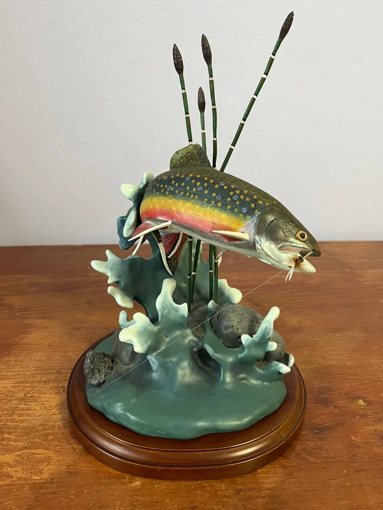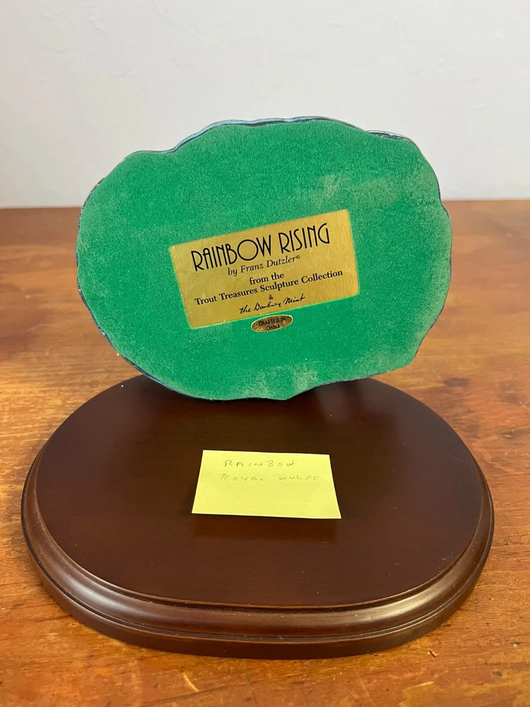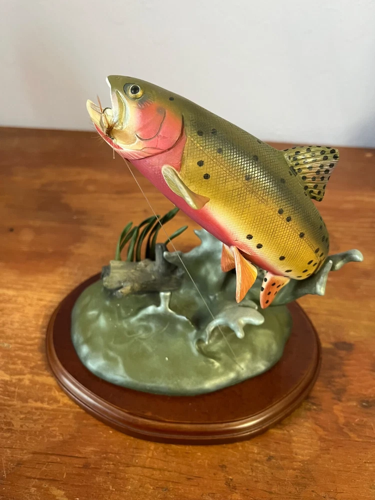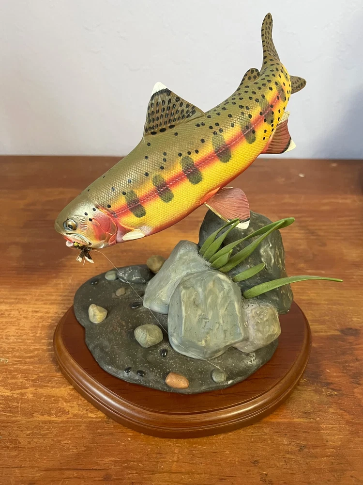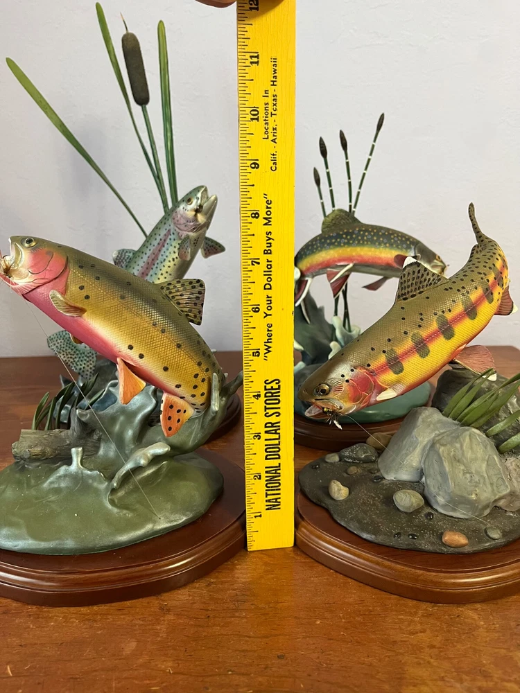 Unused sculptures from "Trout Treasure Sculpture Collection" by Franz Dutzler from The Danbury Mint. Any blemishes are in photos. Each sculpture have its own wood base shaped specifically for each sculpture. The four fish in the collection include: - Rainbow Rising (rainbow trout with royal wolff fly) - Golden Treasure (golden trout with mcginty fly) - Colorado Sunset (Colorado river with a cut throat, pink lady fly) - Brook Jewel (brook trout with royal coachman fly)