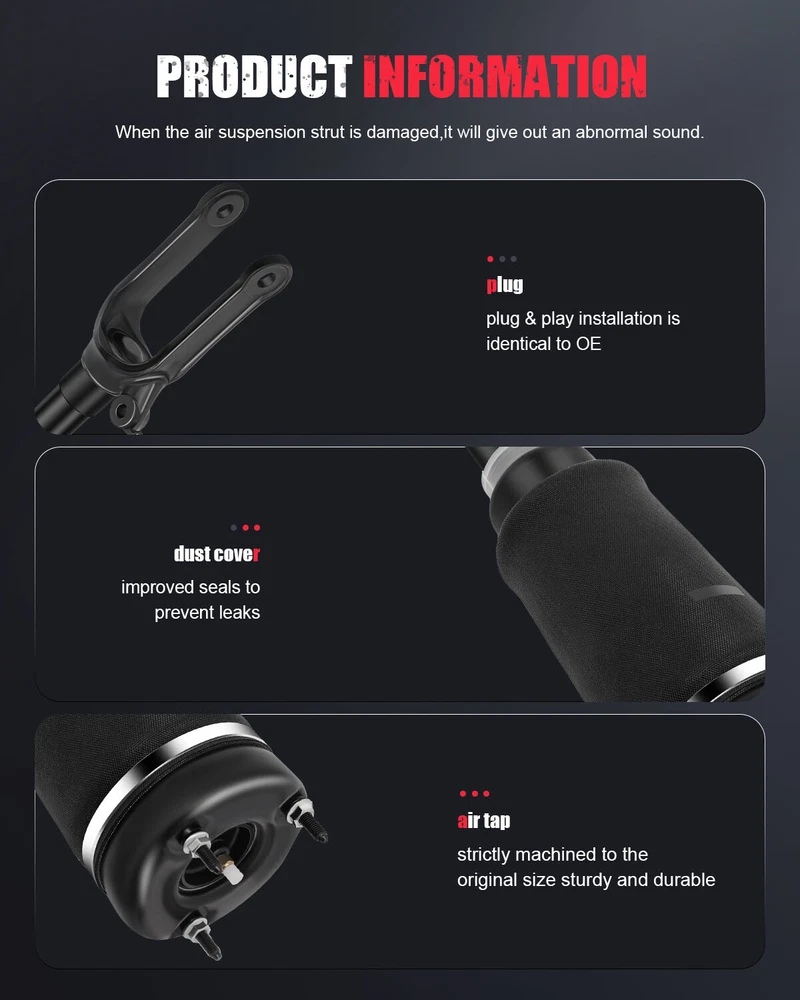 Notes: Please double confim the compatibility as well as the OEM number before purchasing. It is highly recommended that air shocks struts be replaced in sets Instruction is not included. Professional installation is recommended Pre-assembled and ready to install! No special tools required! 4PC Front Air Suspension Strut Shocks & Rear Spring bags For Mercedes W164 ML500 GL450 Vehicle Fitment Information 4* Front Suspension Shock Strut & Rear Spring For Mercedes-Benz GL/M-Class X164 Notes: Please double confim the compatibility as well as the OEM number before purchasing. It is highly recommended that air shocks struts be replaced in sets Instruction is not included. Professional installation is recommended Pre-assembled and ready to install! No special tools required! 4PC Front Air Suspension Strut Shocks & Rear Spring bags For Mercedes W164 ML500 GL450 Vehicle Fitment Information Mercedes-Benz GL-Class GL320 Bluetec 4Matic Sport Utility 4-Door 3.0L 2009 GL320 CDI Sport Utility 4-Door 3.0L 2007-2008 GL350 Bluetec 4Matic Sport Utility 4-Door 3.0L 2010-2012 GL450 Base Sport Utility 4-Door 4.6L 2007-2012 GL450 Base Sport Utility 4-Door 4.7L 2007-2009 GL550 Base Sport Utility 4-Door 5.5L 2008-2011 Mercedes-Benz M-Class ML320 CDI Sport Utility 4-Door 3.0L 2007-2008 ML350 4Matic Sport Utility 4-Door 3.5L 2006-2011 ML350 Base Sport Utility 4-Door 3.5L 2006-2007 2009-2011 ML350 Bluetec 4Matic Sport Utility 4-Door 3.0L 2010-2011 ML350 Introduction Sport Utility 4-Door 3.5L 2006 ML350 Lujo Sport Utility 4-Door 3.5L 2008-2009 ML350 Premium Sport Utility 4-Door 3.5L 2006 ML350 Sport AMG Sport Utility 4-Door 3.5L 2010-2011 ML350 Sport AMG Sport Utility 4-Door 5.5L 2010-2011 ML450 Hybrid 4Matic Sport Utility 4-Door 3.5L 2010-2011 ML500 Base Sport Utility 4-Door 5.0L 2005-2007 ML500 Introduction Sport Utility 4-Door 5.0L 2006 ML500 Premium Sport Utility 4-Door 5.0L 2006 ML500 Special Edition Sport Utility 4-Door 5.0L 2005 ML550 Base Sport Utility 4-Door 2008-2011 OEM Part Number Front Air Suspension Strut : 1643204513,1643206113 Rear Air Suspension Spring : 1643200225,1643200425,1643200625,1643200725 1643200825,1643200925,1643201025,1663200325,1663200625 Item Specifications: Improves Ride & Handling ,Guaranteed Exact Fit for easy installation 100% BRAND NEW, premium ISO/TS 16949 quality - tested to meet or exceed OEM specifications Our air suspension struts replace the original air strut of your vehicle and offer you maximum ride comfort with high durability. Security, accuracy and quality of the product match the original part. Our air struts are made of high-quality materials and are covered by a 1-year limited warranty and a 30-day money-back Or Replacement guarantee. Each air suspension strut comes complete with air spring and shock absorber as well as the new electromagnetic control valve. All strut modules are new, high-performance parts. Our air struts shocks are designed for superior ride quality by adjusting quickly to different road and vehicle conditions, while offering ultimate safety and functionality. Item Specifics Placement on Vehicle Left Right Front Rear Type Air Suspension Compressor Pump Fitment Type Direct Replacement Part Type Shock & Spring Assembly Adjustable Yes Metal Fitting Connection Design Standard Hose Thread Upper Mount Type Stud Lower Mount Type Base Cup Surface Finish High Quality Drive Layout Front Engine RWD & 4WD Platform X164 W164 Custom Bundle Yes Material Iron Aluminium Alloy Rubber Quantity 4PCS Brand Unbranded Payment PayPal preferred. Payments are expected within 7 days after the last winning auction is closed; Otherwise Unpaid Item Dispute will be filed with eBay. Shipping Product will be shipped within 2 business days after full payment is received and verified. Delivery Time is about 3-7 business days to most of countries. All domestic orders will be shipped via USPS, UPS or FedEx from our US warehouse and usually arrives to your door in about 3-5 business days. We ship the package to your shipping address in eBay instead of the one in PayPal. Please tell us your shipping address if it is different from the one in eBay. The tracking number will be given for the customer to check the shipping status online (registered or faster service only). We are not responsible for any wrong or undeliverable addresses. Please verify and update your shipping address on eBay during checkout. Returns WARNING : Cancer and Reproductive Harm - www.P65Warnings.ca.gov. We stand behind every product we sell. All of our brand new items come with a 60-Days money-back guarantee. We define the item as defective only if it doesn't function as described. It is the buyer's responsibility to understand the item description before bidding. We will replace the defective items, provided that they are in stock within the warranty period posted with the listing and the buyer return the original item and pay for the S&H cost for the replacement. We will refund the purchase price if the replacement is not available or buyer prefers a refund and send the original item back at his/her own cost. Shipping & handling cost are not refundable. Man-made damage by abuse or wrong operation is not covered by this warranty. No product liability insurance is assumed. Contact Us We are dedicated to provide high quality products and satisfied customer service to our sincerely customers, so if there's any questions or problems with our products or service, feel free to contact us please. Shop Category Store Home Suspension Parts ◈ Air Strut Assembly ◈ Air Spring ◈ Air Suspension Compressor ◈ Solenoid Valve Block ◈ Truck & Trailer Springs Truck & Trailer Springs Vehicles ◈ Audi ◈ Bentley ◈ BMW ◈ Buick ◈ Cadillac ◈ Chevrolet ◈ Citroen ◈ Dodge ◈ Ford ◈ GMC ◈ Hyundai ◈ Infiniti ◈ Isuzu ◈ Jaguar ◈ Jeep ◈ Land Rover ◈ Lexus ◈ Lincoln ◈ Mercedes-Benz ◈ Mercury ◈ Oldsmobile ◈ Porsche ◈ Saab ◈ Toyota ◈ Volkswagen Suspension Kits Air suspension valves solenoid S