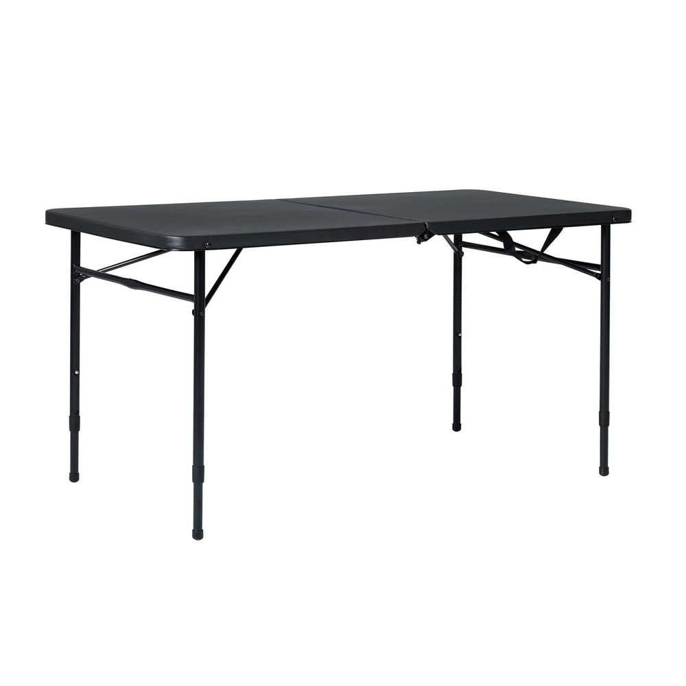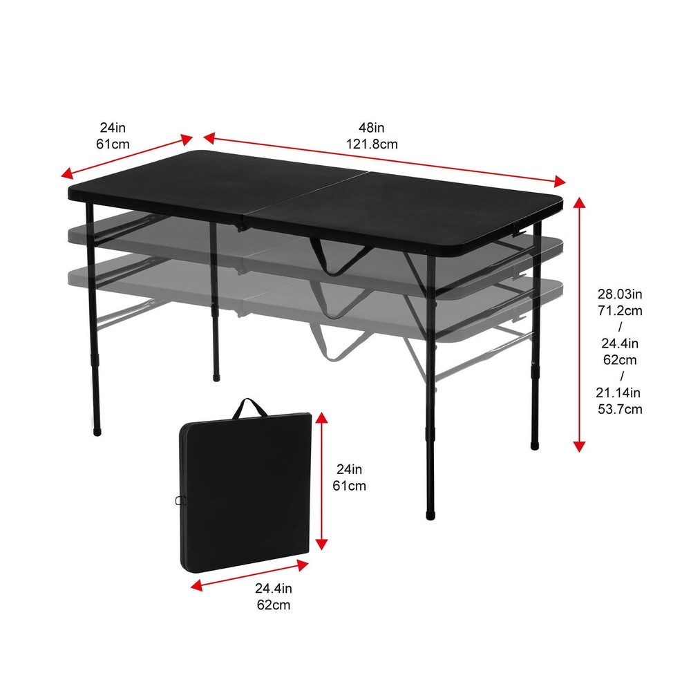 You may also like Folding Card Table Space Saving Upholstered Easy Storage Indoor Outdoor Durable 47.46 USD 49.96 USD Free shipping 5% off Console Table Entryway Display Storage Shelf Accent Wooden Rectangle Sofa Desk 72.99 USD 76.83 USD Free shipping 5% off Corner Side Table Folding Round Table 31'' Portable Wood Lightweight Modern New 53.32 USD 56.13 USD Free shipping 5% off C Shape Metal End Table C Table Side Table Space Saving Home Office Use Black US 40.99 USD 43.15 USD Free shipping 5% off Wood Rectangle Coffee Table Sturdy Living Room Sofa Side Den Office Furniture US 41.52 USD 43.71 USD Free shipping 5% off 2 Pack Adjustable Height Personal Folding Table Side Table for Living Room Patio 77.18 USD 81.24 USD Free shipping 5% off C Shaped Accent Table Snack Side Table Living Room Bedroom Couch Laptop Stand US 44.44 USD 46.78 USD Free shipping 5% off Modern Hairpin Rectangle Coffee Table Indoor Livingroom Study Decor Furniture US 65.31 USD 68.75 USD Free shipping 5% off Round Coffee Table W/ Glass Top Metal Base Indoor Living Room Indoor Furniture 117.56 USD 123.75 USD Free shipping 5% off Modern Rectangle Lift Top Coffee Table Hidden Storage Shelf Display Living Room 121.12 USD 127.5 USD Free shipping 5% off Square Side Table Wood Living Room Furniture w/ Storage Rustic Weathered Oak US 68.88 USD 72.5 USD Free shipping 5% off Metal Round End Table W/ 2 Shelves Contemporary Accent Table Indoor Storage New 120.74 USD 127.1 USD Free shipping 5% off Provide all of the table spaces that you need in all kinds of settings with the Mainstays 4' Fold-in-Half Adjustable Table in Rich Black. This versatile rectangular table is sturdy and durable, made with reliable materials, and folds for easy storage and transportation. When you're finished using it, just fold in the metal legs, fold the table in half, and your new compact table is ready for transport! Its classic black color is sure to fit in at any gathering in any setting, and its spacious expanded 48" long table-top is ideal for holding a wide variety of foods, crafts, or whatever items you are working with! It's great for everyday use both indoor and outdoor, as a serving table, craft supply table, outdoor meal table, or for whatever purposes you may need. The plastic tabletop is easy to clean with no fuss just wipe it down with a damp cloth, and it will look as good as new! The carrying handle makes it perfect for taking on the go, for outdoor barbecues, game nights, school activities, parties, or tailgating events. The table comfortably seats 4 adults, so all of your friends and family can be included. Mainstays 4 Foot Fold-in-Half Adjustable Indoor Outdoor Table, Rich Black Product Dimension:48" W x 24" D x 21.14" - 24.4" - 28.03" H Comfortably seats 4 adults Easily folds in half for convenient storage Classic black color coordinates with almost any decor! Includes a built-in carry handle, for easy transportation Rubber stoppers on the legs for added grip on floor surfaces Appropriate for use indoors or outdoors Easy-to-clean resin surface Strong durable powder-coated metal construction Number Of Pieces: 1 x folding table You may also like 33in Tall Polystone Vase Champagne Flute Shape Mirror Mosaic Home Décor New 156.74 USD 164.99 USD Free shipping 5% off Upholstered Queen Bed W/ Nailhead Trim Solid Wood Frame Assembly Required New 165.06 USD 173.75 USD Free shipping 5% off Ultra Soft Toilet Paper 18 Mega XL Rolls 1 Ply Absorbent Smooth Tear Septic Safe 35.06 USD 36.91 USD Free shipping 5% off Fast Spincast Fishing Reel 8+1 Bearings 5.1:1 Gear Ratio Durable Easy-to-Use 129.51 USD 136.33 USD Free shipping 5% off 8 Inch Medium Firm Memory Foam Mattress Twin Gel Infused Sleep in a Box New 118.51 USD 124.75 USD Free shipping 5% off Modern Shoe Cabinet Storage Organizer Entryway Hallway Mudroom 2 Doors 12 Pairs 122.3 USD 128.74 USD Free shipping 5% off Full-Length 13x49 Rectangular White Mirror Hang Over A Door Bedroom Home 12.32 USD 12.97 USD Free shipping 5% off Digital Alarm Clock Battery Backup Large Display Adjustable Volume Bedside Clock 19.12 USD 20.13 USD Free shipping 5% off Vintage Gumball Machine Coin Bank Candy Dispenser Large Capacity Kids Arcade New 61.74 USD 64.99 USD Free shipping 5% off Heavy Duty Multi-Surface Duster Refills 4 Pack Lavender Dust Trap Lock Allergens 47.12 USD 49.6 USD Free shipping 5% off Adorable Ultrasonic Cool Mist Humidifier Kids Room Relief 24 Hour Run Time New 47.1 USD 49.58 USD Free shipping 5% off Modern Buffet Sideboard Storage Cabinet 4 Door MDF Wooden Console Table New 139.89 USD 147.25 USD Free shipping 5% off