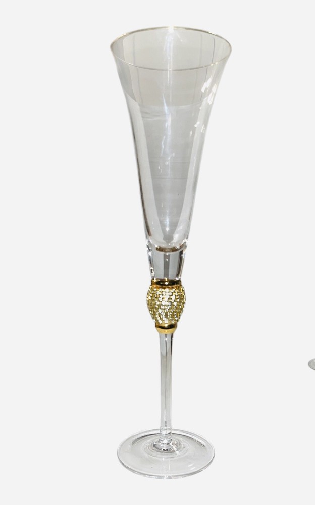 The set includes four Pav Champagne Flutes with a stunning gold rim, each standing at 11 inches tall. These elegant flutes are designed for a bridal shower or any special occasion, adding a touch of sophistication to your celebrations. Made of clear glass with a pave design, these flutes are perfect for serving champagne to a party of four. Ideal for toasting and raising a glass in style, this set brings a touch of luxury to your tabletop. Gently used, excellent condition! #61