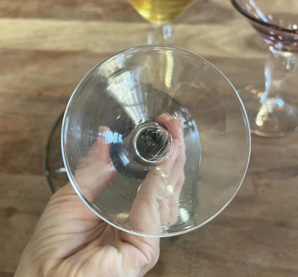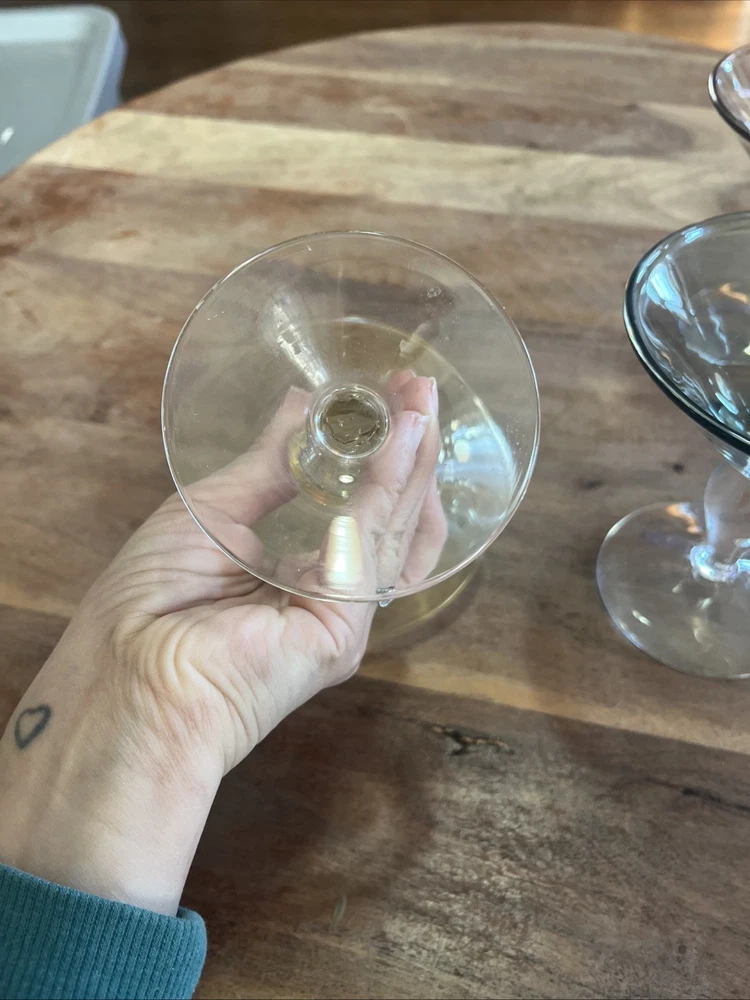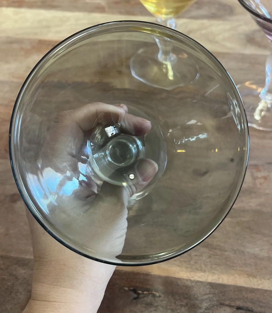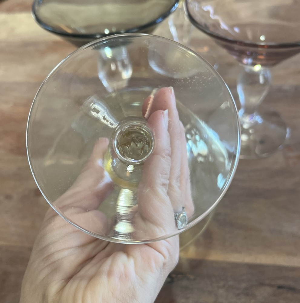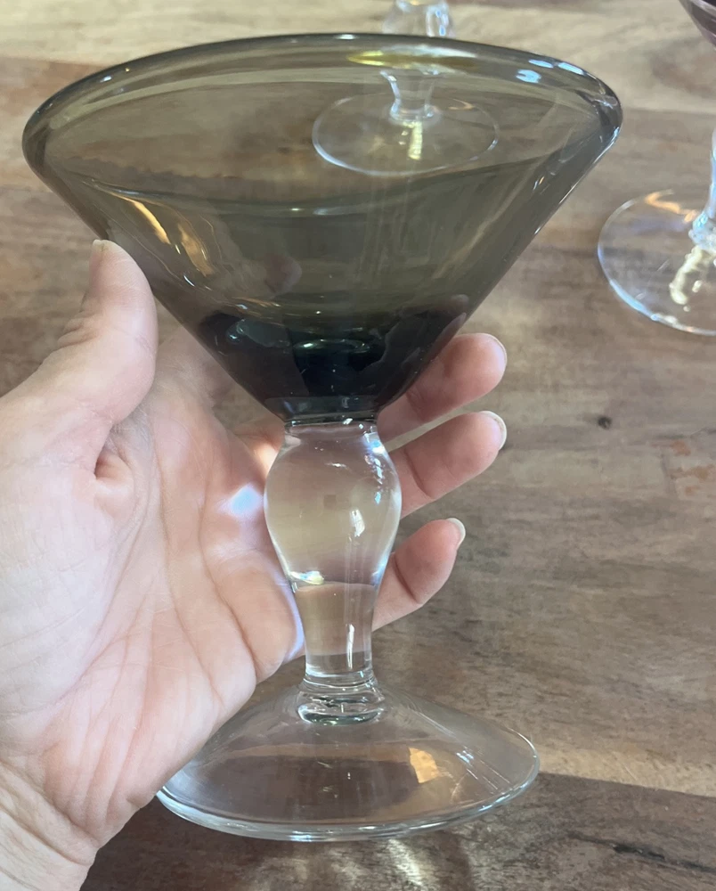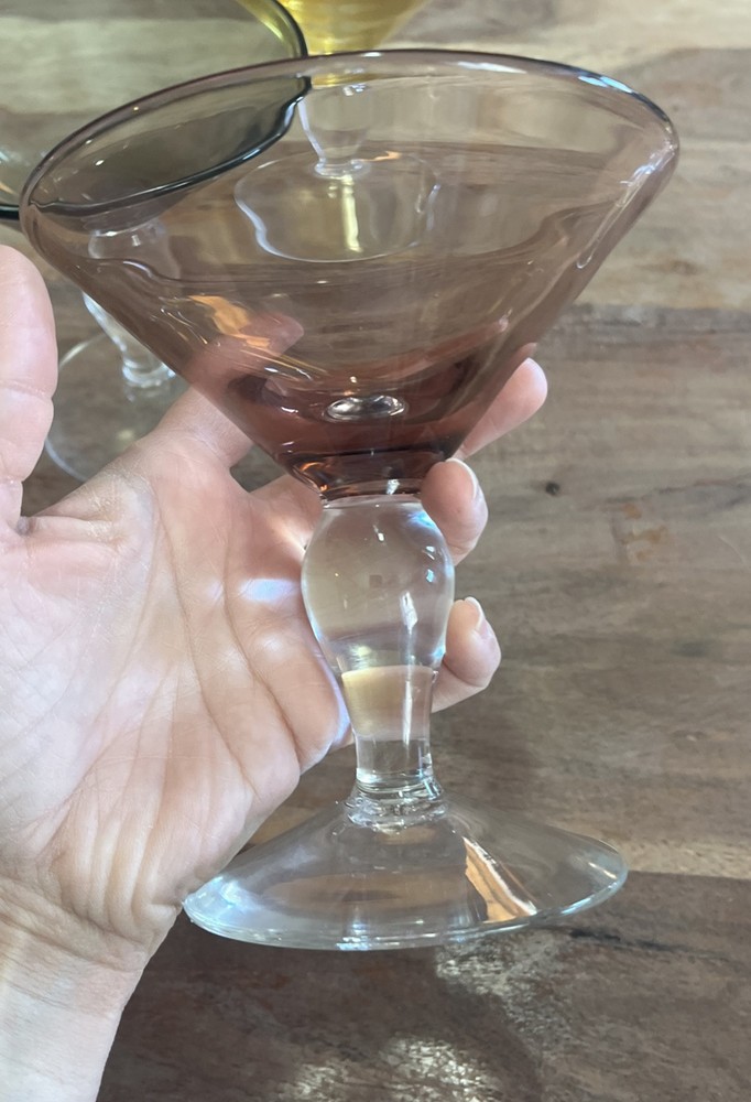 This set of four vintage martini glasses is a must-have for any collector or enthusiast. Each glass features unique hand-blown design, with three glasses in bright yellow and one in deep purple. The glasses are 5.5 inches tall and 5 inches in diameter, perfect for any cocktail. The brand of these glasses is White, and they are made using hand-blown glass production technique. These glasses are perfect for any occasion, and your guests will be impressed with their unique design.