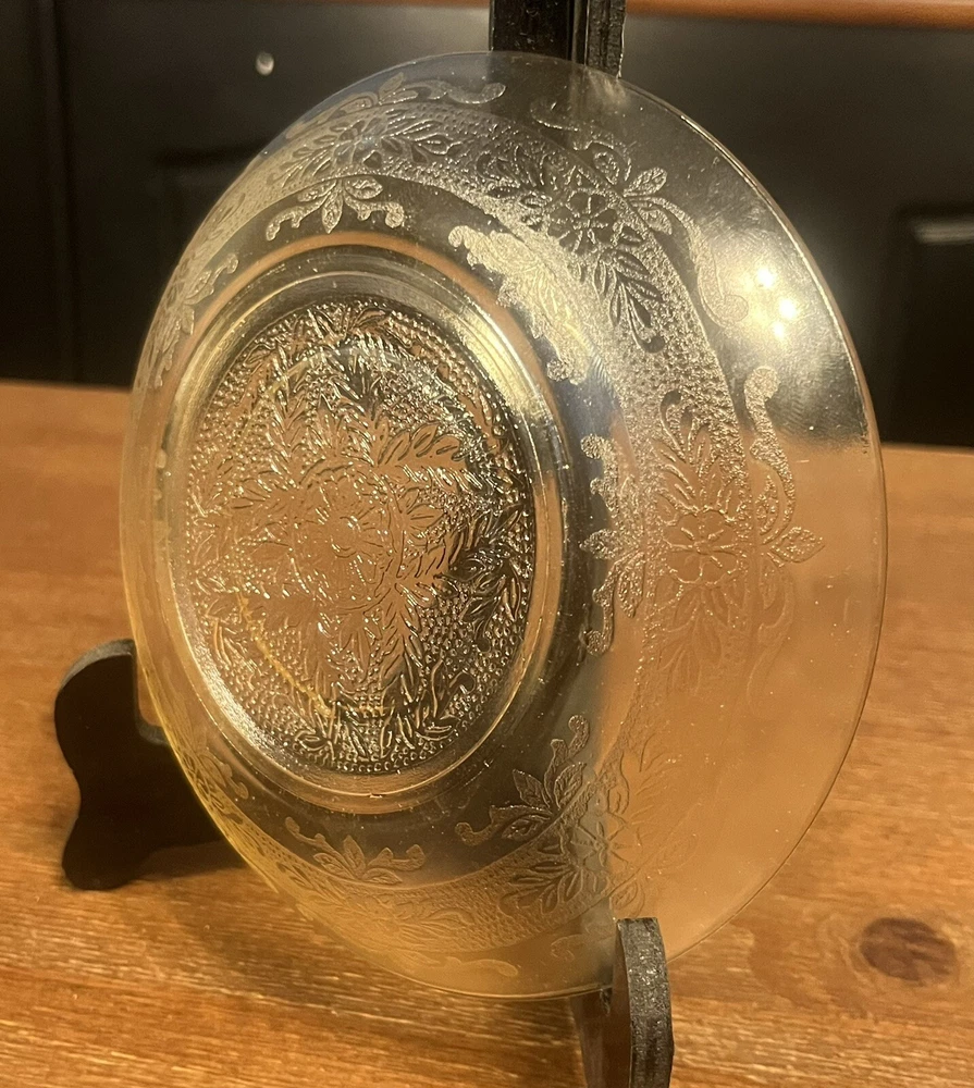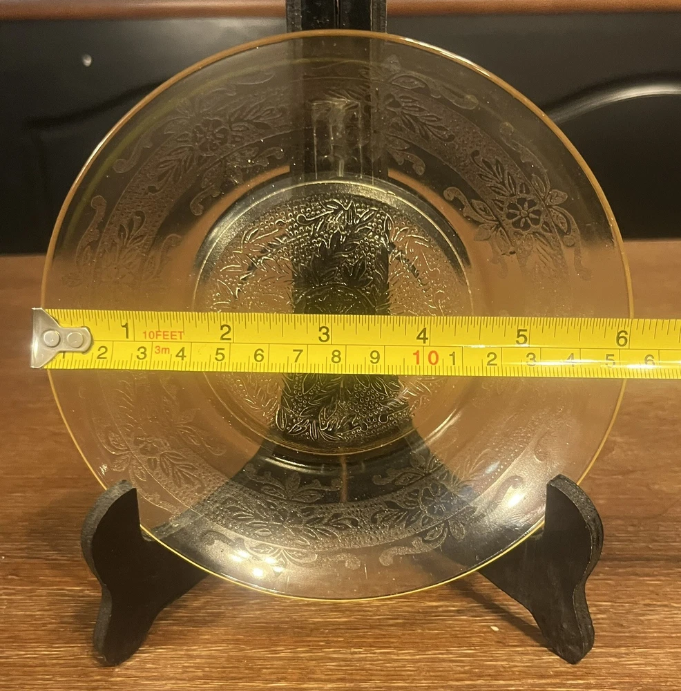 This set of 4 Hazel-Atlas Florentine #2 poppy yellow sherbet plates is a great addition to any collection. The plates measure 6" and feature a round shape with a glossy finish. The decorative Florentine pattern adds a touch of elegance to any table setting.