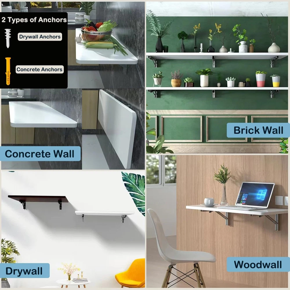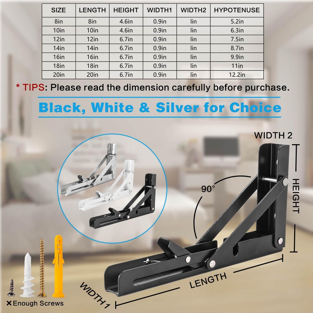√ 4 Pack Sturdy & Heavy Duty Bracket Set: Made of durable Stainless Steel, our folding shelf brackets provide a elegant & graceful surface, which is not easy to scratch, and can resist daily scratches and corrosion, ensuring durability and abrasion resistance. Premium stainless steel, no paint off, more durable. √ Space Saving & -Click Foldable Design: The Folding Brackets Heavy Duty are perfect for DIY jobs around the house, garage & courtyard. Pop it out when you need it and fold it away to save more space when not in used. Make the most of your family space for your garage, kitchen, workshops, backyard, trailer, bedroom, and warehouse. √ Larger Load-bearing Capacity Up to 200 Lb: Triangle structure, holds a great amount of weight, supports up to 200lb/100kg. Perfect for making workstation in garage, folding table hinge for ' study table, bench in backyard, clothes table in laundry room, bookshelf, kitchen shelf, exhibition stand and dining-table in your car. √ Wide Application & Easy Installation: Provide you with more creative home improvement ideas to save most space in your garage, laundry room, kitchen, workshops, boats, backyard, trailer, bedroom, balcony and bathroom. Comes with mounting accessories, premium screws for various walls ,high-quality anchors and professional user manual. √ Various DIY Projects & Multifunctional & Great Service: You can use it to build a foldable bar table on the pony wall, Make a pull-up board on the countertop for extension in motor home, Add a folding shelf to a BBQ grill, Add an extra few fold-out table on each side of the workbench, etc. If you have any quality problems, please feel free to us.
