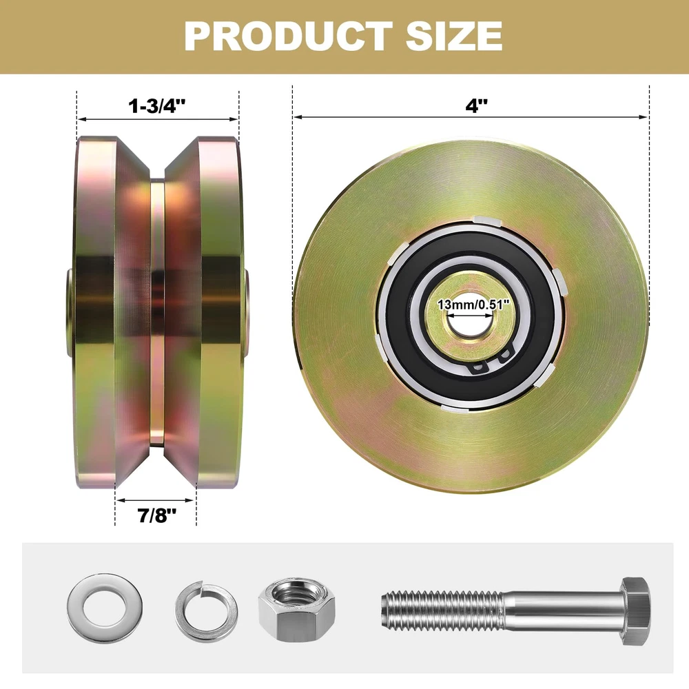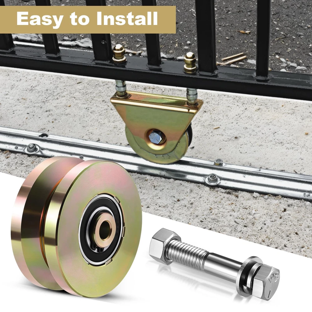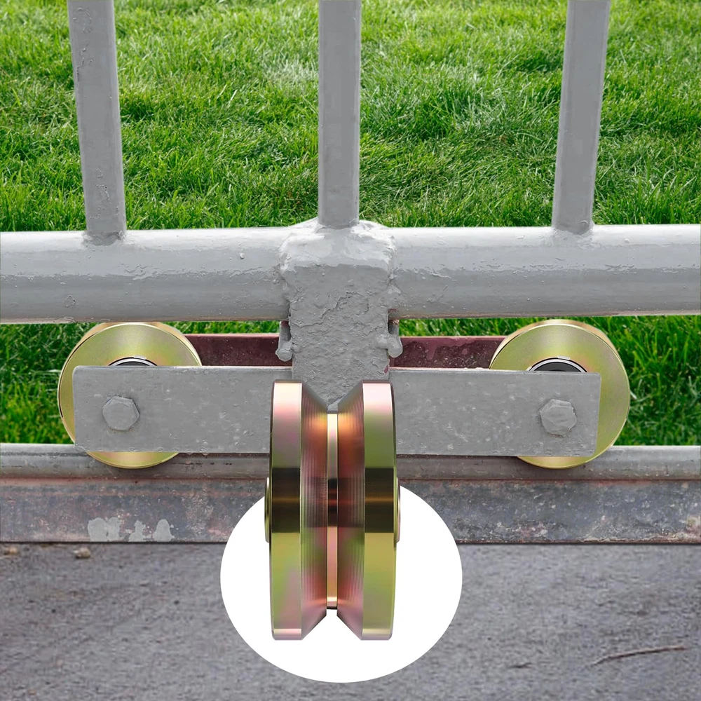 Package Includes:2 pieces 4 inches V groove wheels with 2 pieces M12*85mm screws.Our wheels are heavy duty, sturdy, and corrosion resistant. This gate wheel is about 4 inches in diameter and about 1-3/4" in thickness, the installation aperture of the wheel axle is 0.51 "(13mm),designed to handle heavy duty applications with its impressive 3000 lbs sliding capacity each, ensuring smooth and effortless movement for sliding gates Distinctive Appearance: this V track gate wheel is coated with gold finish with a bright surface, anti corrosion and anti rust, looks nice and with solid support.Material:Made of high quality standard steel AISI 1045(45 # steel) Our sliding gate rollers are usually applied for sliding doors or slide rails, and the bearings are sealed, requiring no maintenance or lubrication, its sturdy construction ensures that it can withstand the toughest conditions, maintaining good performance for years to come Easy Installation: this rolling gate hardware kit comes with a convenient package that includes 2 caster wheels, 2 screws, and washers, providing everything you need for a hassle free installation process.