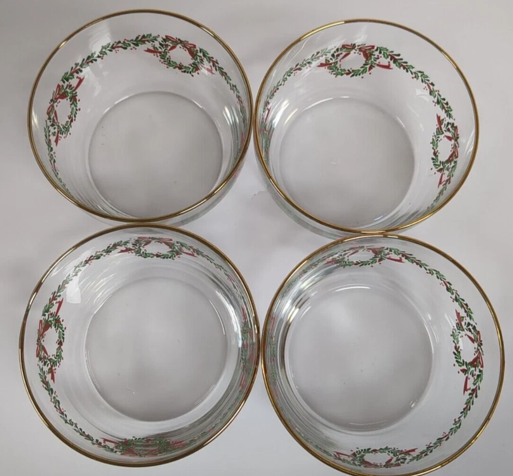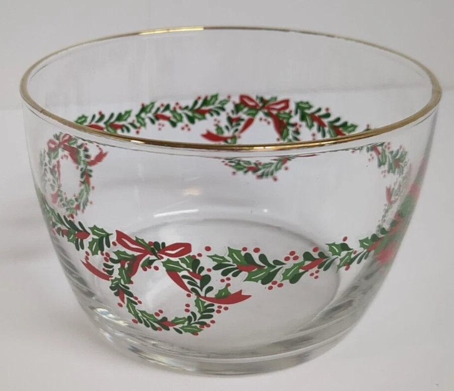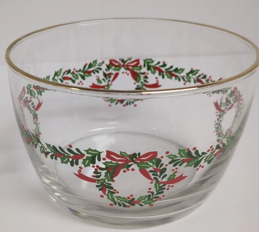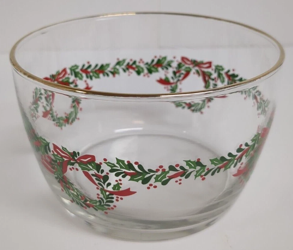 This set of 4 vintage Libbey salad bowls features a festive Holly Berry pattern, making them perfect for a Christmas occasion. The bowls are made of clear glass with red and green accents, showcasing a round shape and a wreath design. These charming bowls are ideal for serving desserts or salads during the holiday season, adding a touch of festive flair to any table setting.