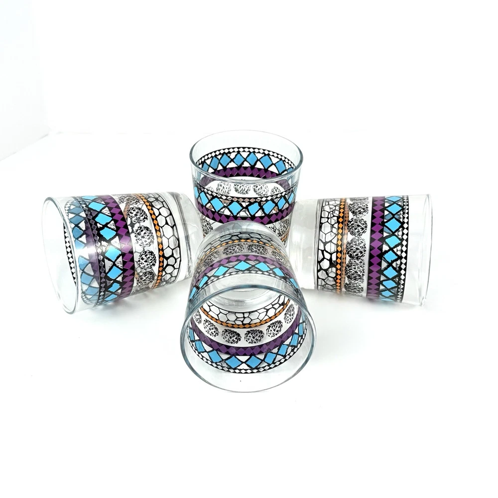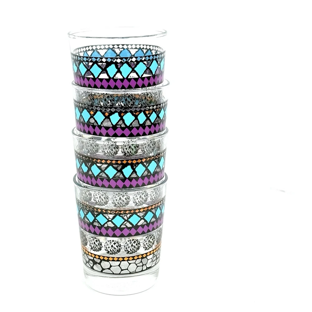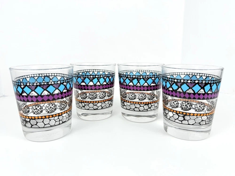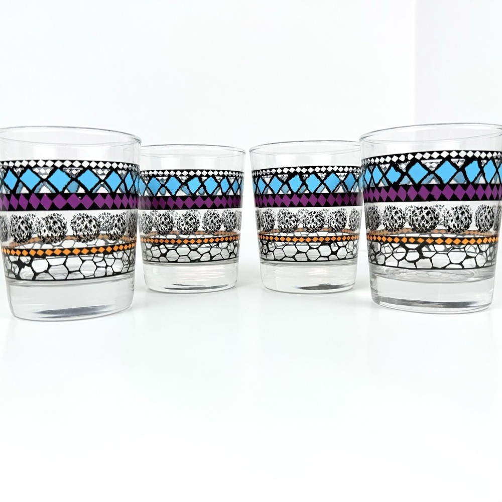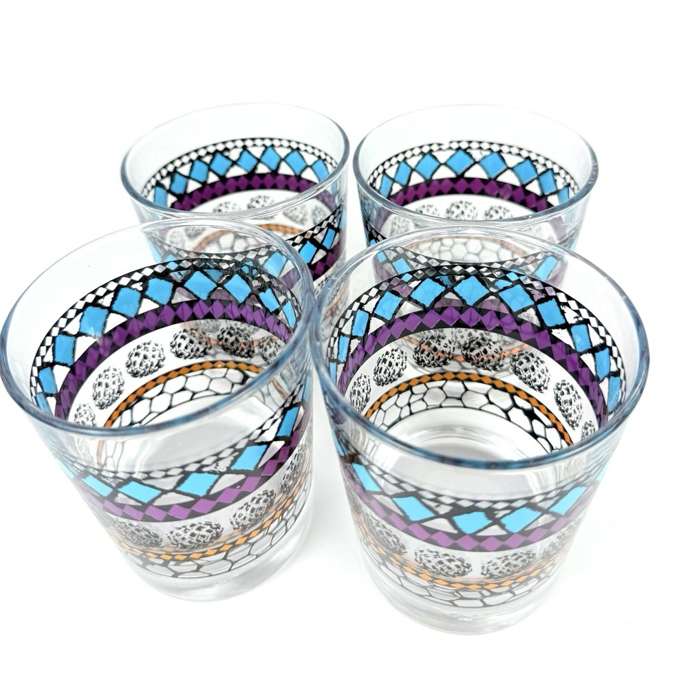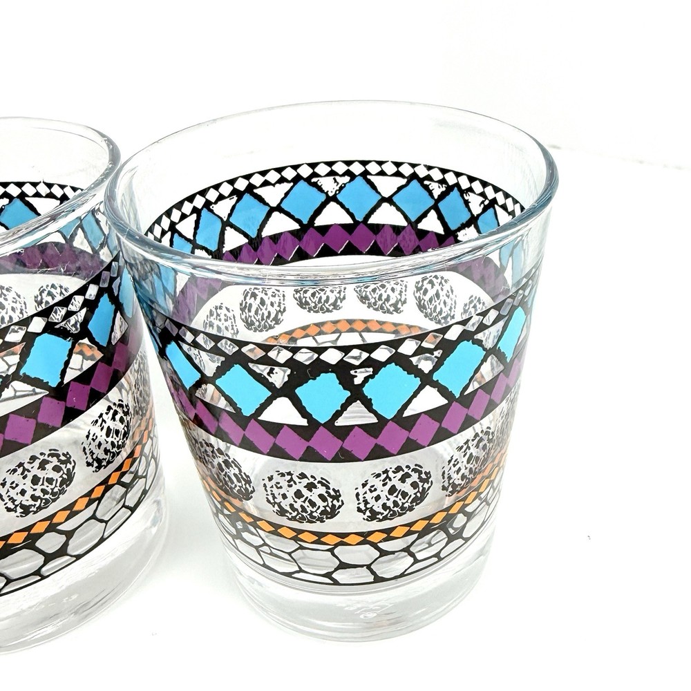 4 IKEA Murkla Cocktail Old-Fashioned Glasses Multicolor Diamond & Dot Bands 8oz 22648 Set of 4 Flat Tumblers/Old-Fashioned Cocktail glasses by IKEA in the discontinued (2013-2021) Murkla pattern. 3 3/4" high, 3 1/8" across, hold 8 oz. Clear glass with a geometric teal, purple, black, and orange band pattern. In excellent condition, no chips, cracks, or wear. Retired glasses from 2015. Let me know what questions you have. Blessings to you!ππ©·ππ€π€ππ©·π